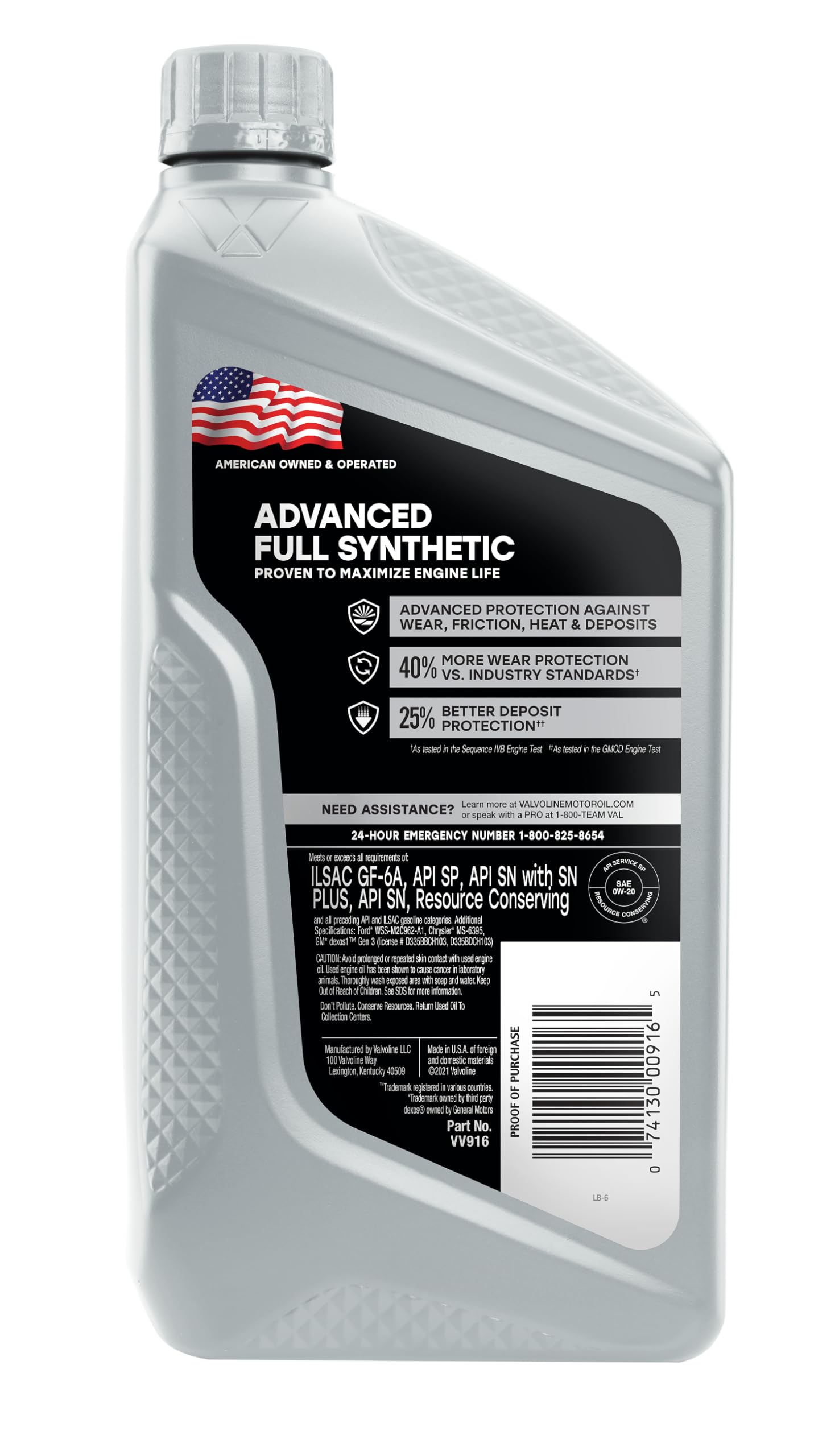 Anything a conventional motor oil can do Valvoline Advanced Full Synthetic can do better. Designed with the highest quality base oils and additives, it delivers 25% better deposit protection and 40% better protection against wear than industry standards. With less wear, you can expect stronger performance, optimal fuel efficiency, and a longer-lasting engine. Driving conditions like short trips or stop-and-go traffic are hard on a vehicle and the car’s engine oil, causing extreme heat and temperature fluctuations inside your motor that can lead to harmful sludge and extra friction. Valvoline Advanced Full Synthetic Motor Oil includes additional boosters to minimize the effects of heat. And for enhanced cold start protection, it flows easily at low temperatures. Step up to one of our best motor oils for superior performance in all types of weather and conditions. GM dexos 1 Gen3 certified and approved in SAE 0W-20 and 5W-30, Valvoline Advanced Full Synthetic Motor Oil provides 24X stronger protection against engine-killing contaminants than the leading full synthetic, keeping your motor running smooth whether it’s a Ford, Toyota, Dodge, Jeep or Honda. Valvoline Advanced Full Synthetic, from the Original Motor Oil brand trusted for more than 150 years.