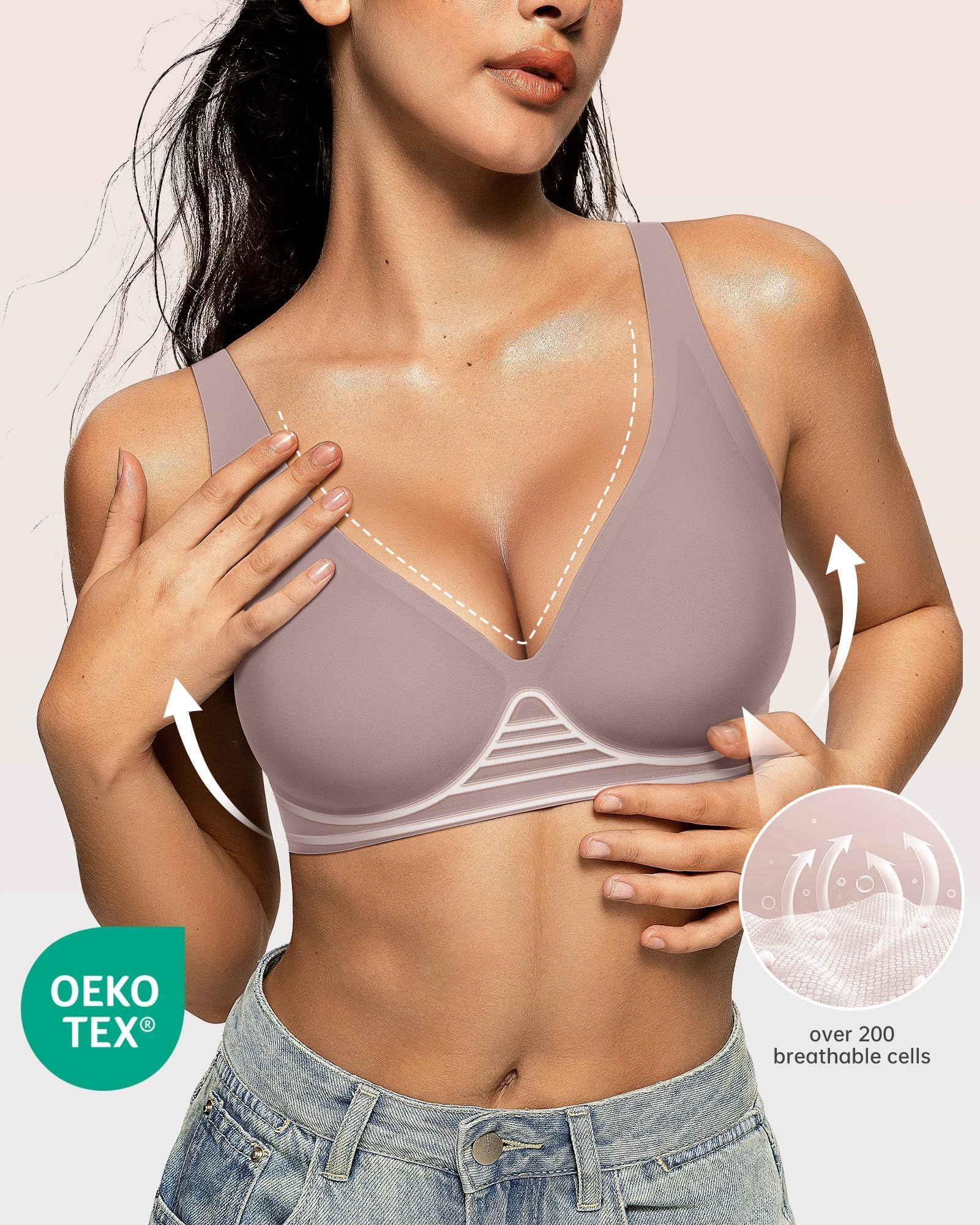 Ultra Soft and Comfortable Bras - These deep V bras with semi-fixed pads are made from high-quality fabric with a delicate texture, super breathable and gentle on the skin, providing a feather-light feeling with zero pressure. The highly stretchy design fits perfectly under your chest curve, effectively preventing the bra from slipping when lift your hands. Each semi-fixed pad has over 200 breathable holes, keeping you cool and comfortable for 24 hours.