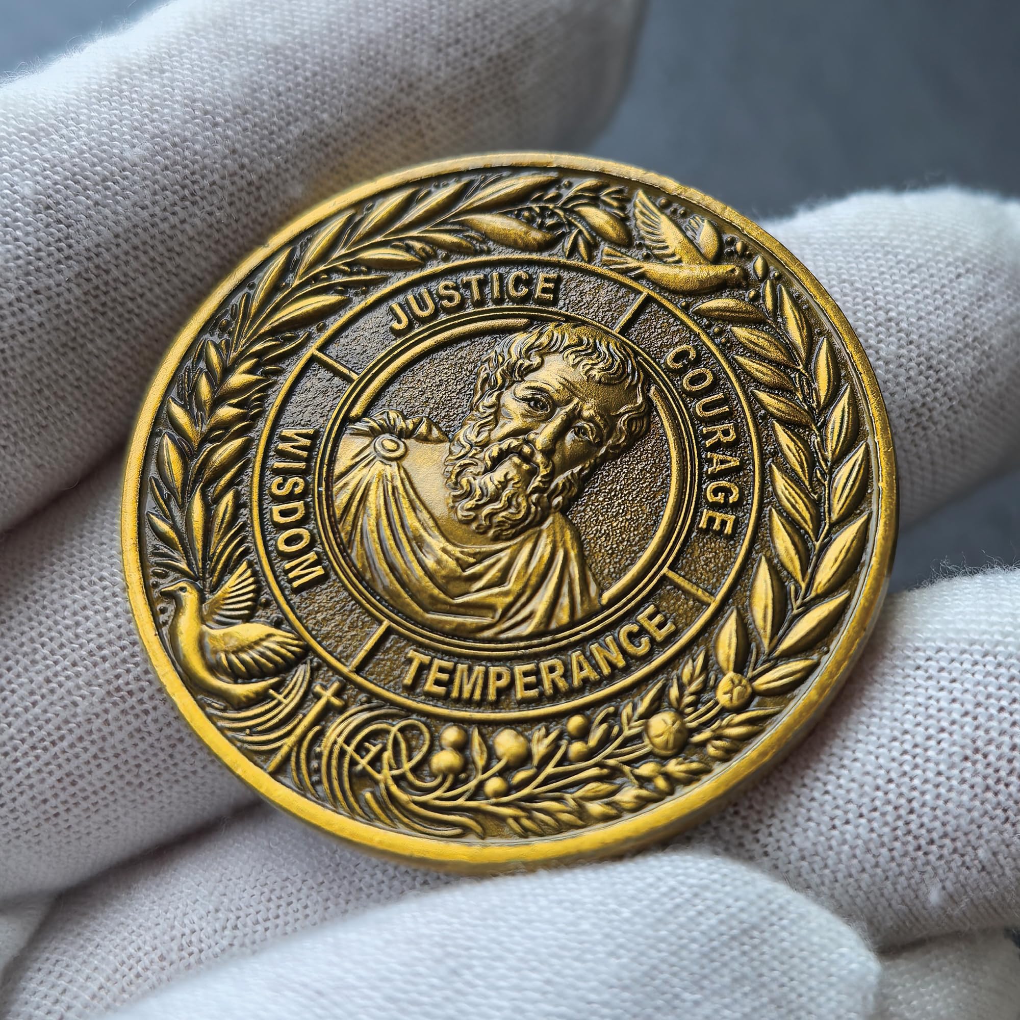 GREEK PHILOSOPHER TRIBUTE DESIGN - Reverse features a detailed relief portrait of a classical Greek philosopher surrounded by laurel wreath, with the four virtues inscribed around the perimeter: JUSTICE, COURAGE, WISDOM, and TEMPERANCE. This homage to Stoic philosophy serves as a daily reminder to live according to these foundational principles of character and ethical living.
