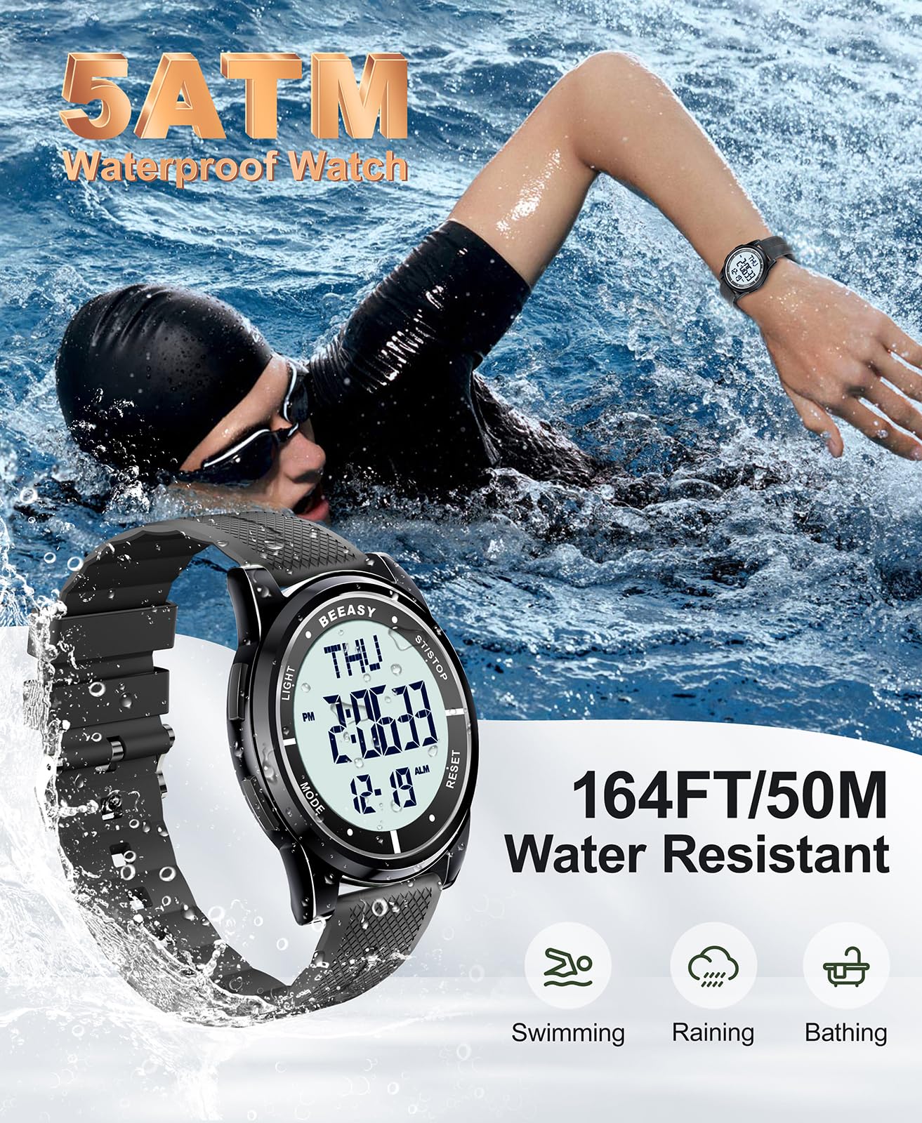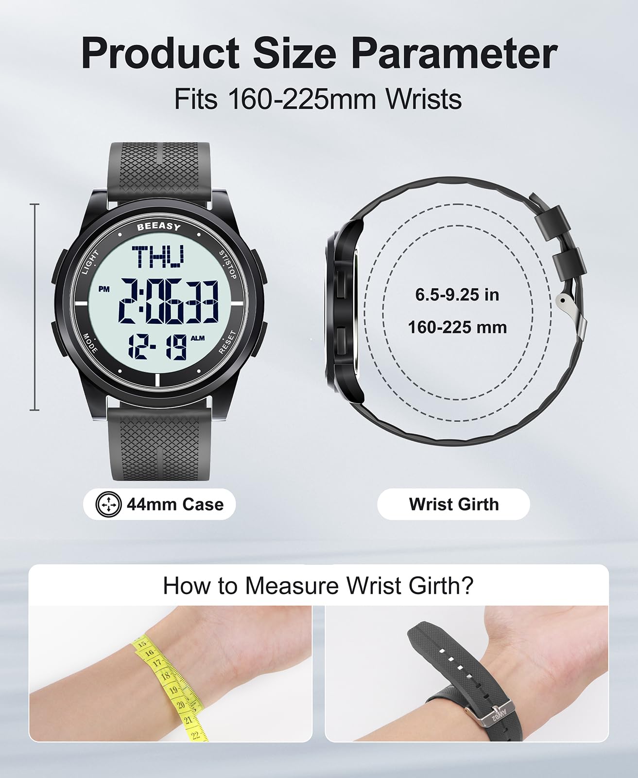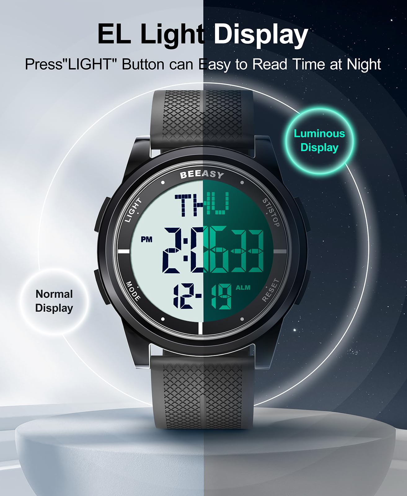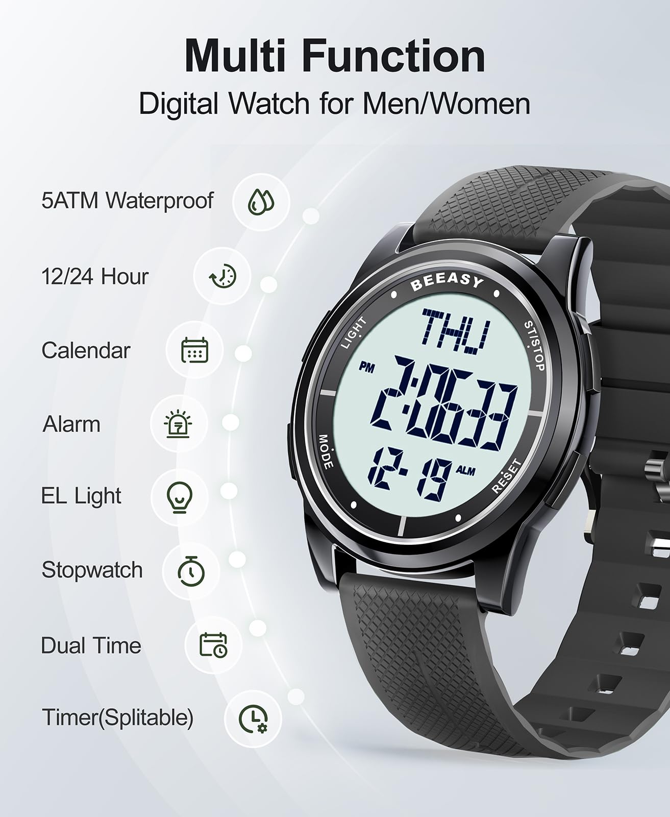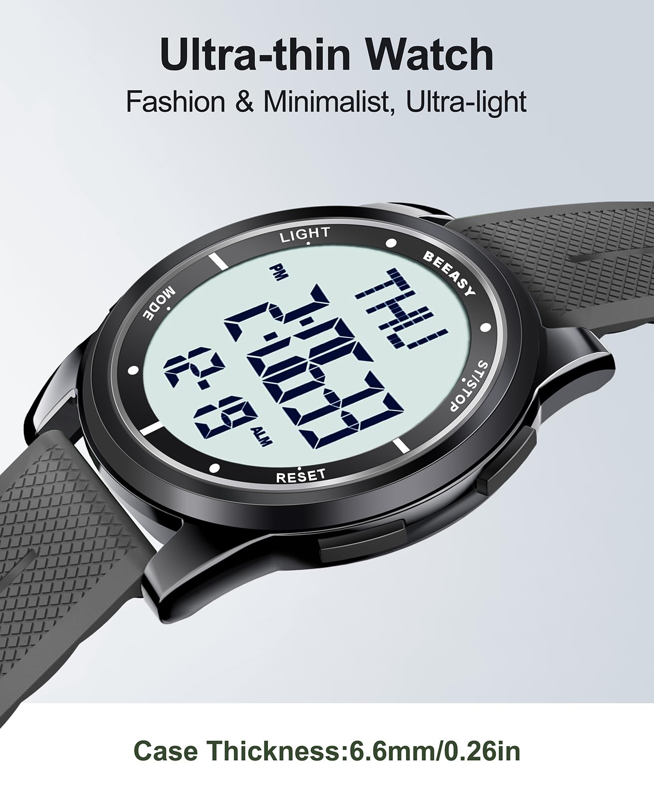 Description Ultra-Thin Digital Watch – Sleek, Waterproof & Multi-Functional Versatile & Stylish Design Designed for both men and women, this ultra-thin (6.6mm) digital watch combines modern minimalism with high functionality. Its sleek case and textured band offer a lightweight, comfortable fit for all-day wear. Crystal-Clear EL Backlight Display Features a wide-angle digital screen with bright EL backlight, ensuring effortless readability day or night. Perfect for low-light conditions, workouts, or travel. 50m Water Resistance – Swim & Shower Safe Built for active lifestyles, this watch is waterproof up to 164ft (50m), making it ideal for swimming, showering, and rainy weather. Smart Multi-Function Features 12/24-hour time format Date & day display Alarm, stopwatch, and countdown timer Dual time zone support (great for travelers) Durable & Comfortable for Everyday Wear The scratch-resistant screen and flexible textured band ensure long-lasting durability, while the ultra-lightweight build keeps it comfortable for work, sports, or travel. Perfect for Active Lifestyles Whether you're swimming, running, traveling, or working, this digital watch keeps you on time with reliable performance and sleek style.