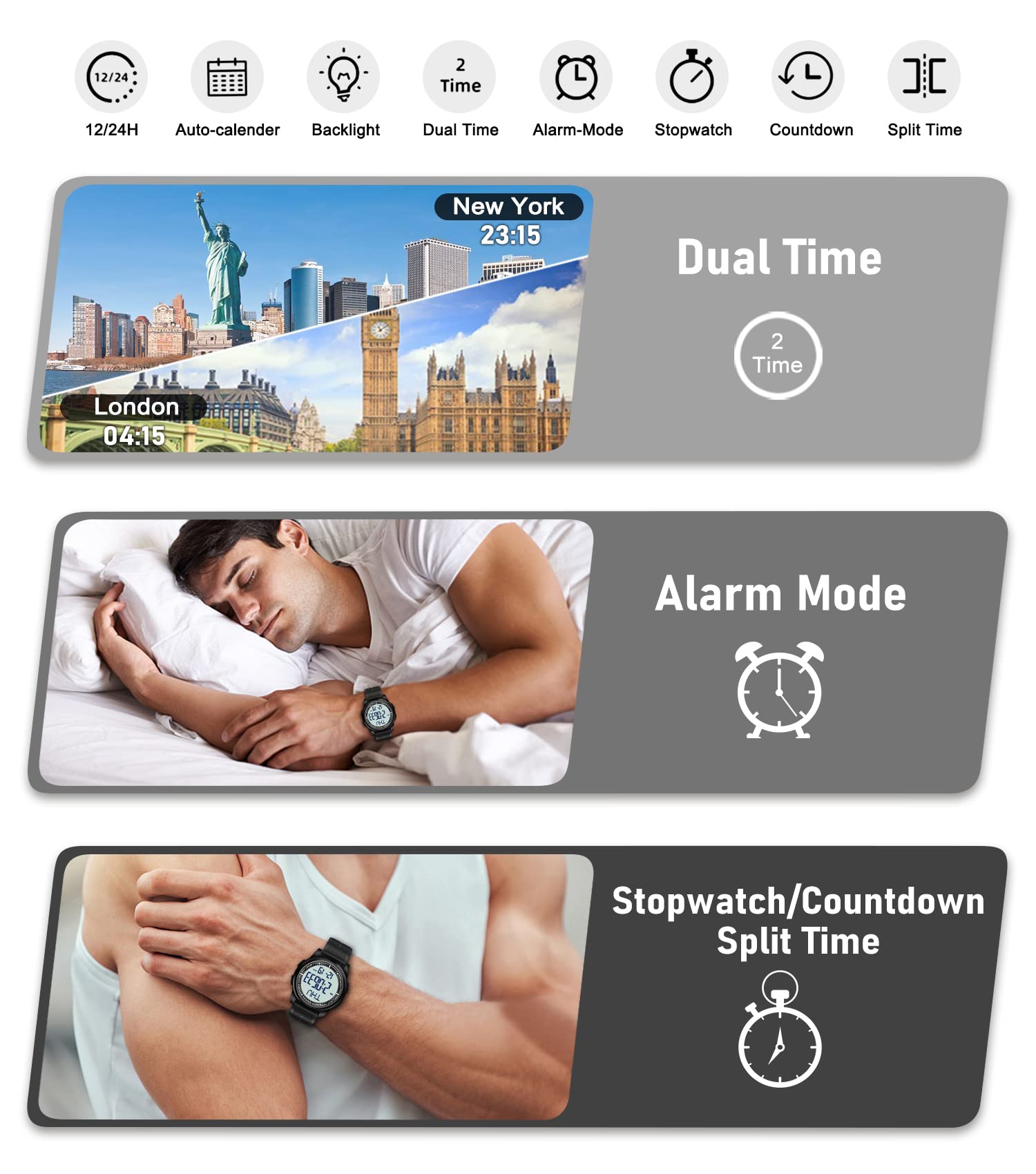 [Mens Digital Watch] Imported EL backlight screen, easy to read, Dual time zone, 12/24 hours switch, automatic calendar, alarm clock, hourly alarm and daily alarm