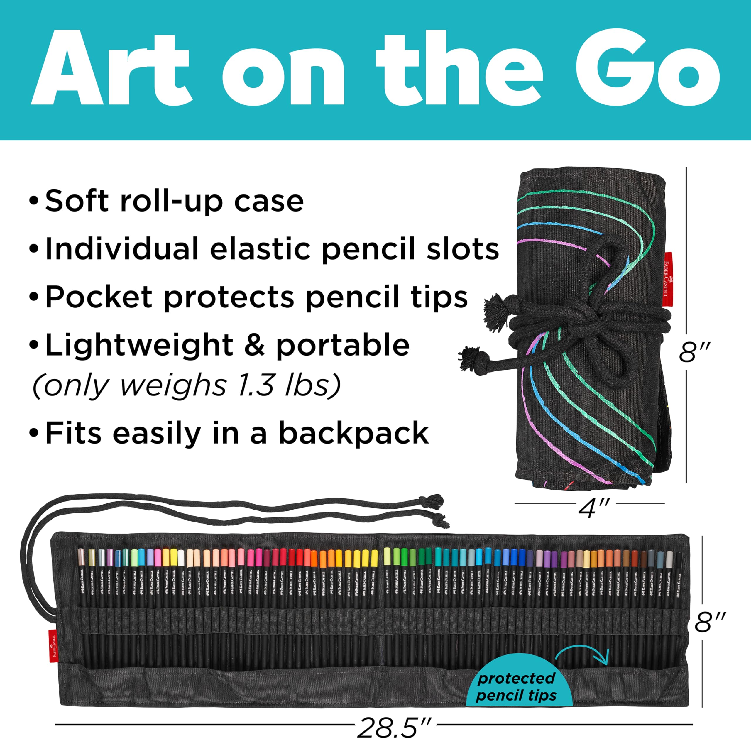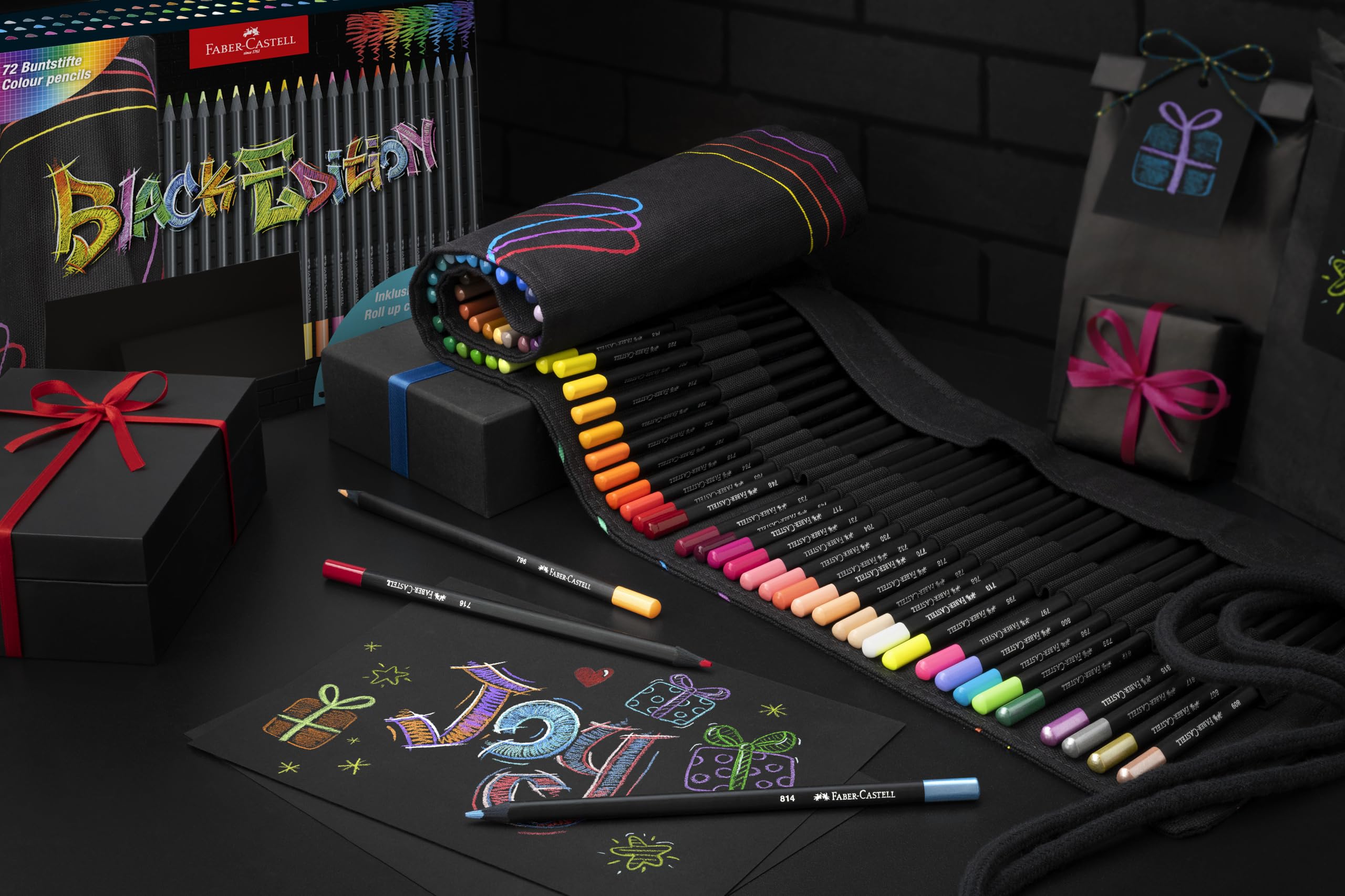 Experience bold color, brilliant creativity, and smooth results with the Faber-Castell Black Edition 72-Count Colored Pencil Roll. This complete set of soft-core, high-pigment coloring pencils for adults delivers vibrant, smooth laydown on light, toned, and especially dark paper—making your drawings, doodles, and adult coloring book pages stand out with intense color payoff. With 72 rich shades, including neons and metallics, the set offers a full spectrum for layering, blending, and detailed design work. Each pencil features a triangular ergonomic shape for a fatigue-free grip and no-roll stability, perfect for long coloring sessions. The 3.3mm break-resistant cores are bonded the entire length of the pencil with Faber-Castell’s Secure-All (SV) technology, ensuring clean sharpening, excellent point retention, and long-lasting performance. Whether you are refining fine details or filling large areas, these professional colored pencils provide consistent, streak-free coverage with every stroke. Organize and protect your supplies with the stylish soft roll-up case, featuring individual elastic slots that keep all 72 pencils secure and accessible. Designed for art on the go, this compact kit is ideal for students, hobbyists, and working artists alike—ready for use in the studio, at school, or on the road. Made from FSC-certified reforested wood and packaged using 100% recycled materials, these eco-conscious, non-toxic pencils reflect Faber-Castell’s commitment to sustainability. A standout in high quality colored pencils, this set also makes a perfect choice for artist gifts, art drawing supplies, journaling, school projects, and creative expression. Since 1761, Faber-Castell has proudly crafted art supplies for adults that inspire confidence, imagination, and artistry in every stroke.