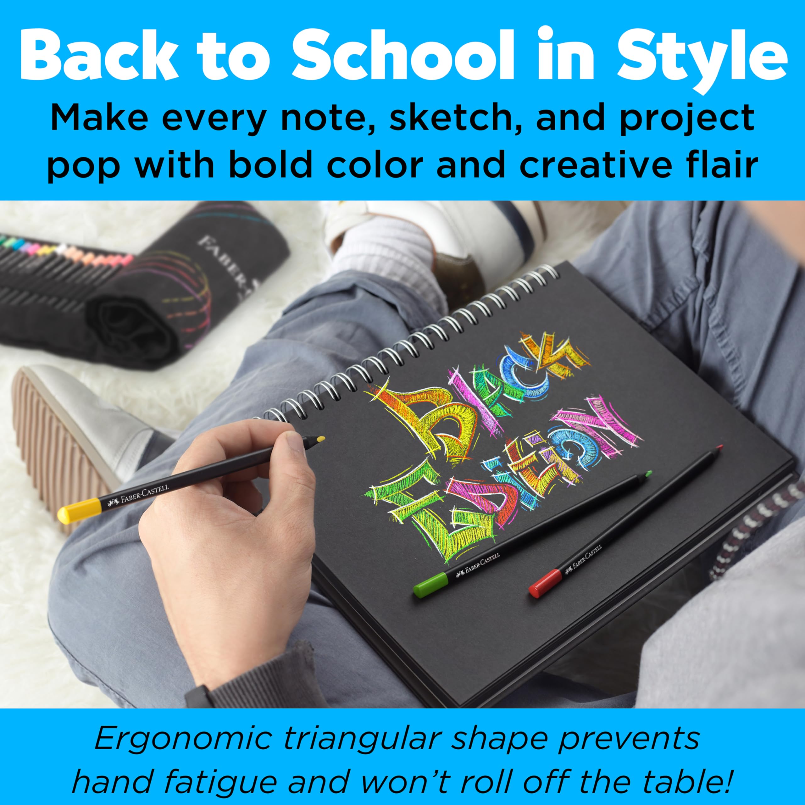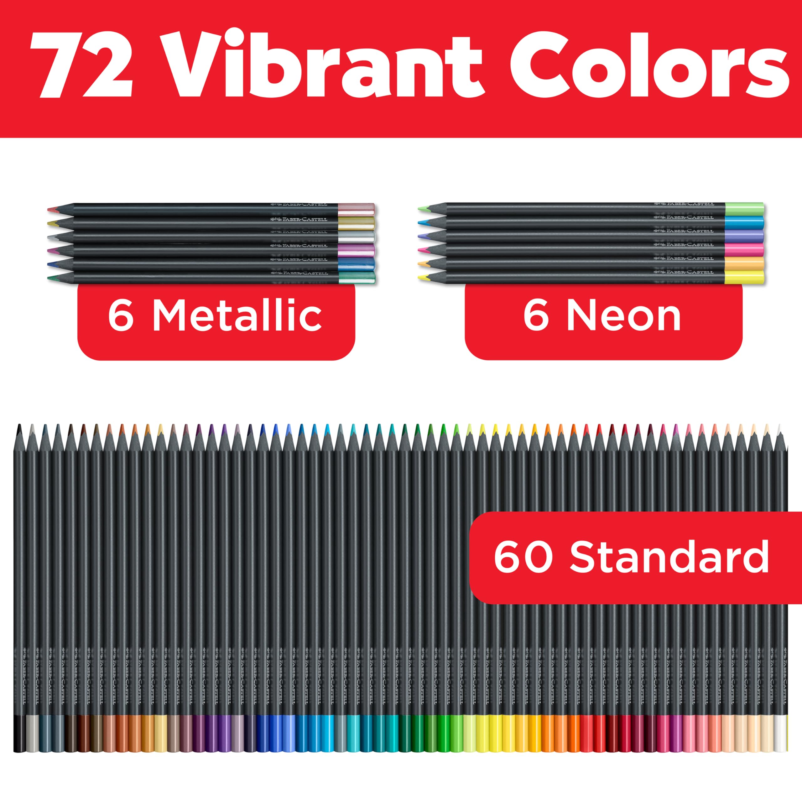 BLACK EDITION COLORED PENCILS: Unleash bold, expressive color with this 72-count set of Faber-Castell colored pencils, crafted for smooth laydown and brilliant results. Featuring sleek black wood and soft-core pencils, this premium set performs beautifully on light, toned, and dark paper. A must-have in art supplies for adults, this versatile set is perfect for sketching, coloring, and expression