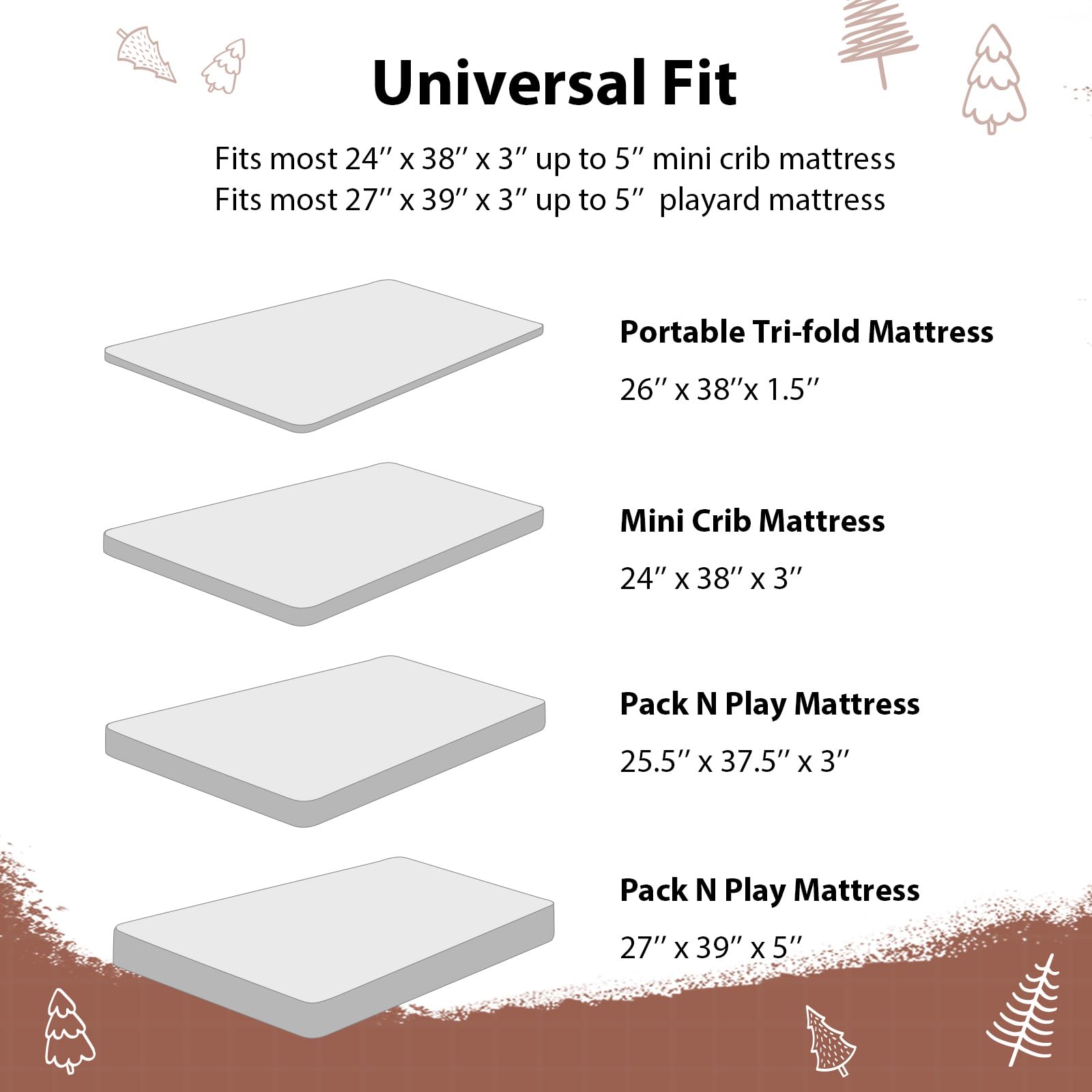 Snug Fit: Measuring 38” x 26”, our 3-pack mini crib sheets fit most baby portable plapens and pack n play mattresses. With elastic bands around the edges of the playard sheets, an 6-inch deep pocket, and stretchy fabric, they ensure a snug, wrinkle-free fit that stays securely in place.