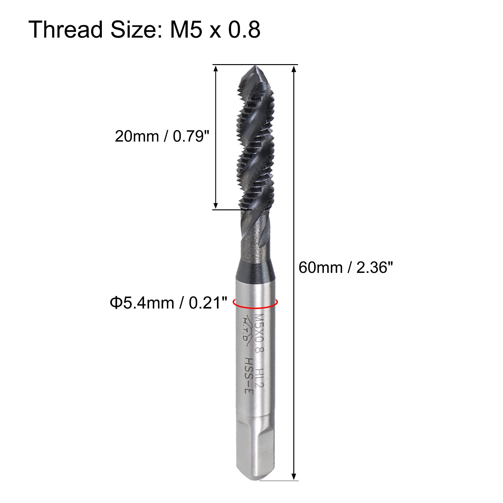 Tap Size: M5 x 0.8 thread, H2 tolerance. Spiral flute design, upward chip removal. Right hand thread cutting, clear threads without burrs, fast tapping with accuracy.