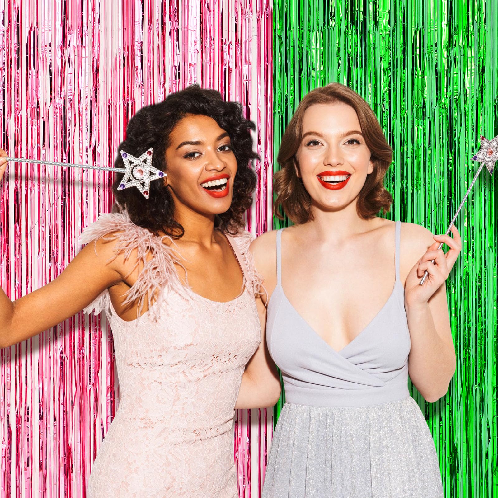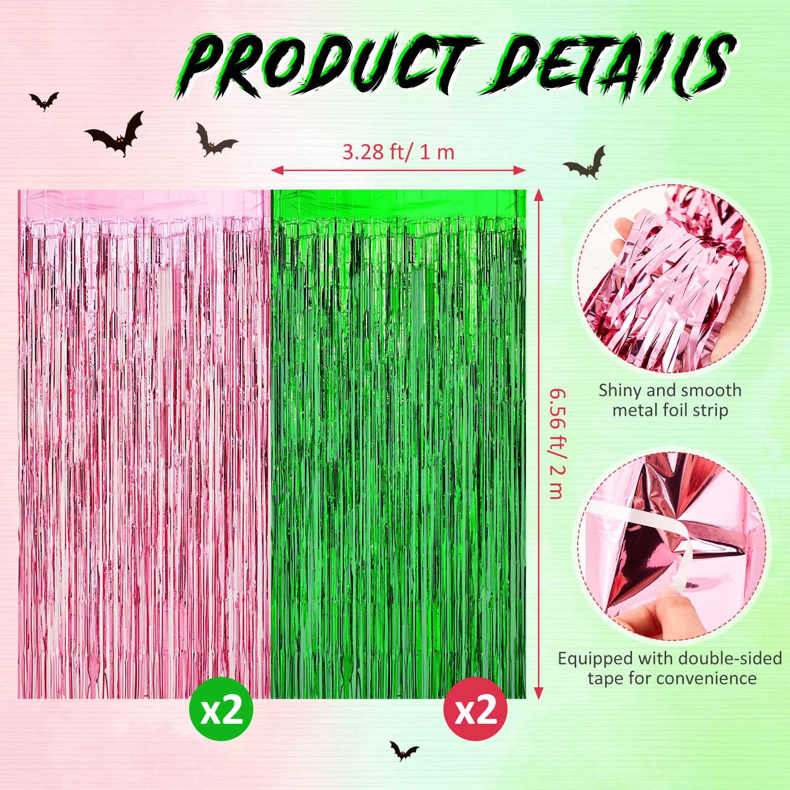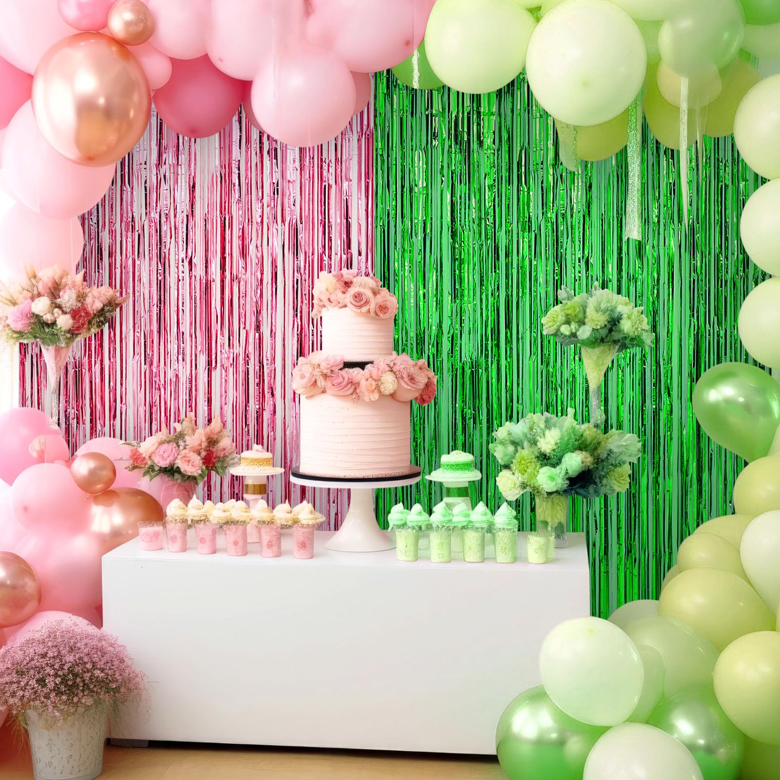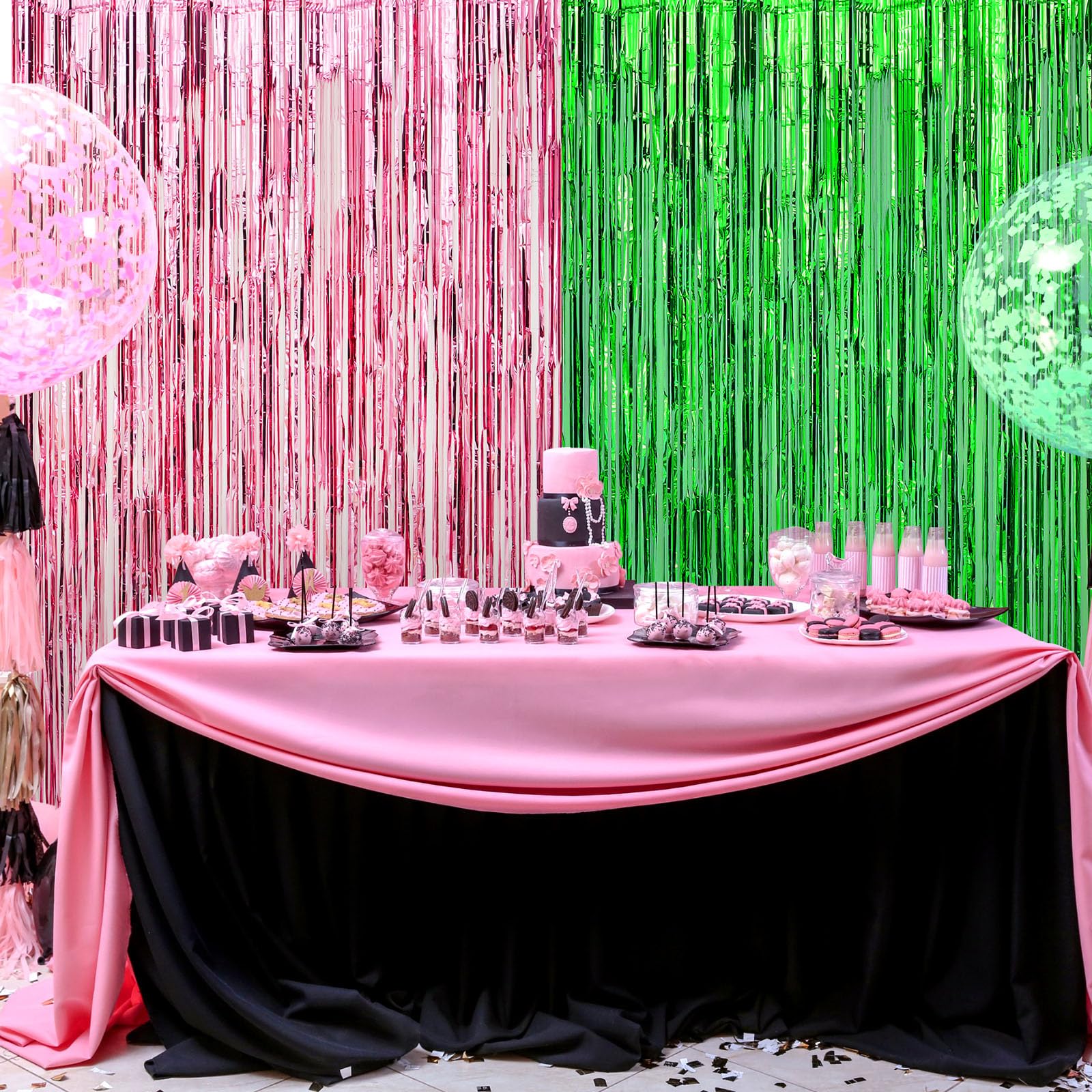 Quality Metal Shiny Tinsel Material: the green streamers backdrop made from shiny tinsel, this set of 4 green pink foil fringe curtains offers dazzling reflective capabilities, creating an attention grabbing, enchanting effect; The scintillating shimmer and shine will certainly set a glowing and delightful atmosphere for your party