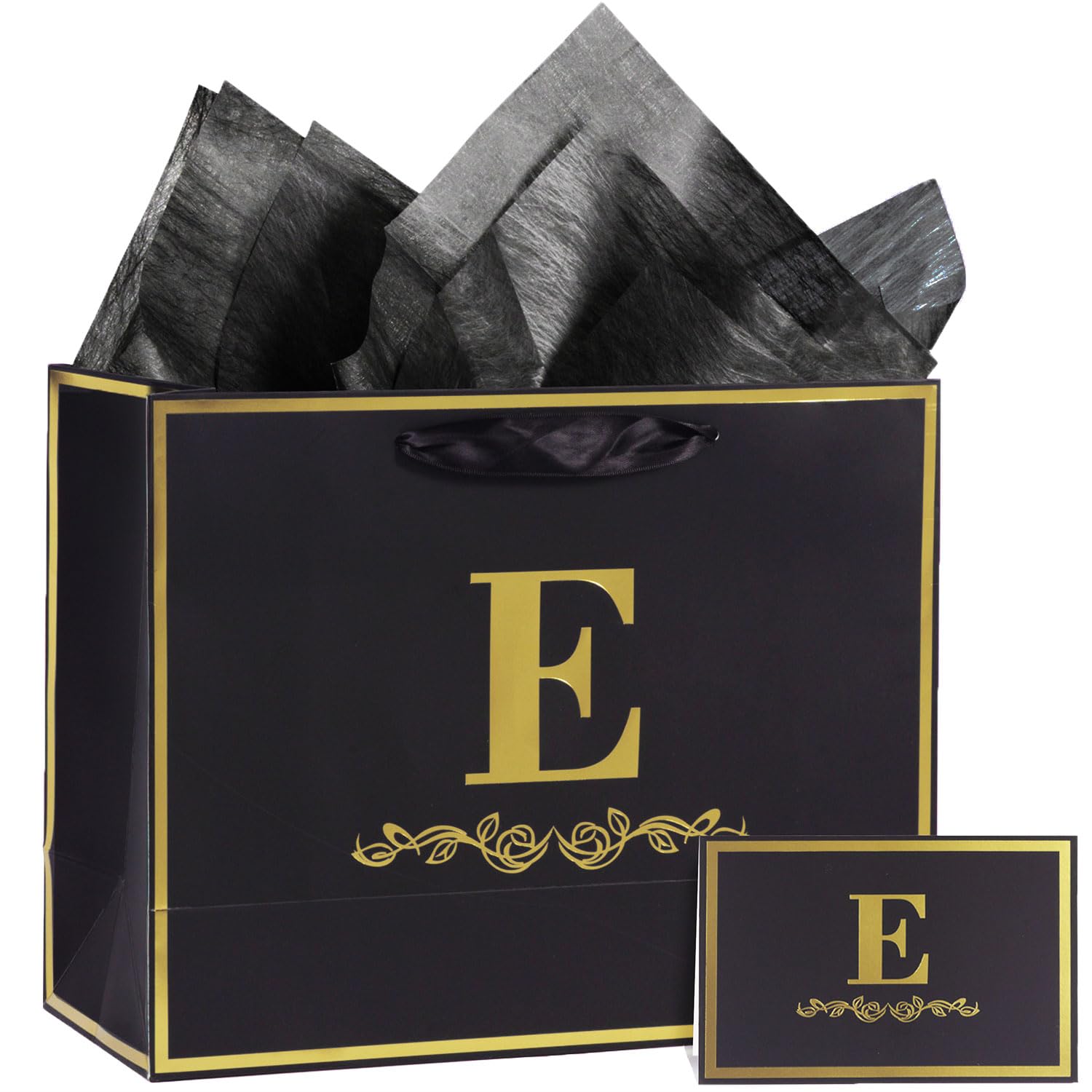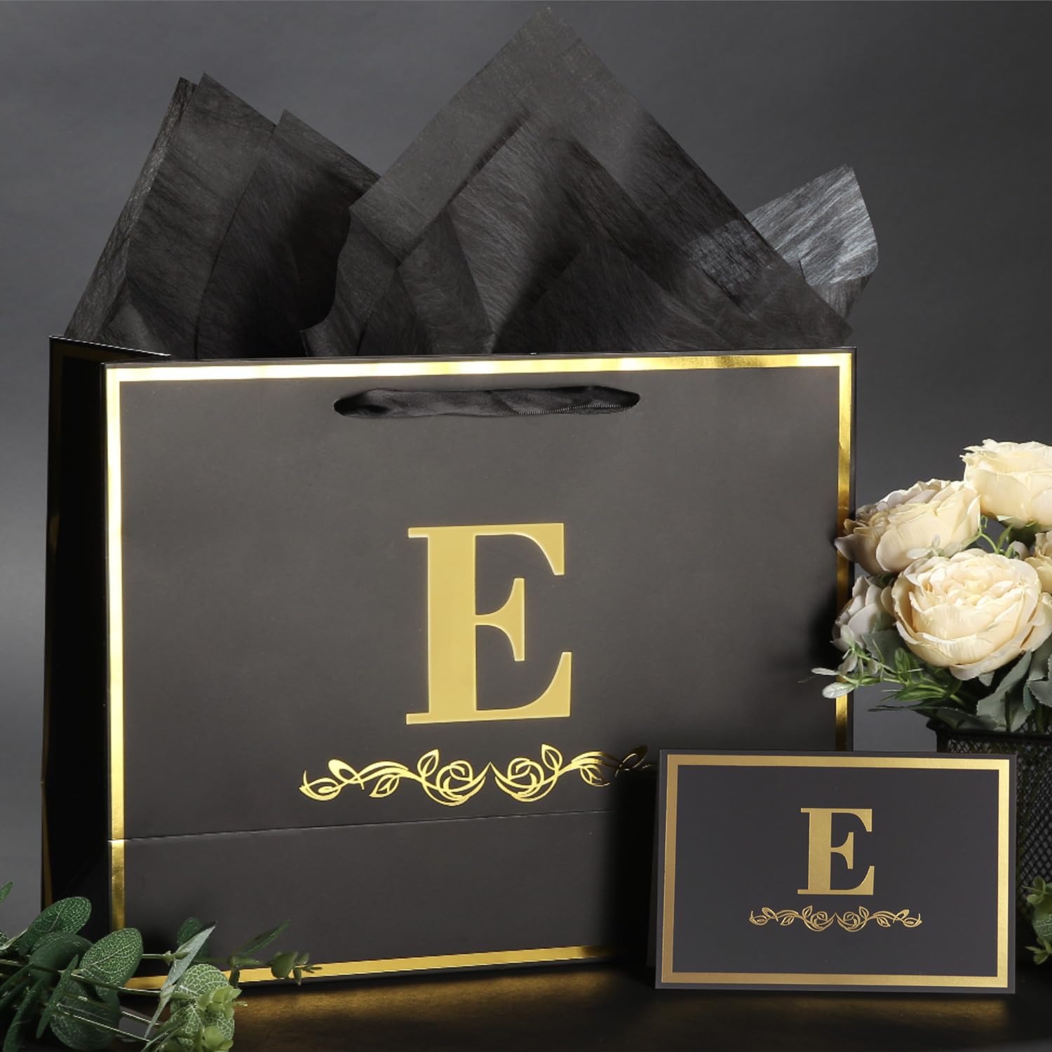 Alphabet Birthday Gift Bag with Card and Tissue Paper for Men Women, 13" Large Black Gold Personalized Horizontal Paper Bag for Gifts Wrapping - (Letter E)