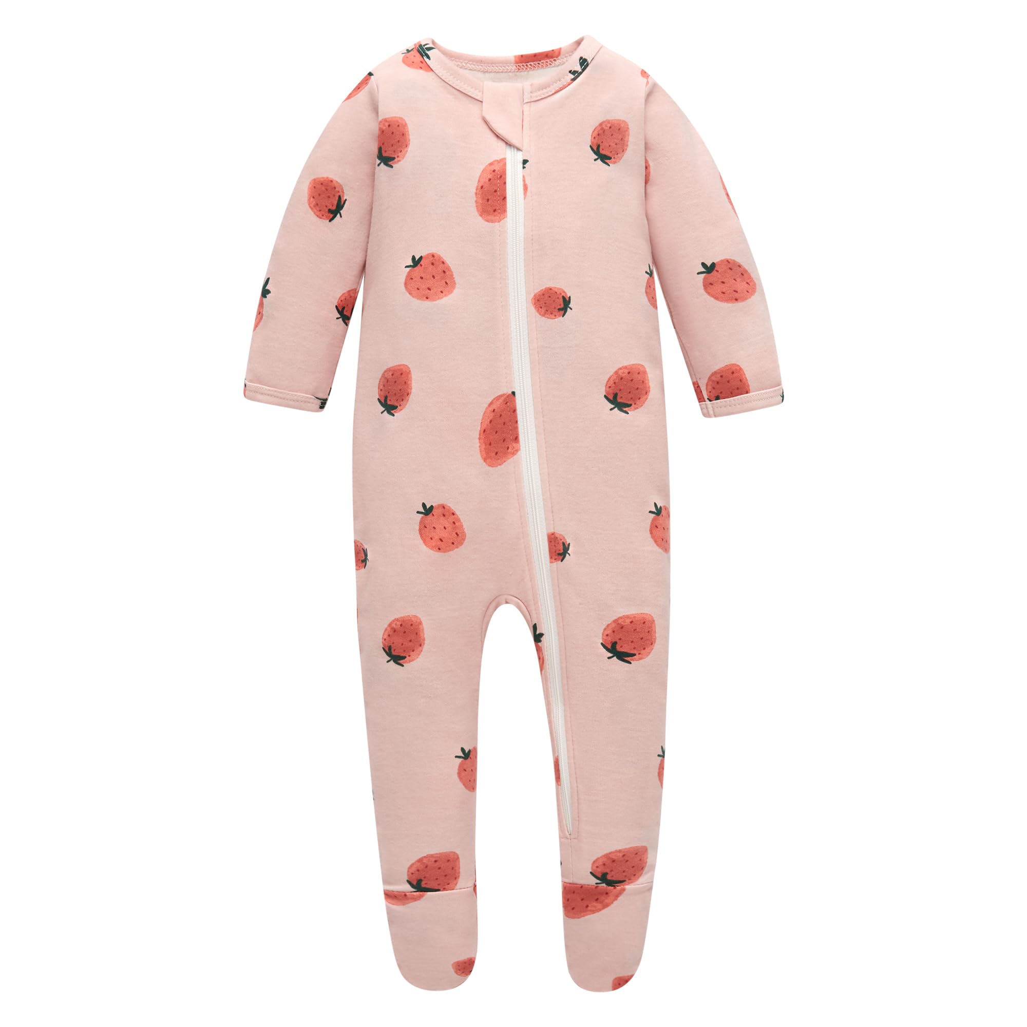 Owlivia Organic Cotton Baby Pajamas, Boys Girls 2-Pack Zip Front Sleep 'N Play, Footed Sleeper, Long Sleeve(12-18 Months, Pink Strawberry&White)