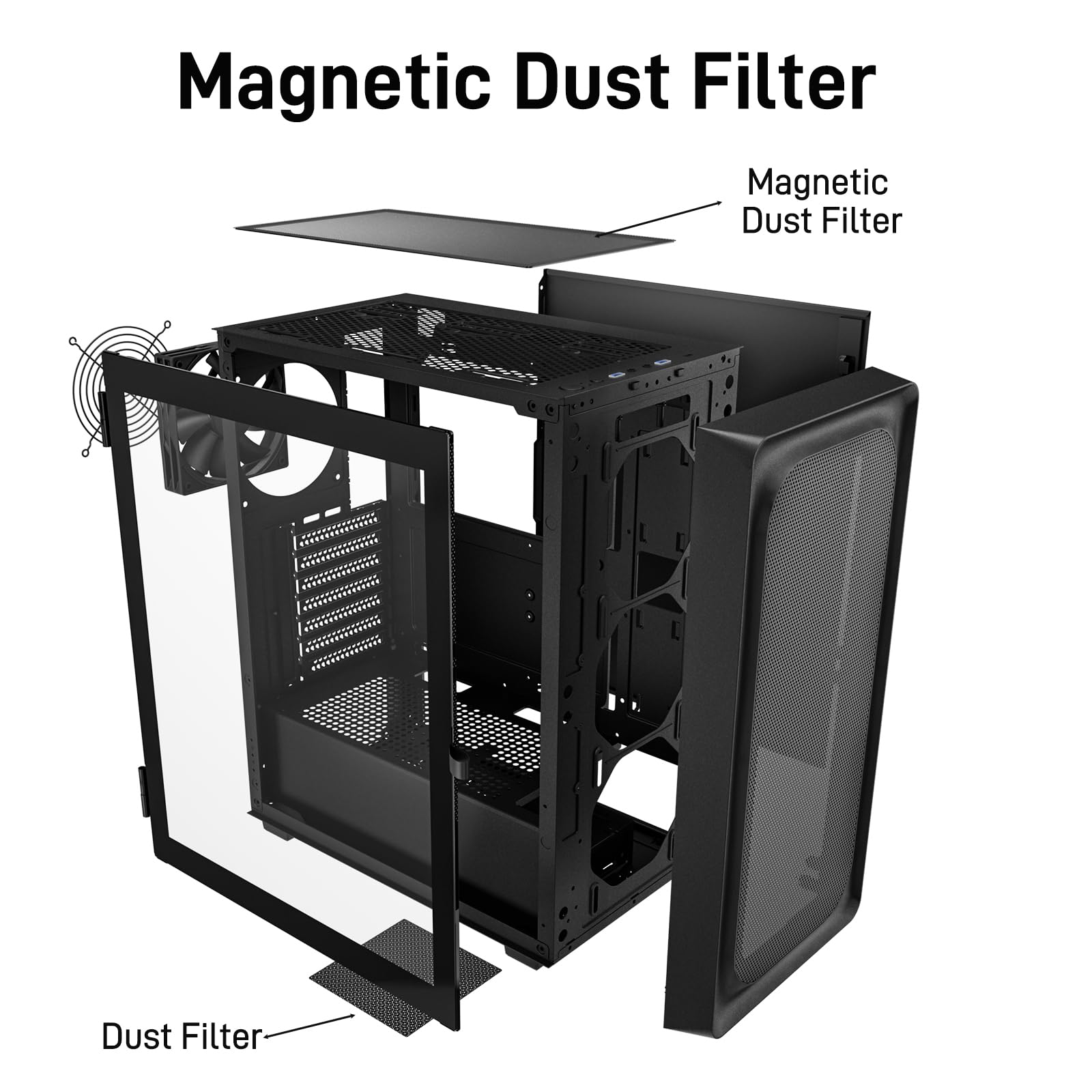 Magnetic Dust Filter: The magnetic dust filters are mounted separately on the top and bottom of the chassis to prevent dust from entering the interior of the chassis