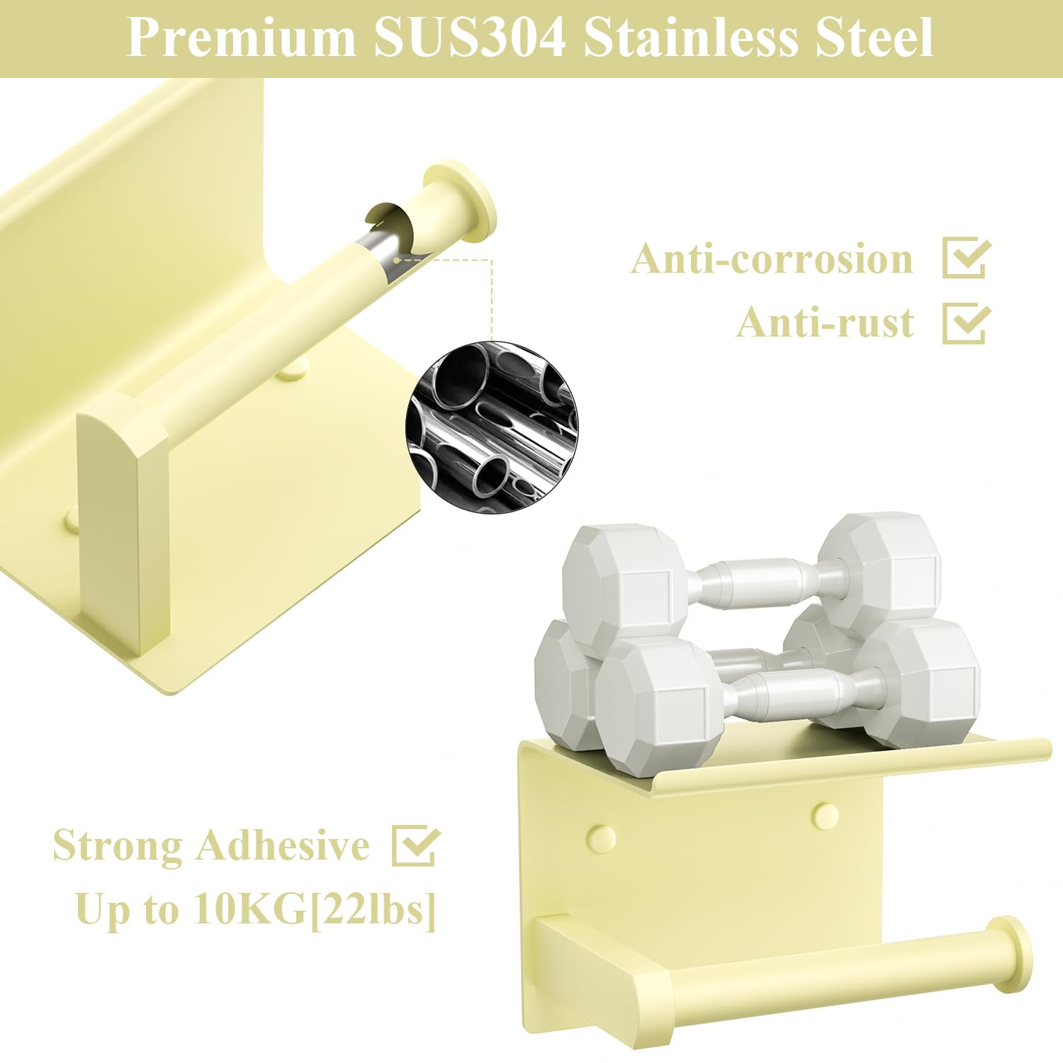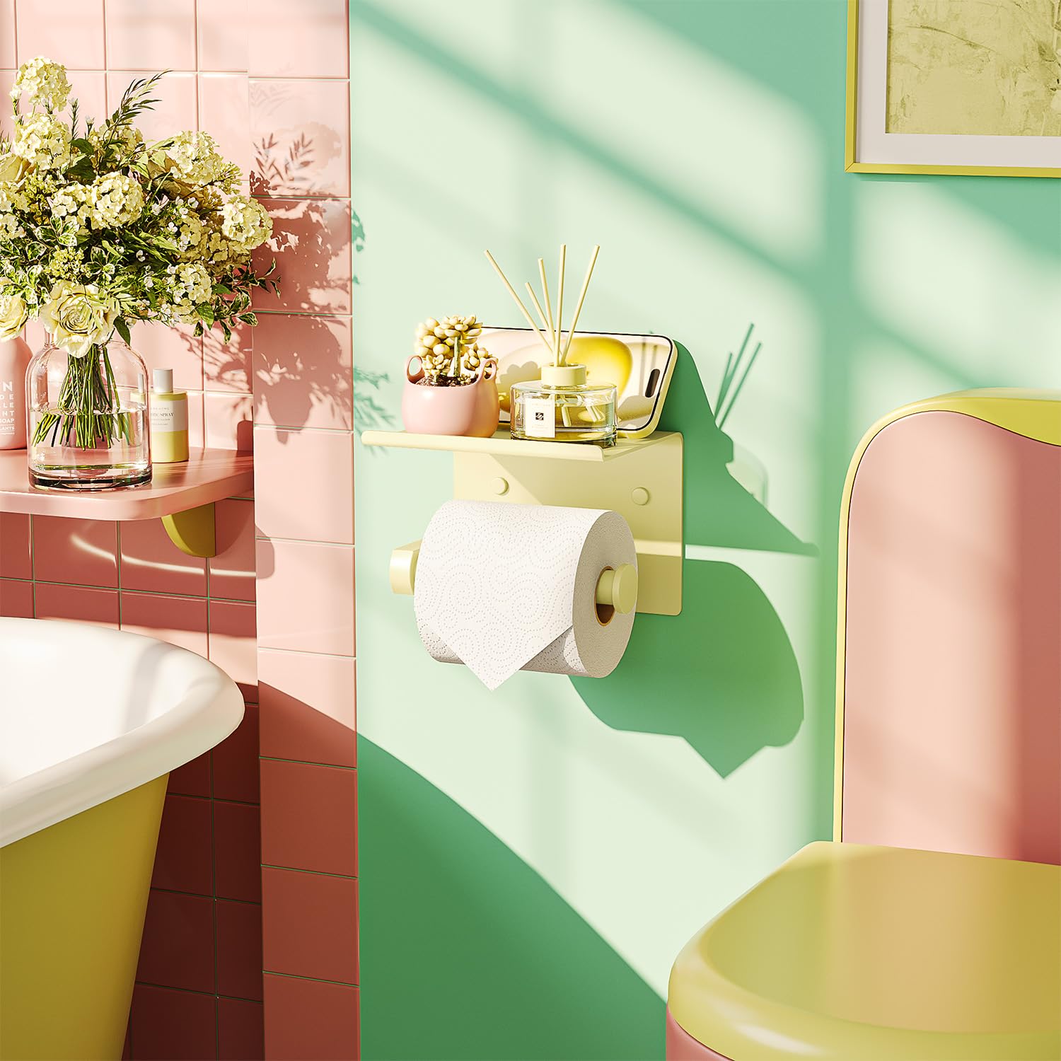 MODERN & STYLISH DESIGN: Sunlight Yellow painted, waterproof, rust-proof and corrosion resistant, bathroom toilet paper holder fits a variety of home decor style, add modern home atmosphere and save your efforts from organizing bathroom and kitchen. Standard process builds delicate finish that is beautiful and long lasting.