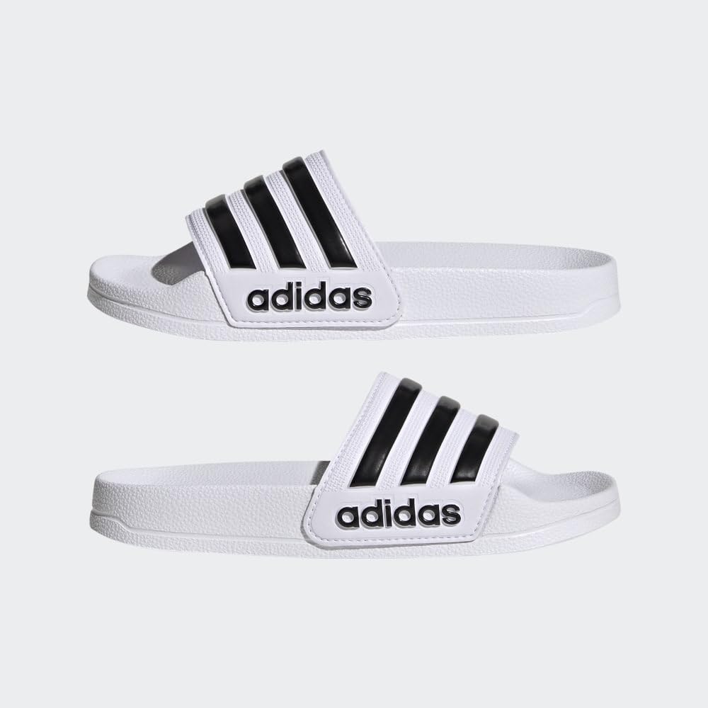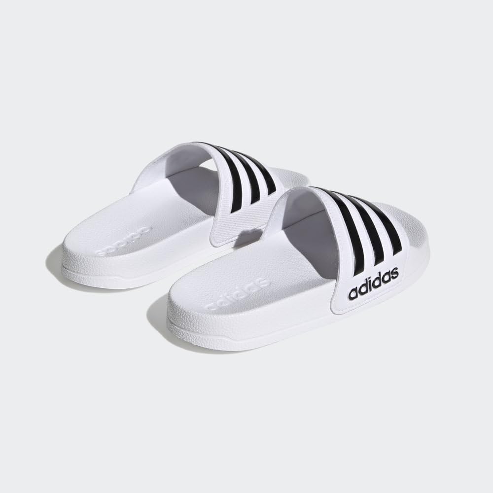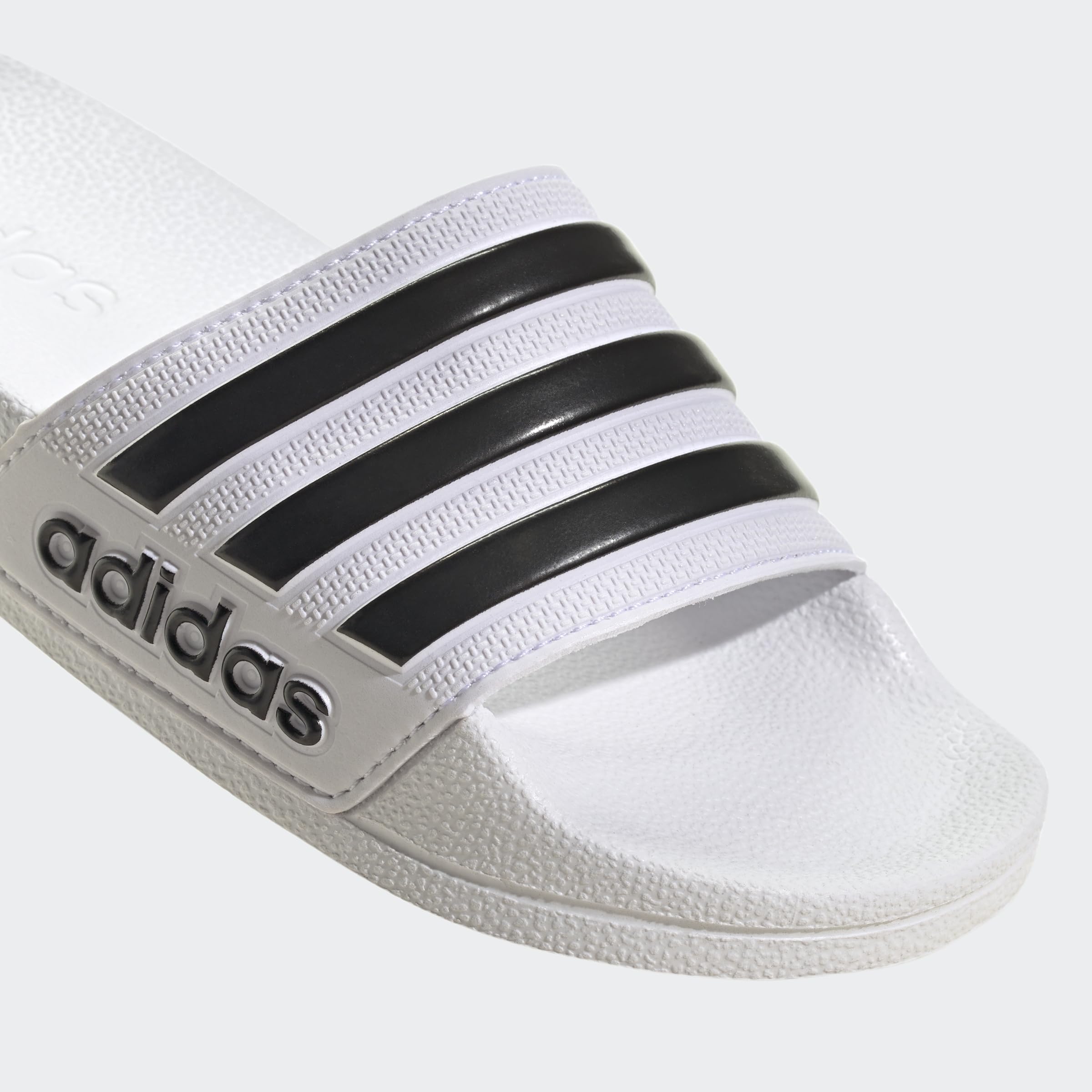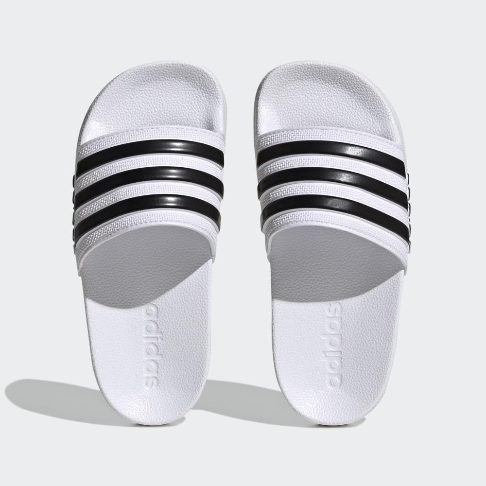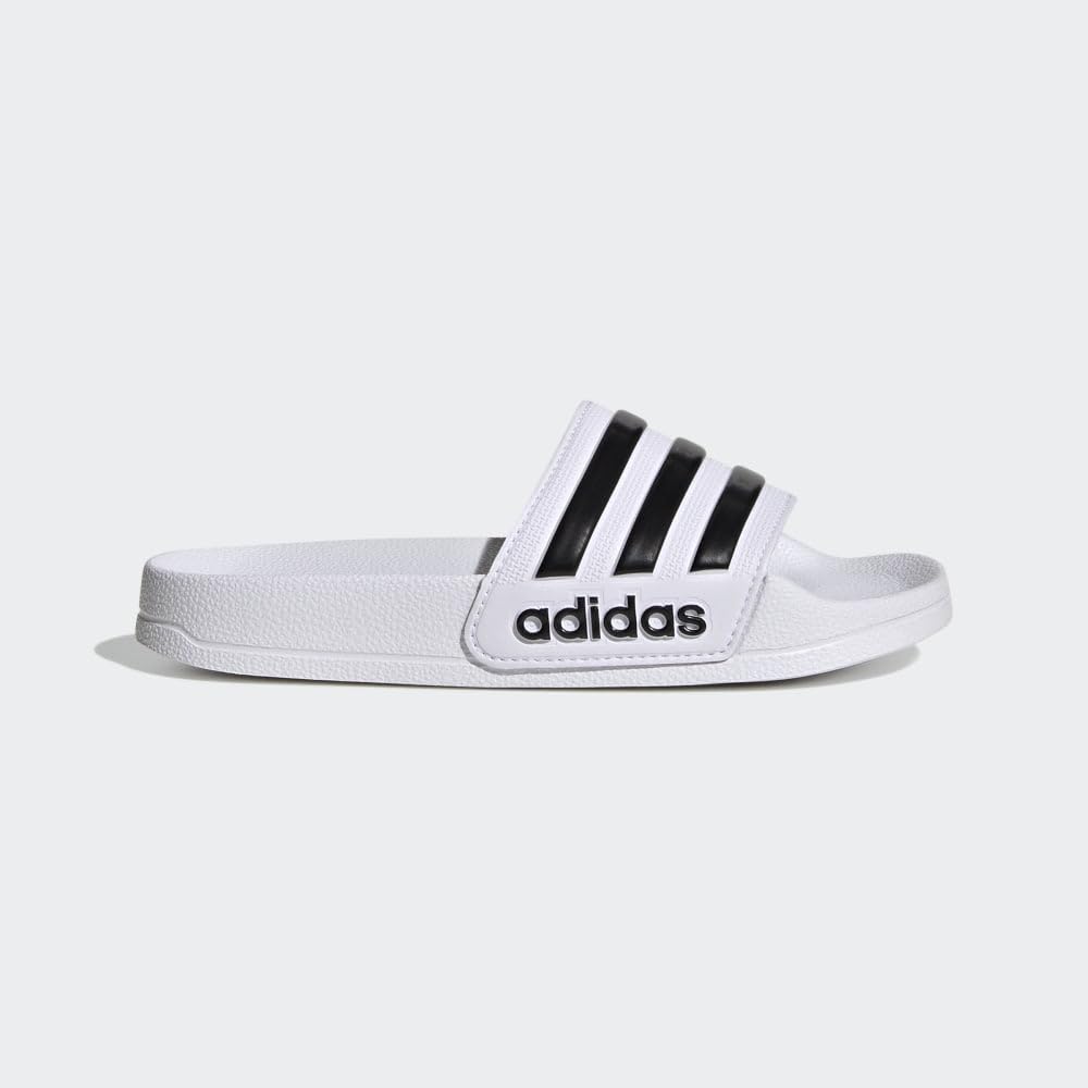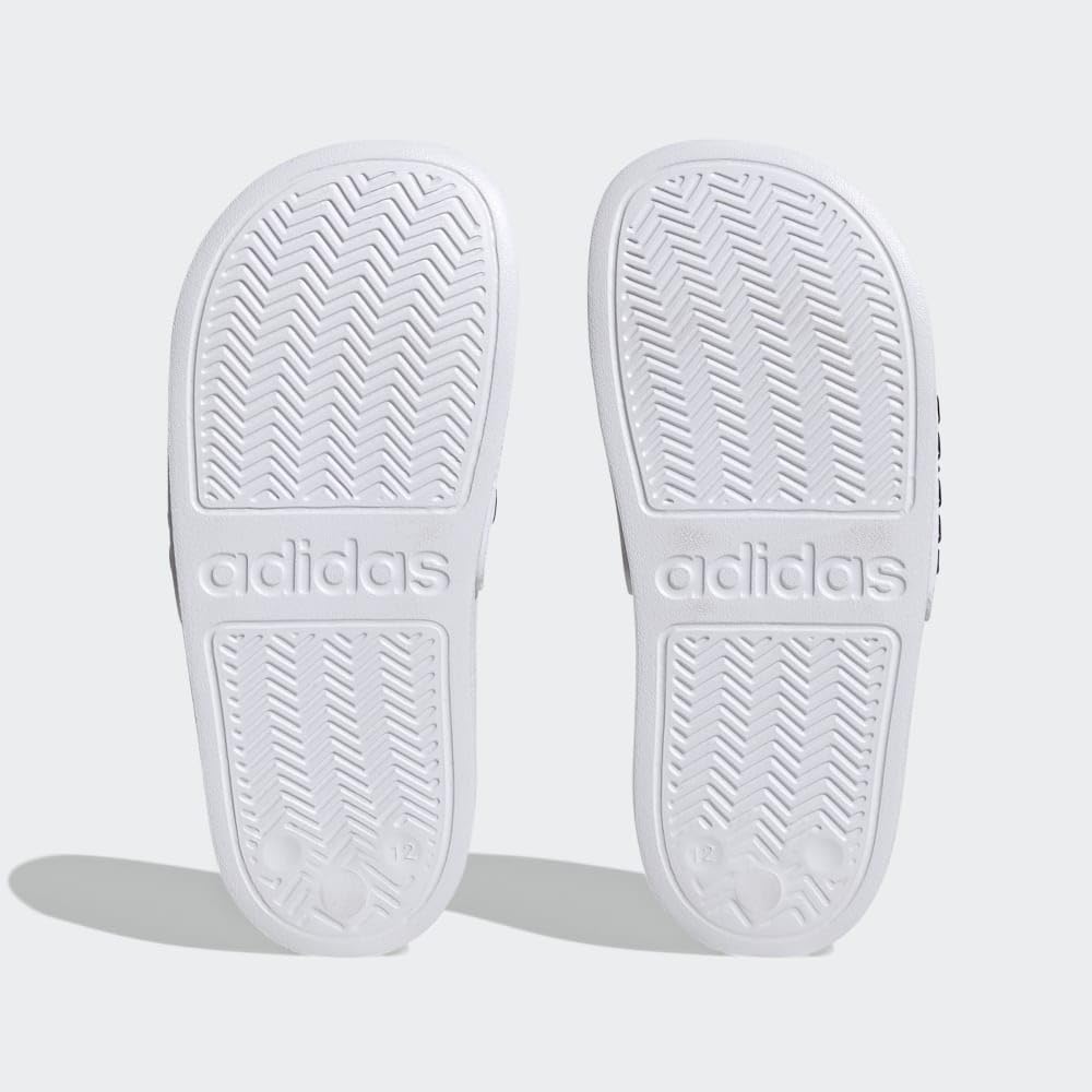 Description After their swim, treat kids' feet to comfort in these slides. The quick-drying slip-ons have a contoured Cloudfoam footbed that cradles small feet. The 3-Stripes on the bandage offer a touch of adidas style.