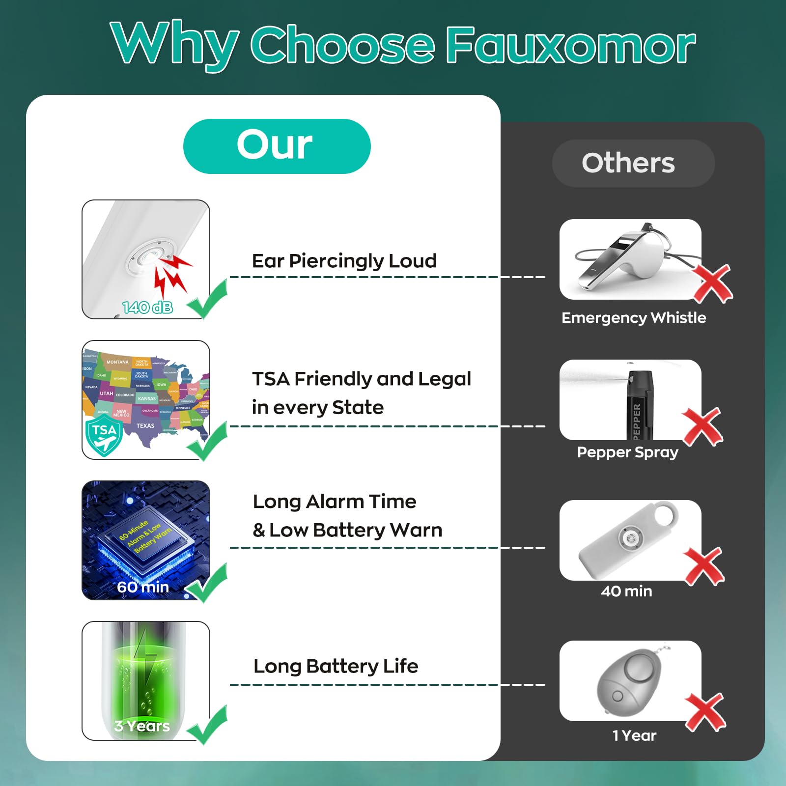 Safety First: Unlike traditional pepper sprays or tasers, the Fauxomor safety keychain alarm set for women provides a non-violent yet highly effective way to ensure your safety. When threatened, its 140-decibel loud siren birdie sound and high-intensity strobe LED light can distract and scare off attackers while quickly drawing attention from other people to help you.