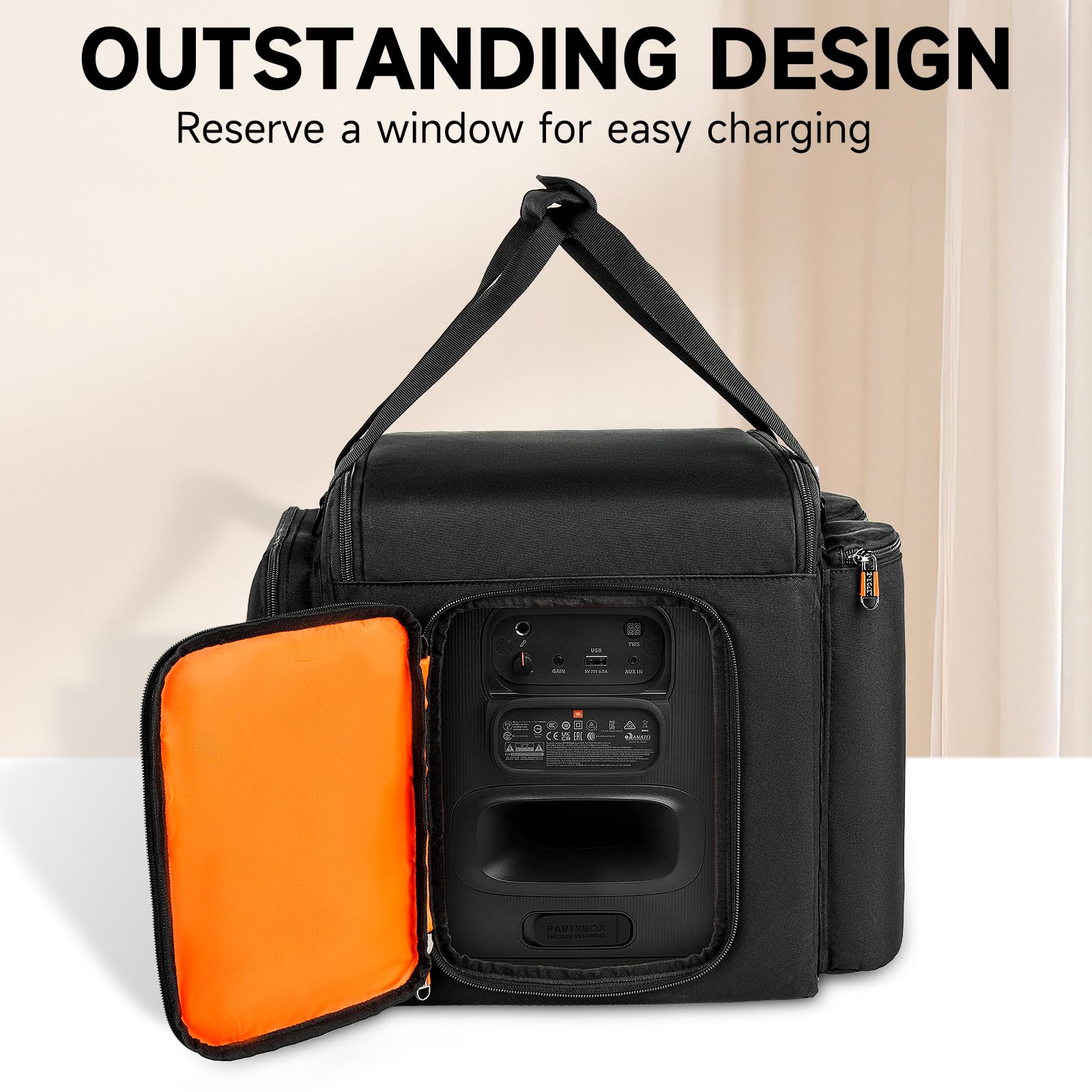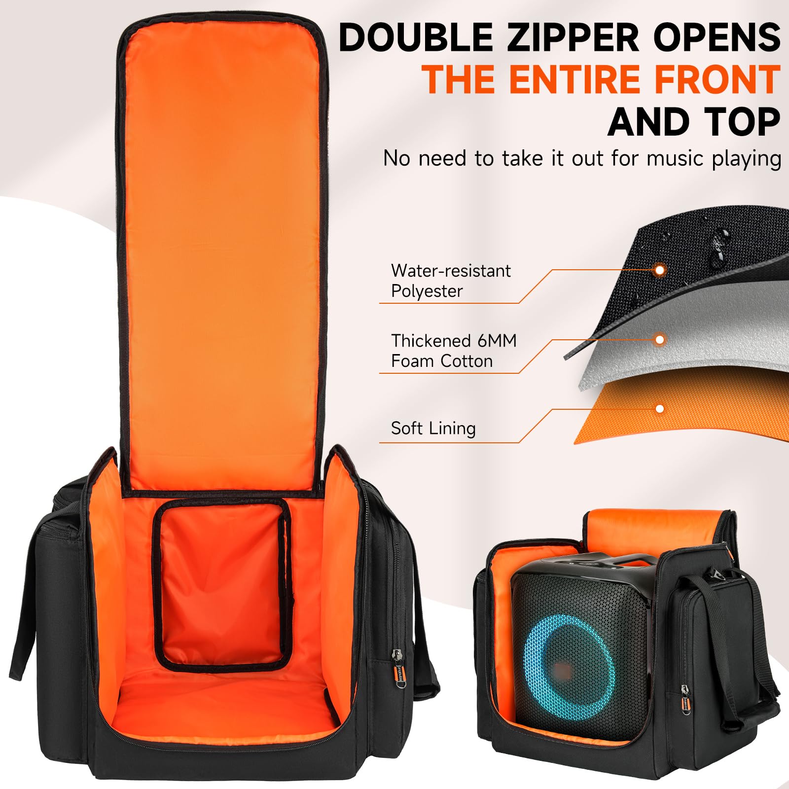 Outstanding Design: The smooth and sturdy double zippers can open the entire front and top of the speaker bag for easy loading and unloading. An additional zipper window is reserved at the back for convenient charging. The specially design allows you to play music without taking out the speaker and will not affect the light show.