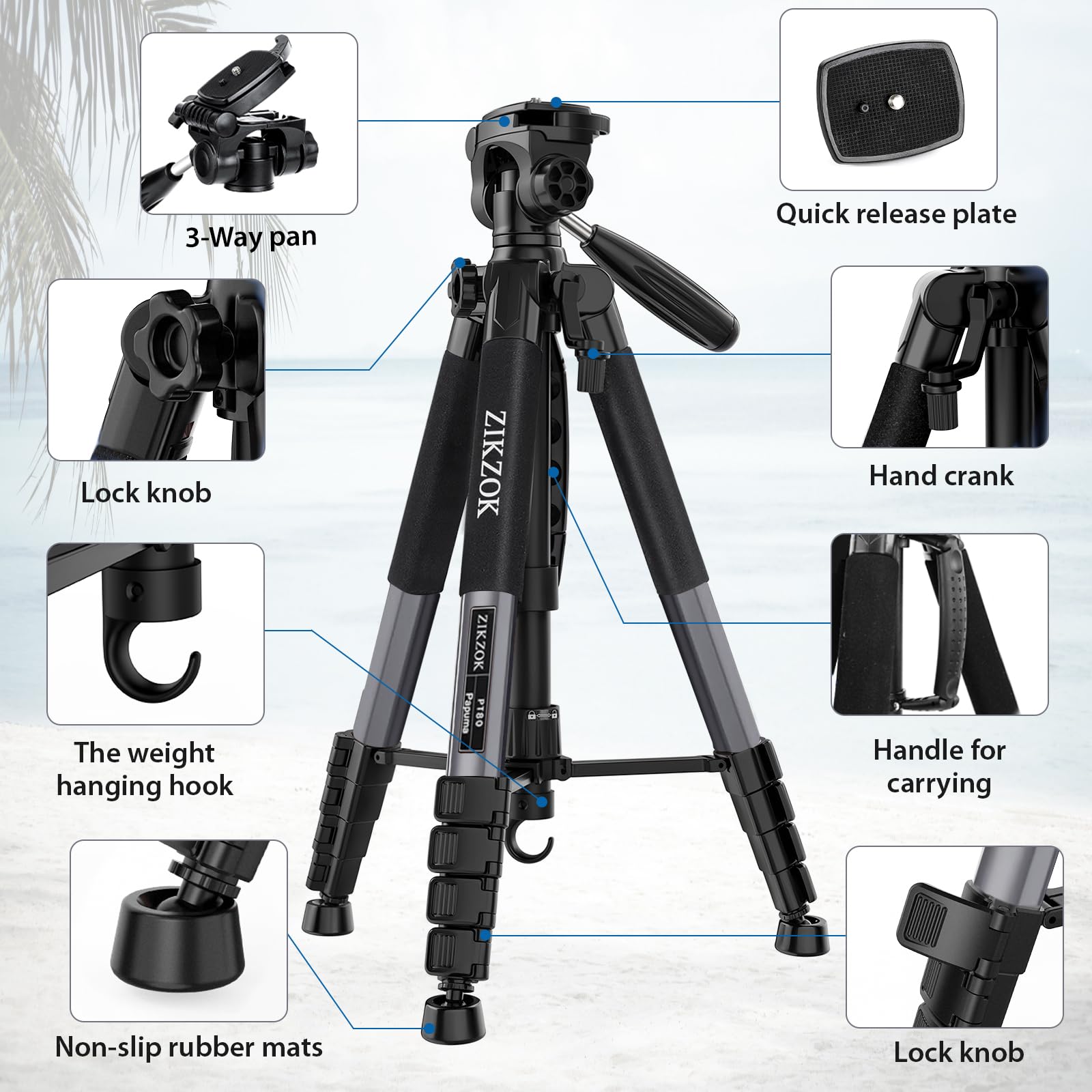 【75" Pro Height with 15LB Load】: Aircraft-grade aluminum legs extend from 19.7" low-angle to 75" overhead (20% taller than standard tripods), supporting heavy gear like Sony A7IV + 24-70mm lens. Non-slip rubber feet + center column hook (add sandbags) ensure rock-solid stability even on slopes or windy beaches
