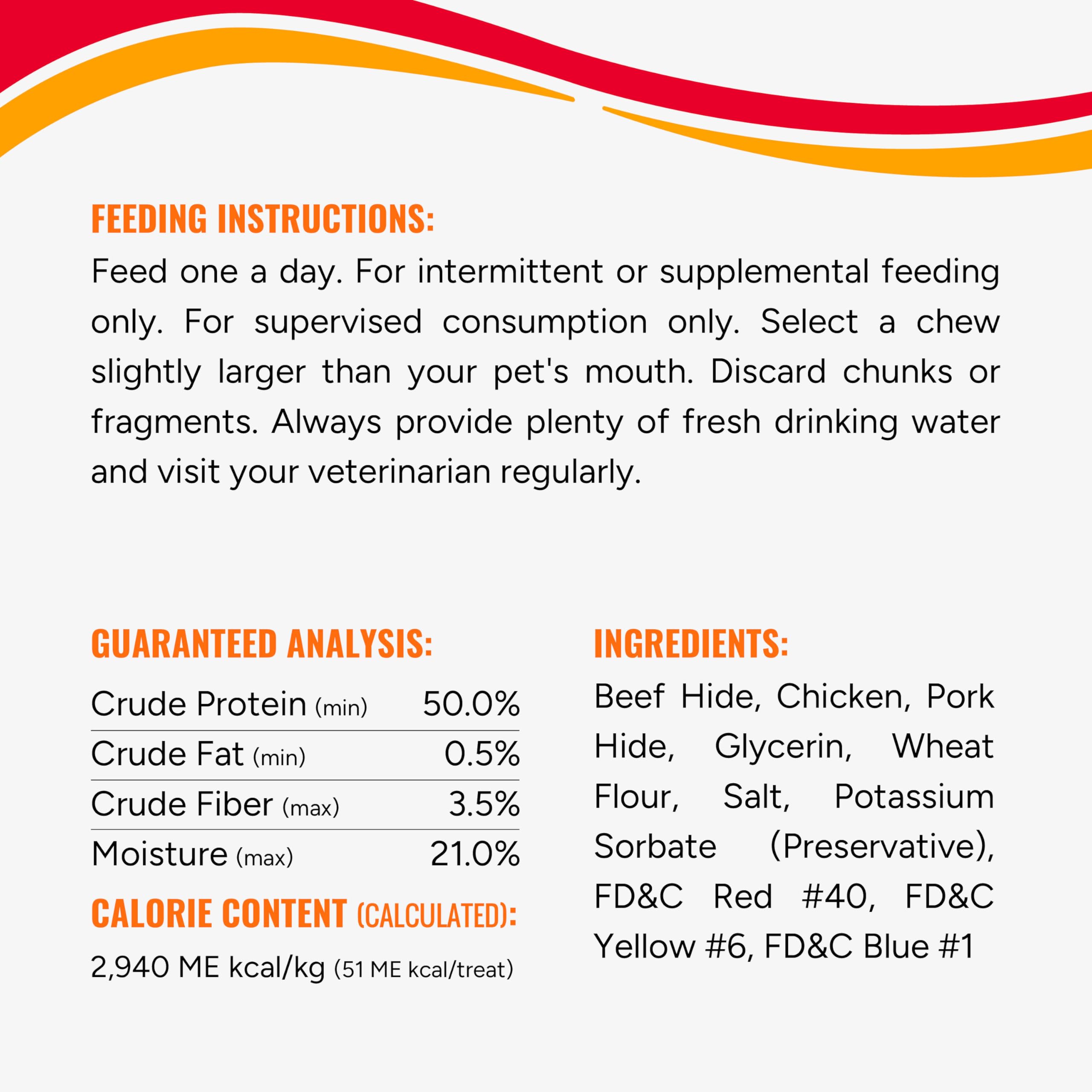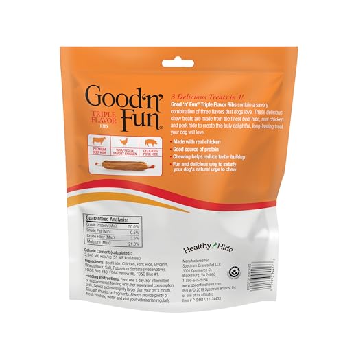Treat your pup to a fun ‘n’ flavorful chew! Good ‘n’ Fun® Triple Flavor Ribs contain a savory combination of three tasty flavors that dogs crave. These scrumptious chews are made with long-lasting beef hide, premium chicken and delicious pork hide to create a truly delightful treat your dog is sure to love. Wrapped with premium cuts of real chicken, these chews are a good source of protein. Plus, they're a fun and delicious way to satisfy your dog’s urge to chew, while the natural chewing action helps reduce tartar buildup and remove plaque. Feed one a day. For intermittent or supplemental feeding only. For supervised consumption only. Select a chew slightly larger than your pet’s mouth. Discard chunks or fragments. Always provide plenty of fresh drinking water and visit your veterinarian regularly.