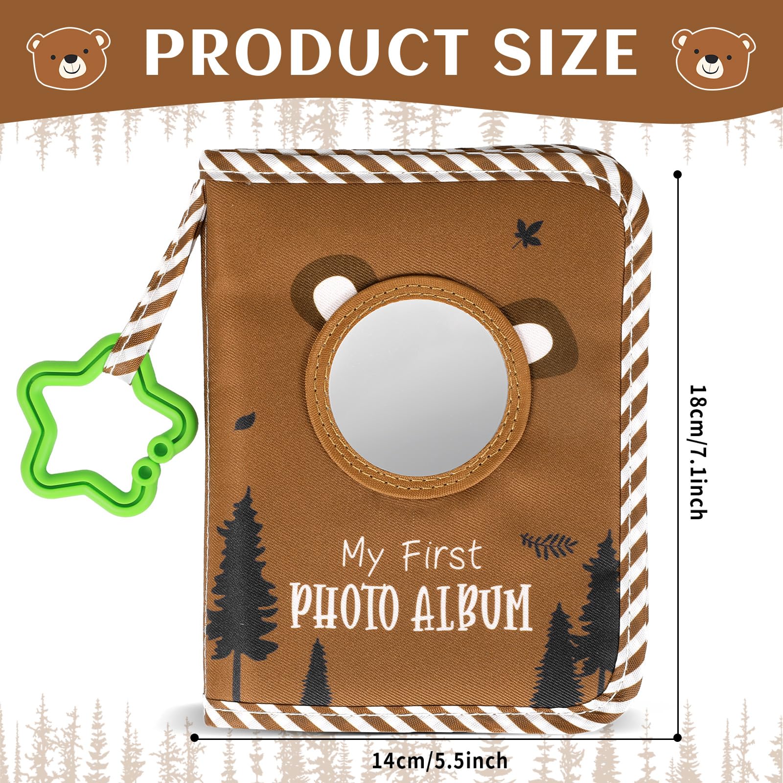 Baby's My First Family Album Soft Photo Cloth Book Brown Bear My First Book of Photos with Mirror Forest Bear Baby Memory Album Gift Holds 4x6 Pictures This brown bear soft cloth baby photo book is thoughtfully designed for babies, families, and all those precious, unforgettable moments. The cute bear baby's first photo book can hold up to 17 photos sized 4x6 inches, providing ample space to include pictures of parents, grandparents, siblings, pets, and, your babies. With its easy-to-use design, photos can be added or removed effortlessly. Specification: Material: cloth Color: colorful Size: 7.1x5.5 inches (18x14 cm) Package Includes: 1 x forest brown bear baby's my first family album Its charming bear and forest design, combined with built-in baby mirrors, engages your baby’s imagination and curiosity. This baby memory book keepsake helps stimulate visual and cognitive development while making memory-keeping a fun and educational experience for both you and your.
