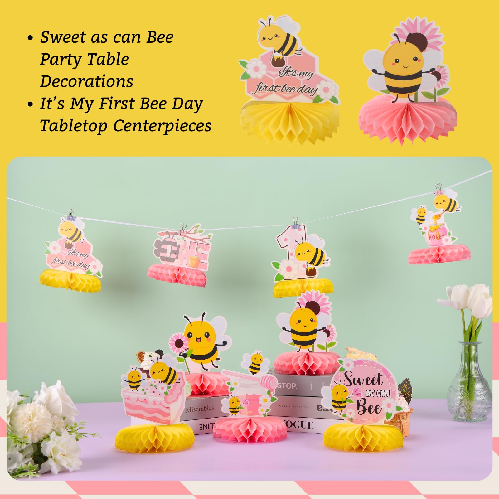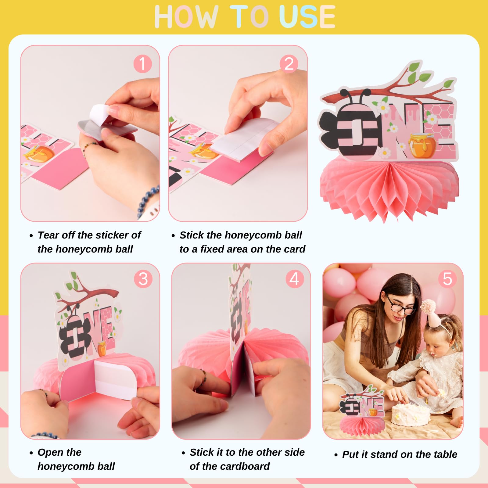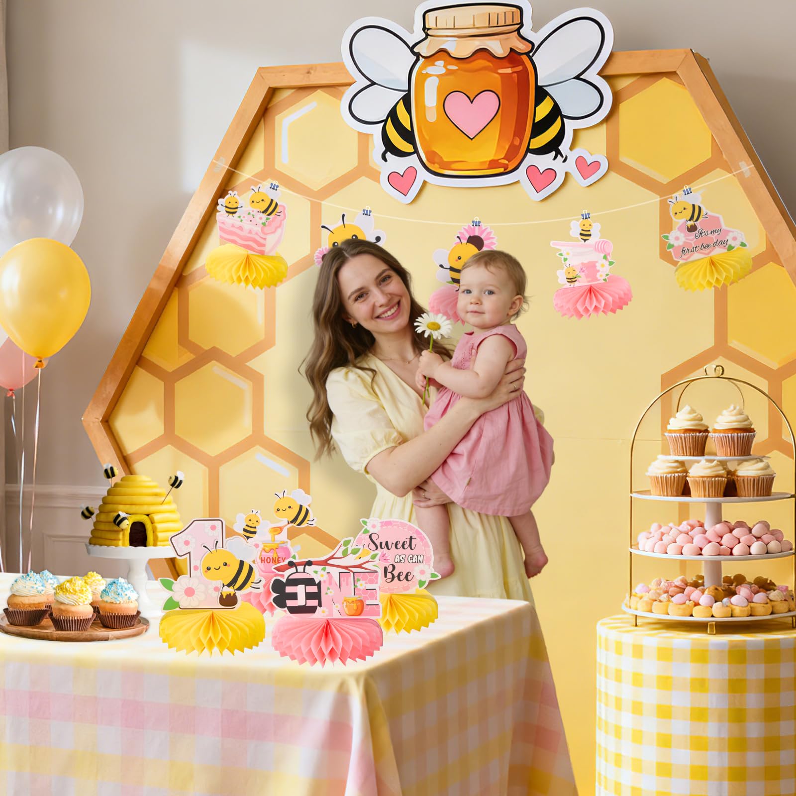 Happy Bumble Bee Party Table Decorations: Celebrate your child's one birthday with our honeycomb centerpieces. Adorable double sided bee elements and sweet honeycomb patterns are in a beautiful combination of black pink and yellow, which will add much touch of charm to first birthday party decoration and feel like sweet times