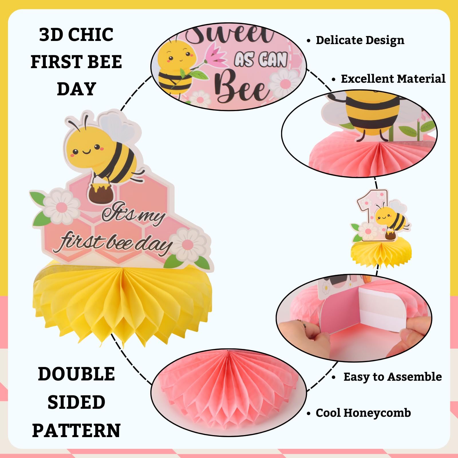 Wide Application: This First Bee Day birthday table topper sign decorations can be hung on the ceiling, the birthday backdrop, or placed on tables. Suitable for 1st birthday celebration and baby shower party. To make decorating the honeycomb centerpieces a breeze, it includes double-sided tape, which ensure that you can easily use