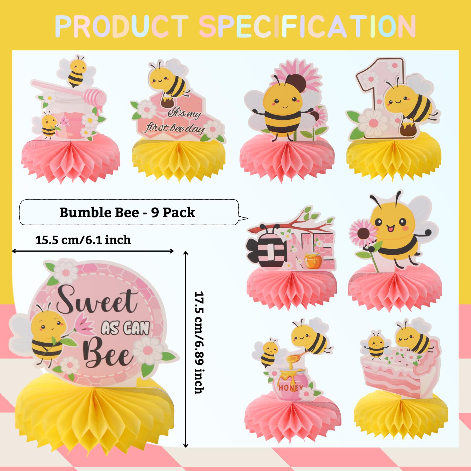 Delicate 1st Bee Birthday Party Favors: The cute bee design adds the touch of active and sophistication to party decor, making it a standout event. Our 9pcs honeycomb centerpieces come in 1st happy birthday, ONE elements and sweet honey, bee, sweet as can bee and desserts patterns in a beautiful combination of varous color. It will add much touch of charm to 1st birthday party