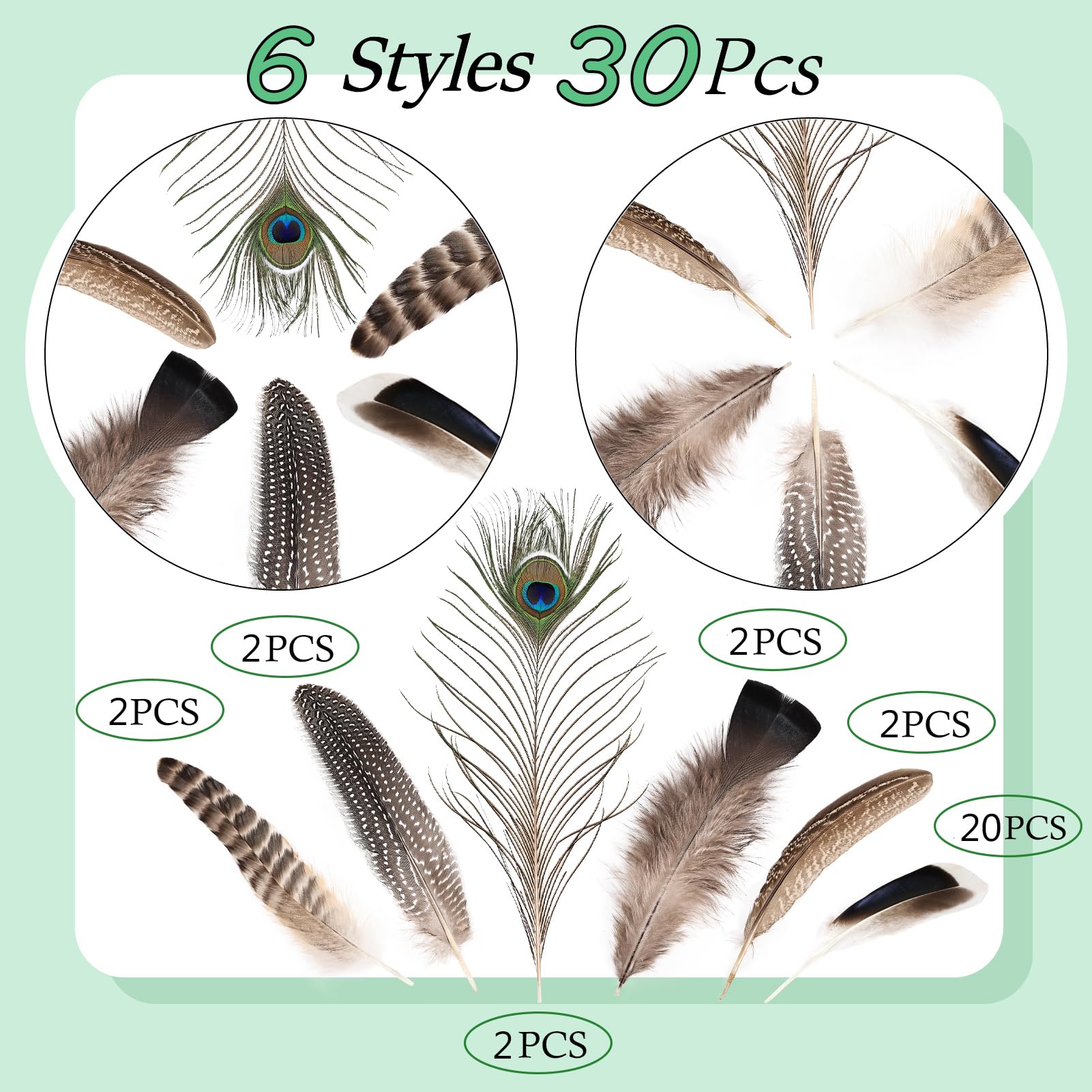 6 Styles 30pcs Natural feathers: A pack of 30pcs mixed natural feathers in 6 different styles. Perfect for DIY Crafts, Wedding, and Crafting supplies