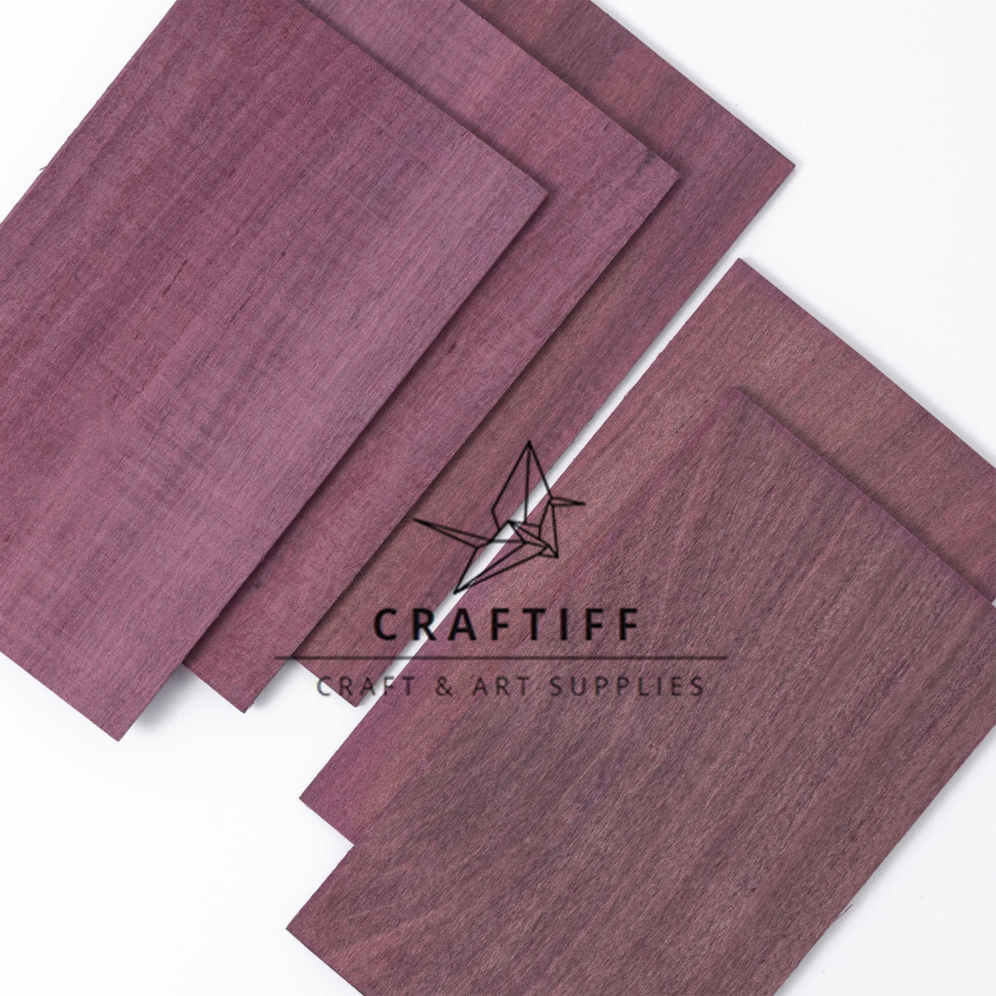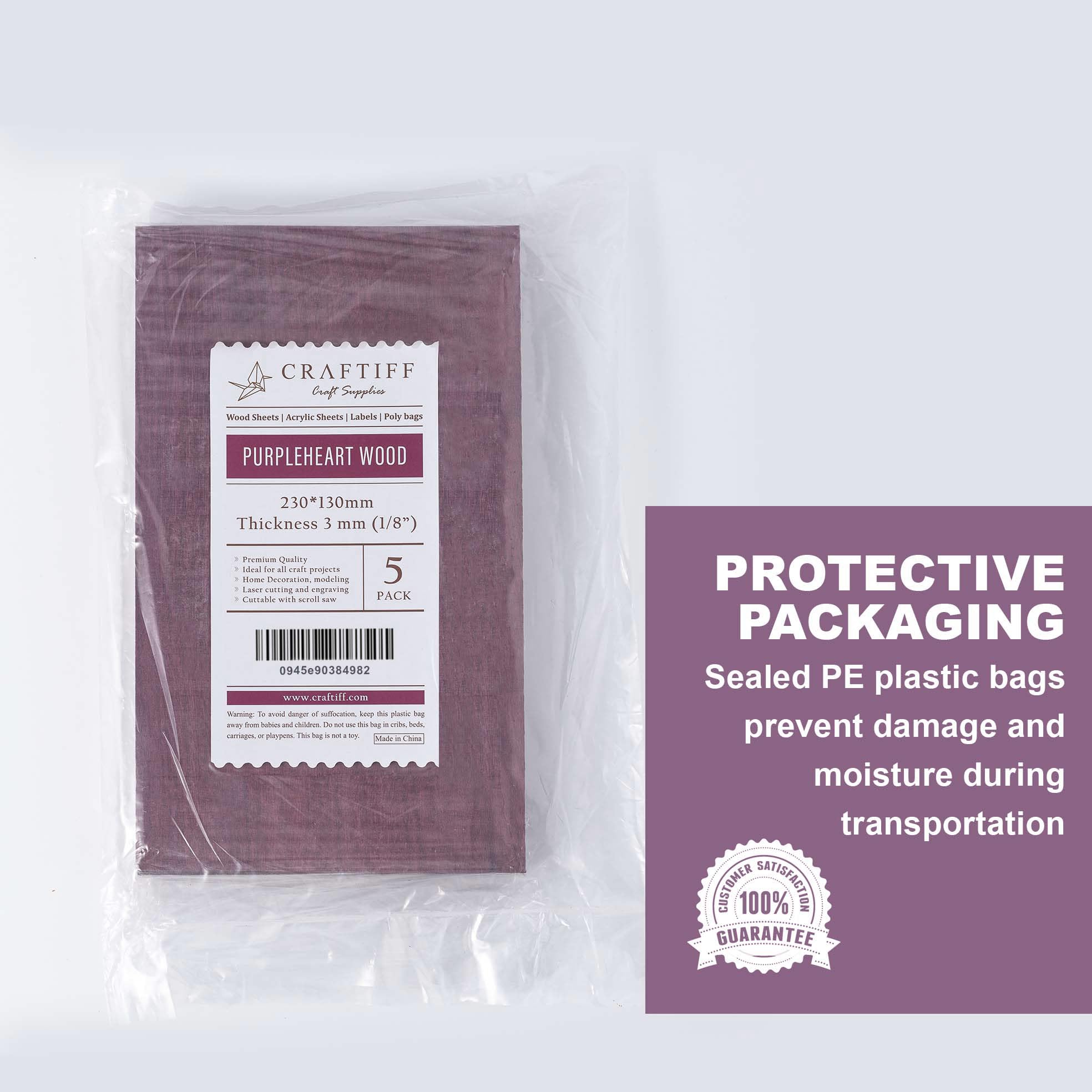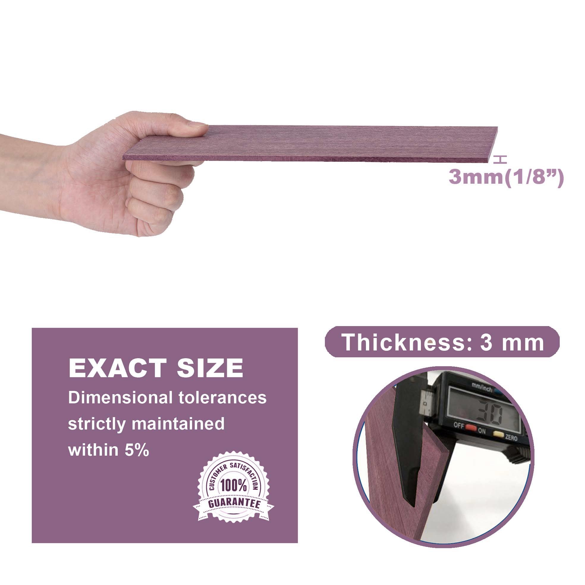 【MATERIAL】: Purple heart wood with beautiful grain. Color varies from purplish brown to eggplant purple. Sometimes dark brown with a hint of purple. Unfinished, hard, dense and tight-grained purpleheart lumber board. 【DIMENSION 】: Five pieces of 9 x 5 inches (230*130 mm) with a thickness of 1/8 inch (3mm) purpleheart wood. 【USAGE】: Perfect material for DIY projects, accessories, small furniture, coasters, and etc. 【DETAILS】: Engraving, Laser marking and cutting friendly, high workability. May require saw blades and drill bits to cut and shape, can be polished with sandpaper. 【PACKAGING 】: Thick PE plastic bags to protect the bundle of purpleheart wood from bending and scratches during transport.