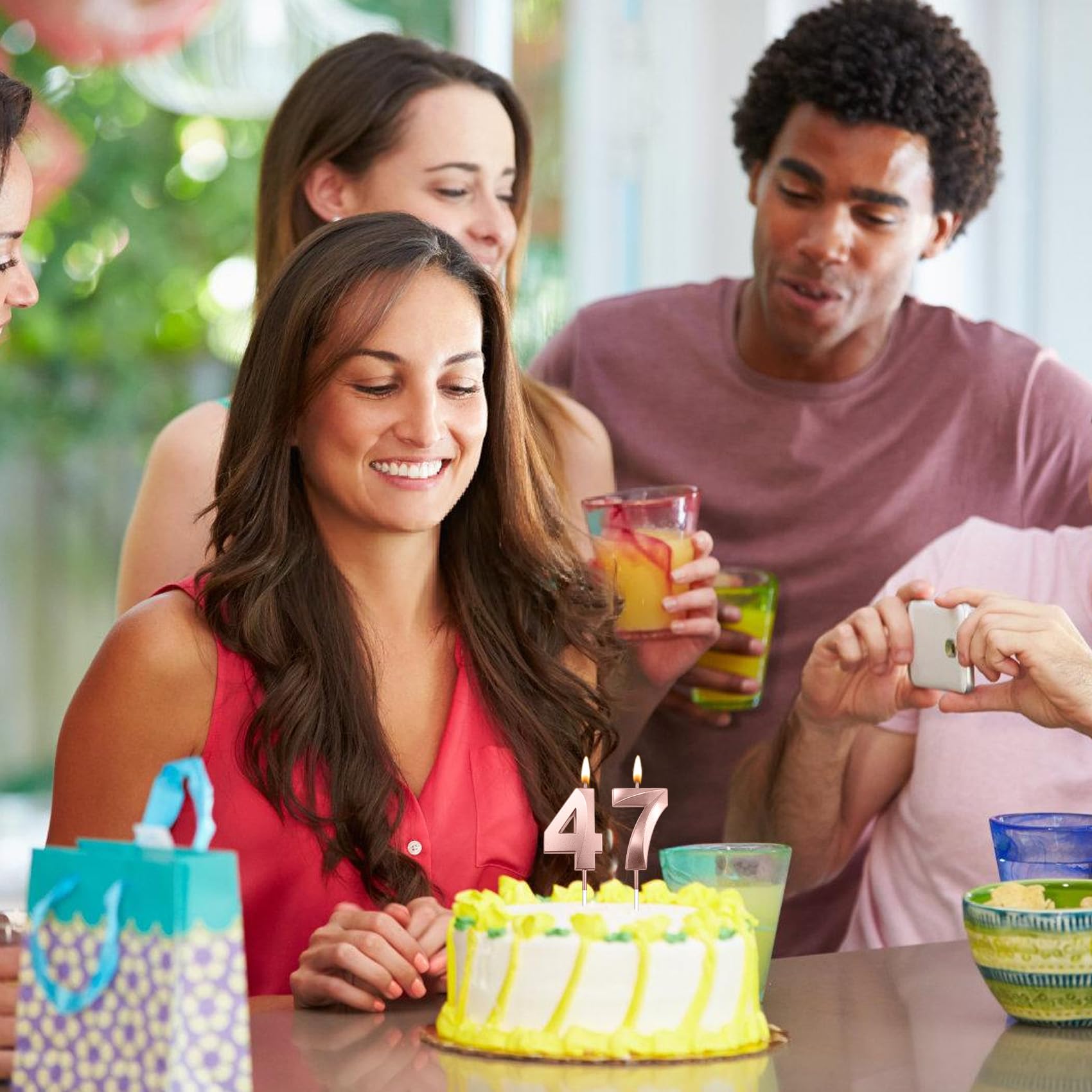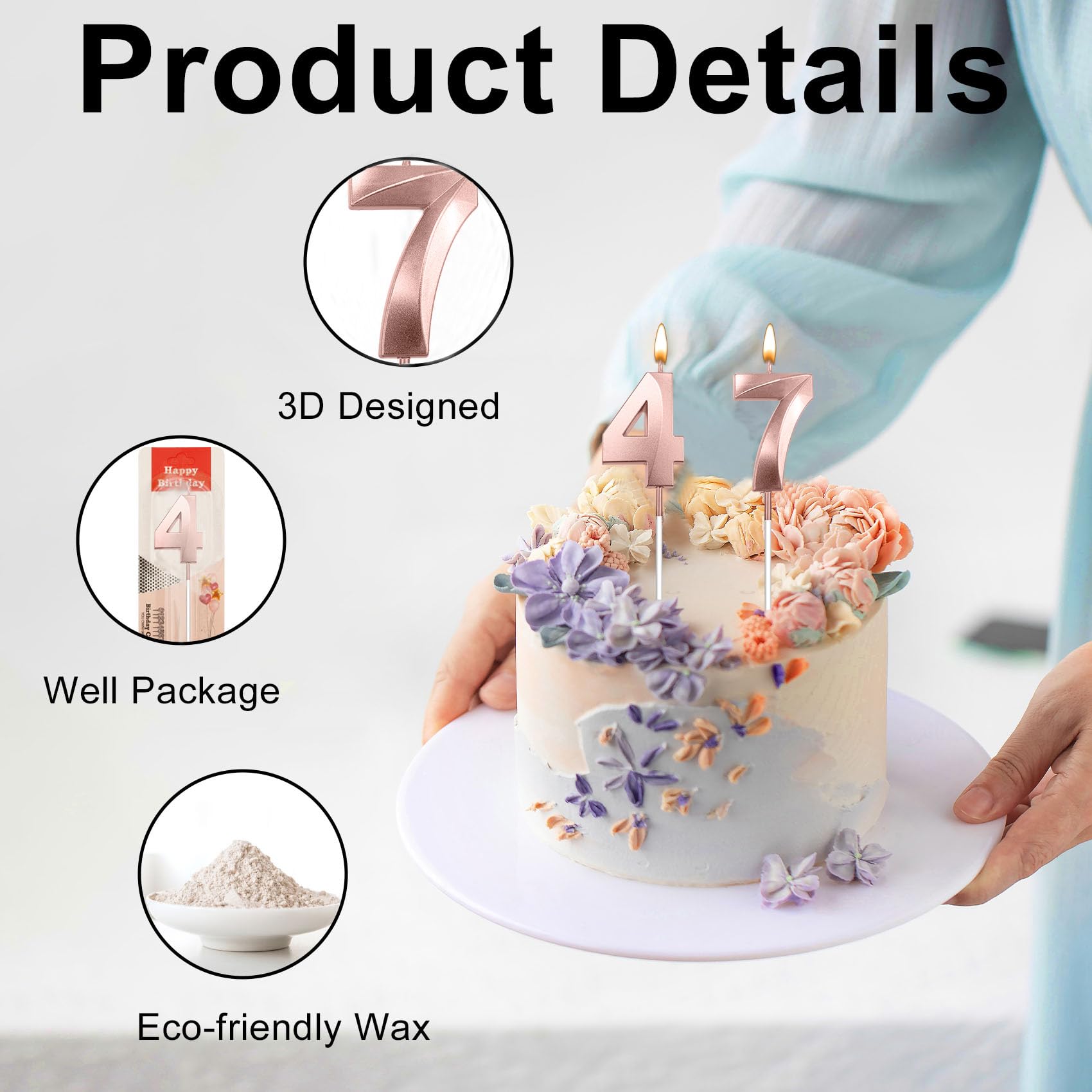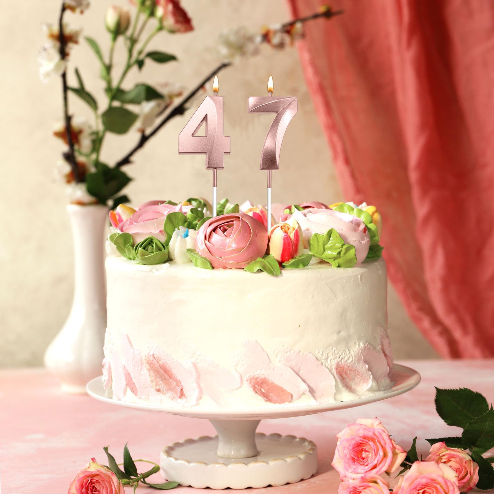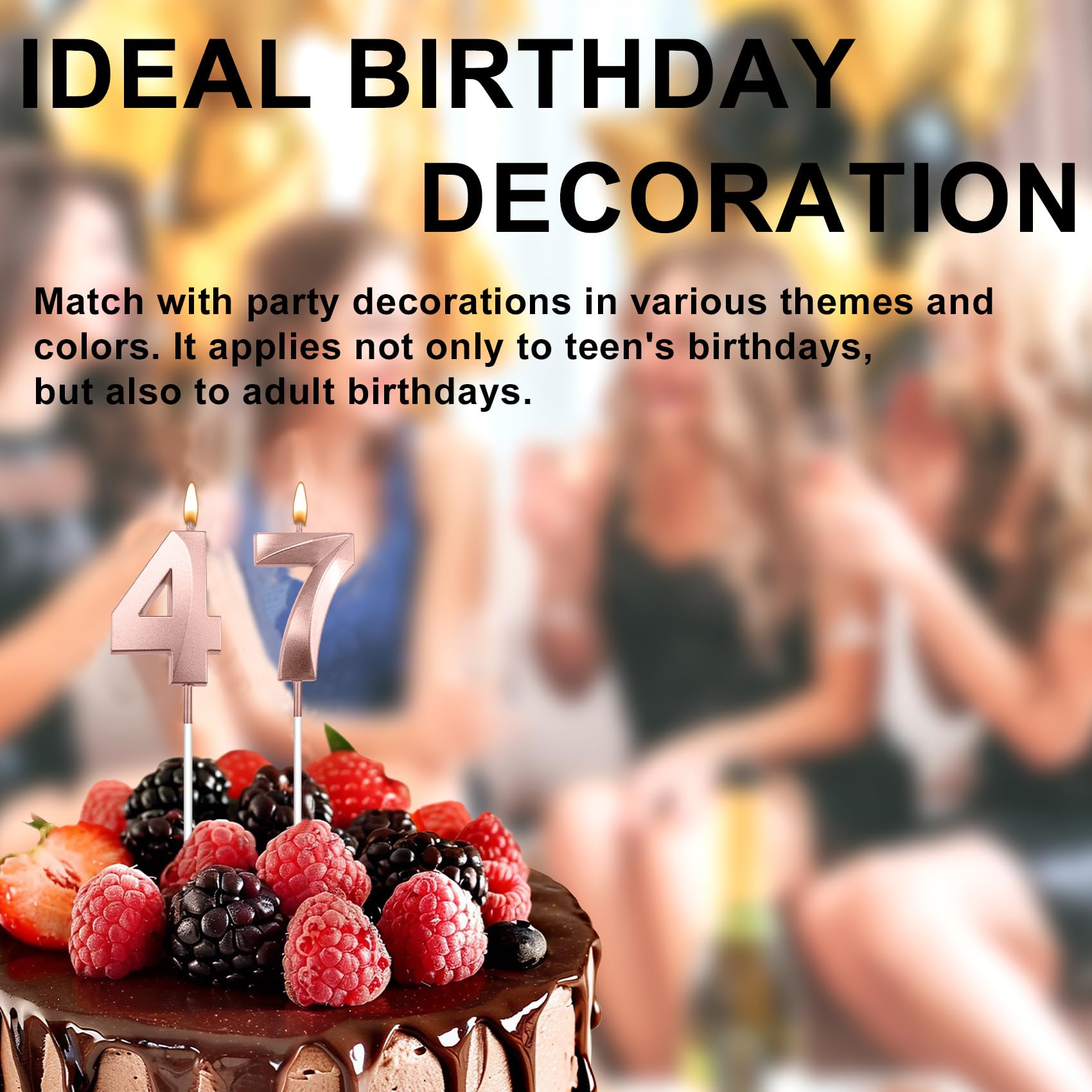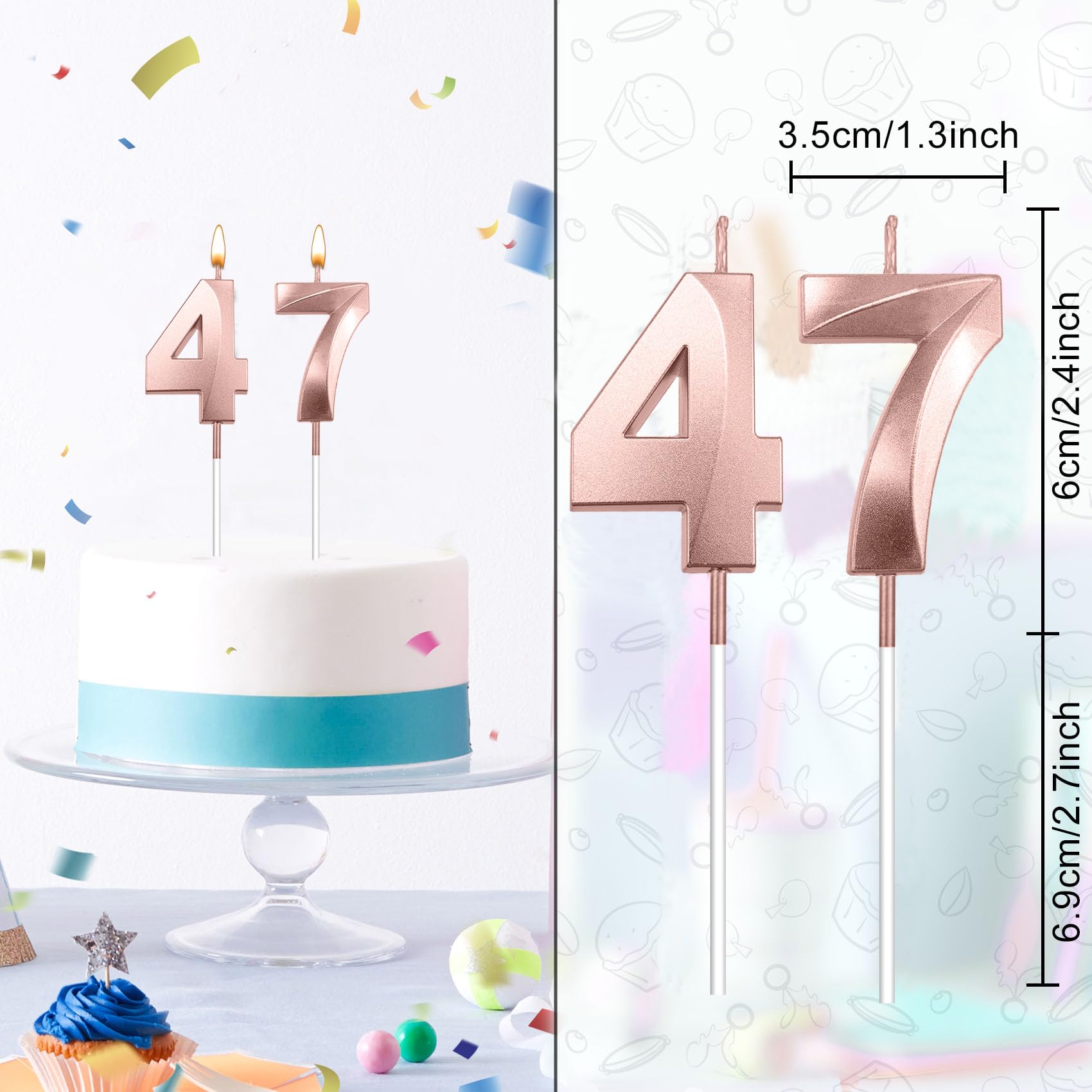 Vibrant 3D 47 candles for cake: Package contains two matte-rose gold birthday candles for cake —featuring number 4 candle and number 7 candle —that together form a sparkling "47" or"74" display. In low lighting, 47 cake topper add a elegant glow, making them perfect for decorating cake, cupcakes, and desserts. A wonderful way to help create memorable birthday moments. number birthday candles 47th birthday gifts for women 47 birthday decorations for him happy 47th birthday party favors