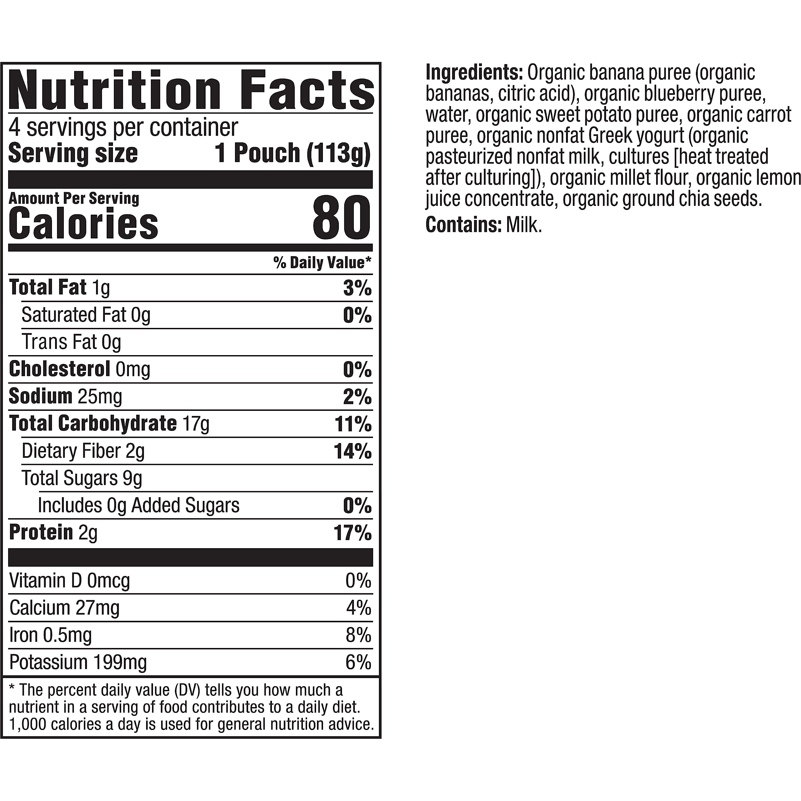MADE WITH NATURAL FLAVORS: Contains organic banana puree, organic blueberry puree, organic sweet potato, organic carrot, and organic Greek yogurt