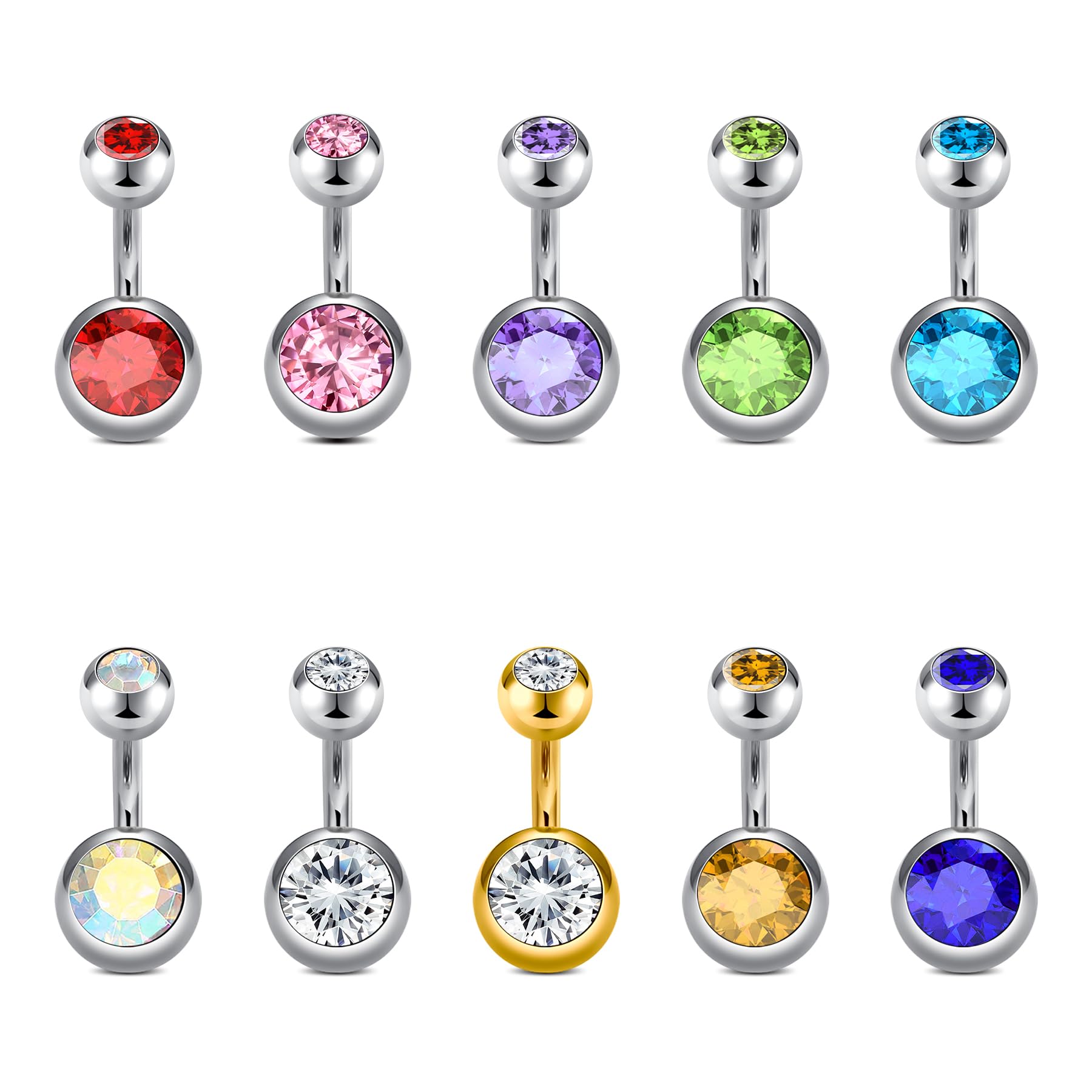 Package: 10pcs Stainless Steel short Belly Rings, Classical Round Style With Multiple Color CZ In This Pack