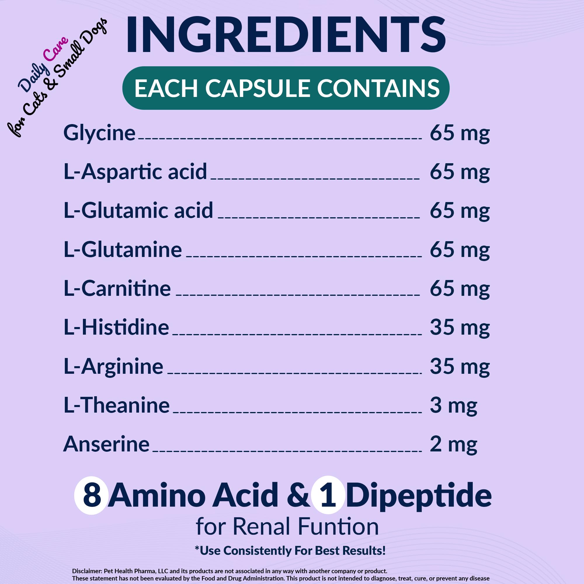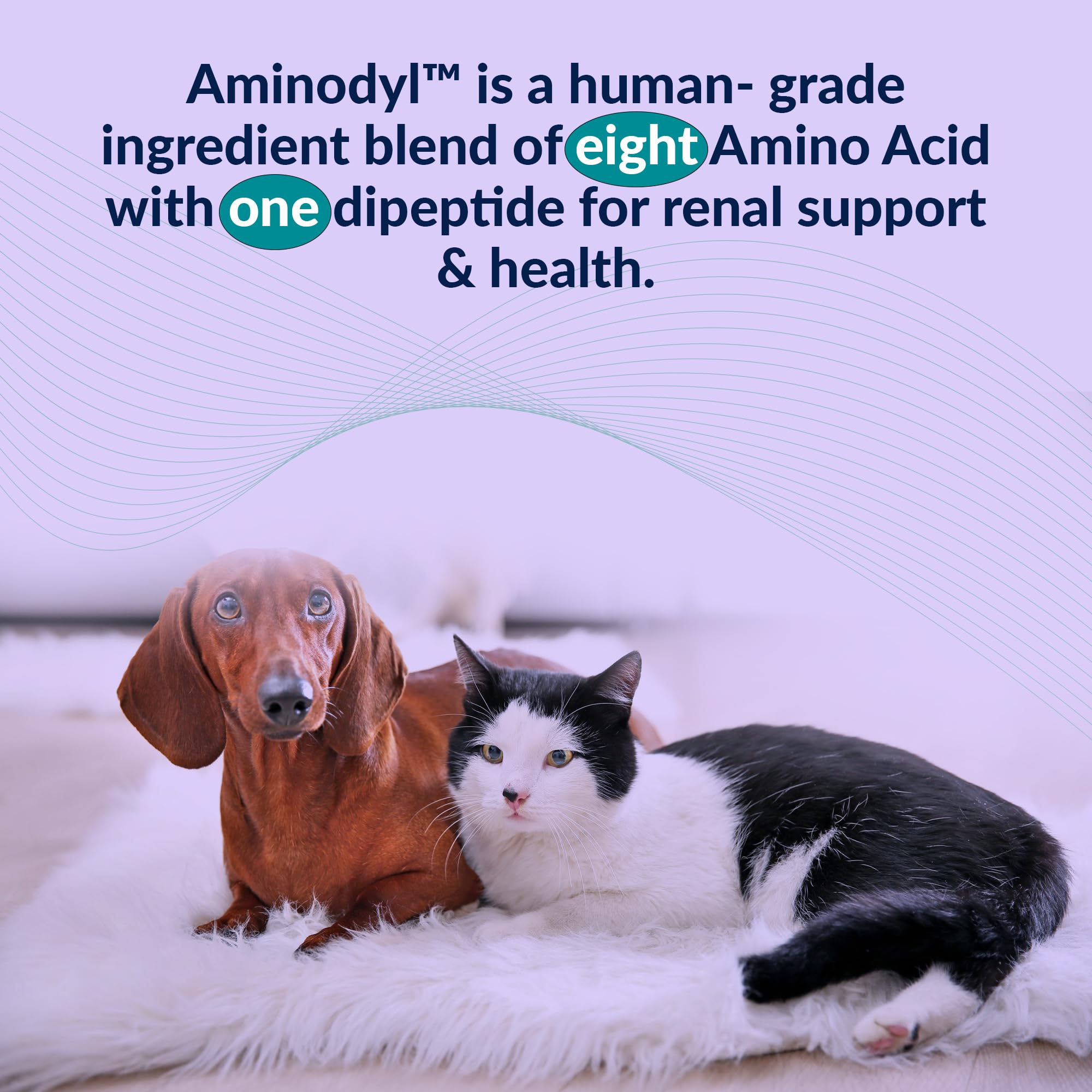 AMINODYL DAILY SUPPORT FOR RENAL HEALTH: Aminodyl consist of naturally occurring 8 amino acids and a dipeptide can help support healthy renal function in cats and dogs. (Glycine, L-Aspartic acid, L-Glutamic acid, L-Glutamine, L-Carnitine, L-Histidine, L-Arginine, L-Theanine, Anserine)