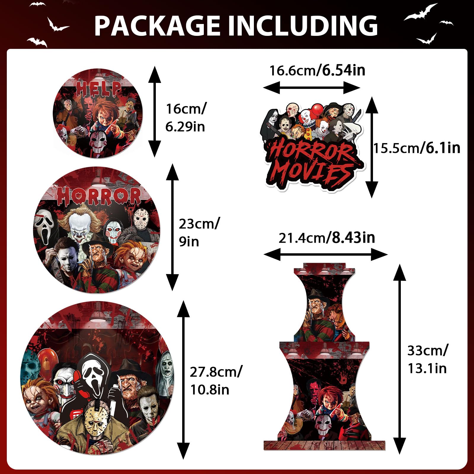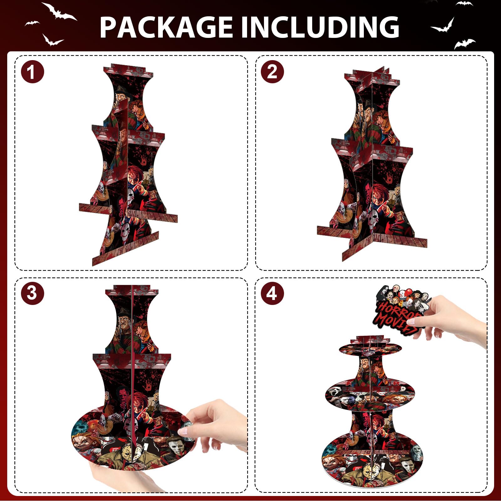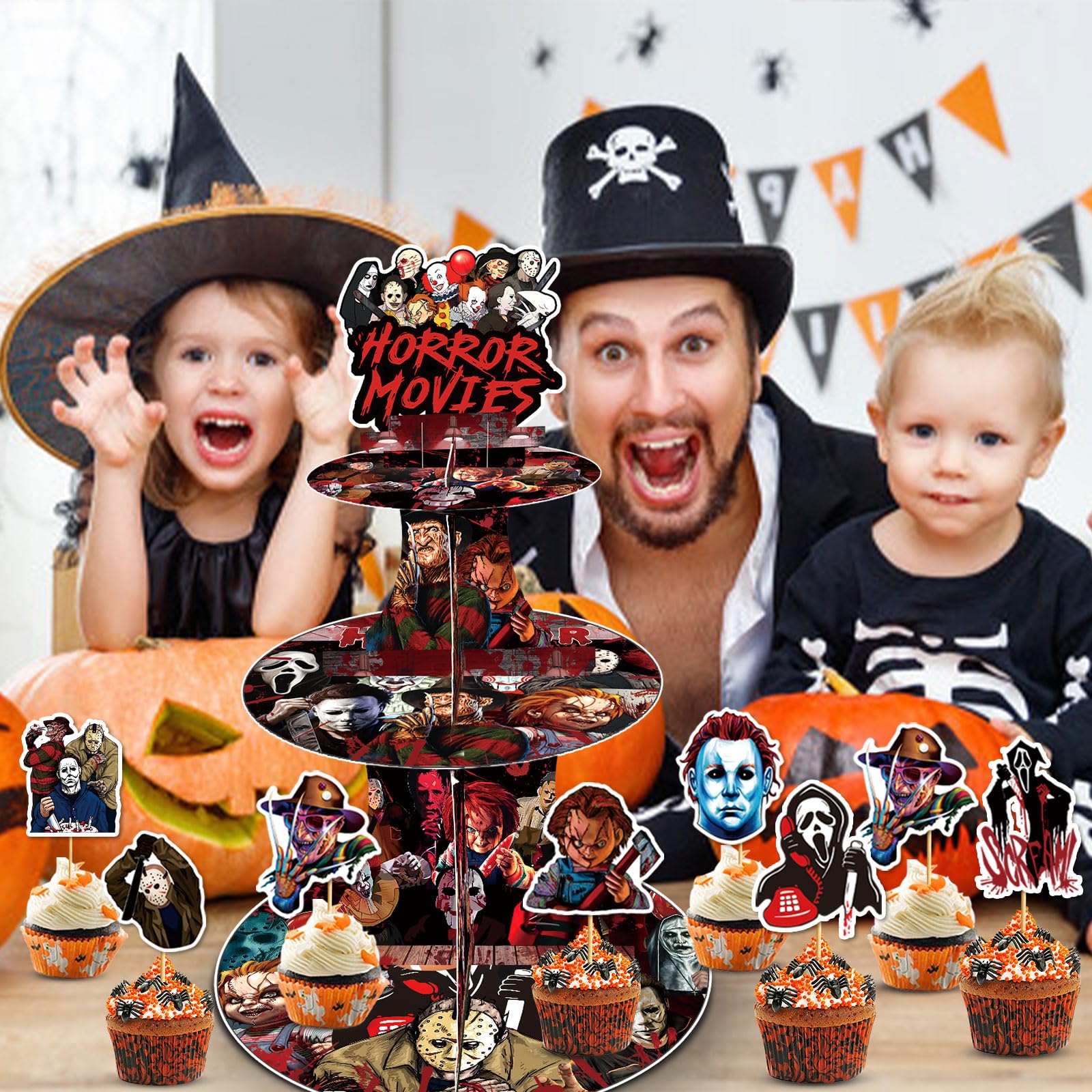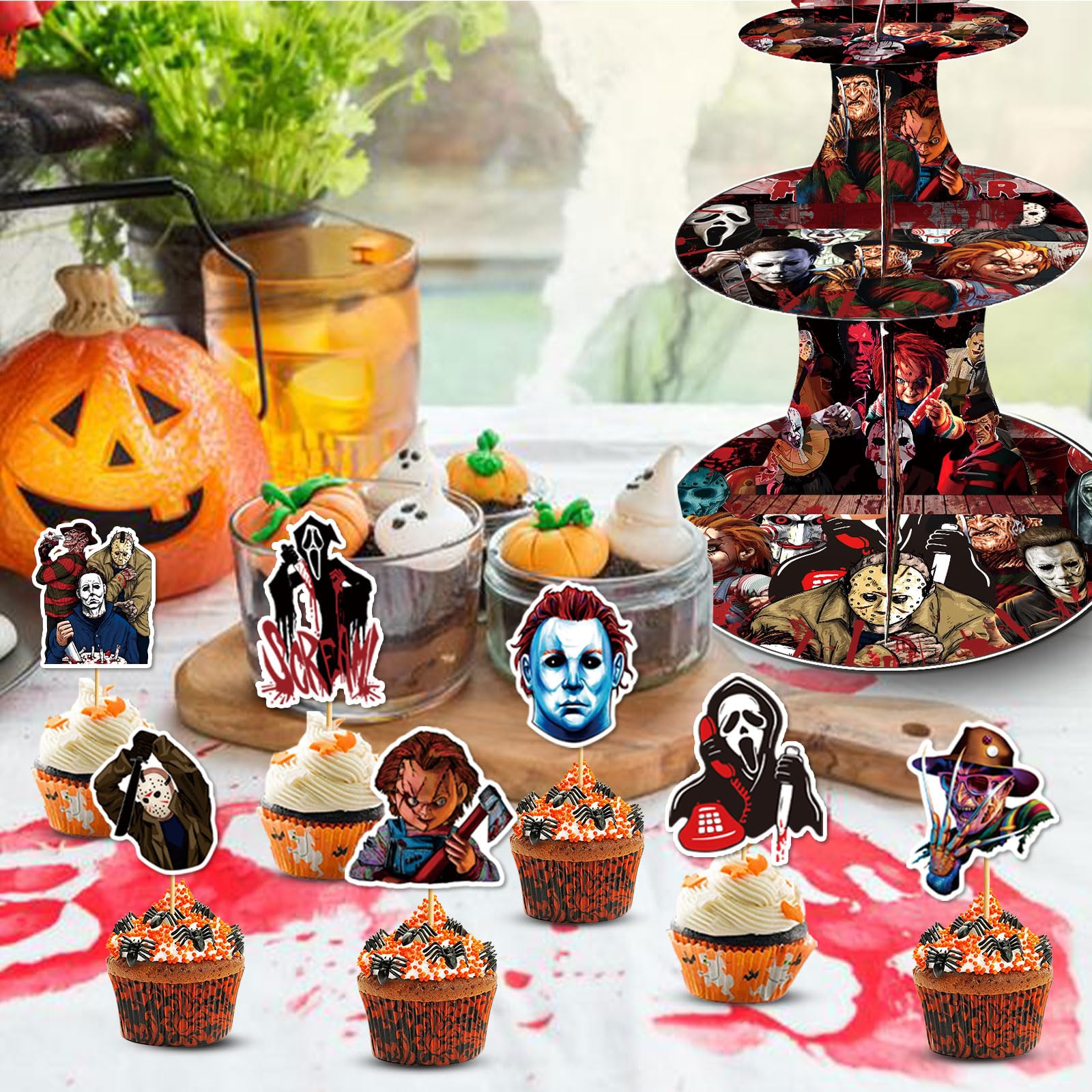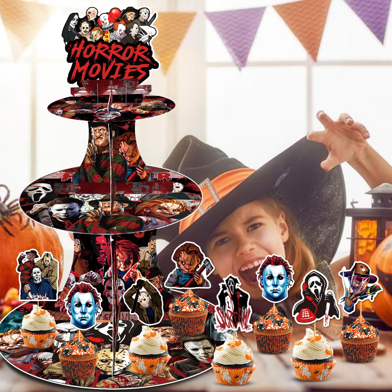 Package Includes: 1*3 tier Halloween horror themed party decorations, 14*Halloween cupcake toppers with 7 styles, perfect for your horror birthday party decorations.