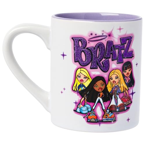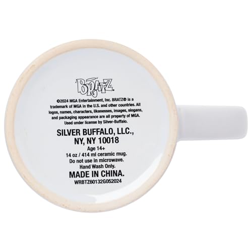 Sip in style with this ceramic mug! Themed mug features iconic Bratz characters including Cloe, Jade, Sasha, and Yasmin. Featured above the characters is the Bratz logo complete with a glitter finish. Mug is complete with fun airbrush colors and a purple interior. NOT microwave or dishwasher safe. HAND WASH ONLY. This 14 ounce mug is ideal for all of your daily beverages. Start your morning with a fashionable flair when using this mug. With its y2k designs, this glitter mug makes a great Christmas, birthday, or housewarming gift for Bratz fans of all ages. Take a dive into the fictional world with Silver Buffalo! Silver Buffalo provides fans with official merchandise from their favorite characters. Working alongside licensors and brands, we create unique and imaginative products which are designed with great care and detail. Silver Buffalo aims to connect fans to their favorite cartoon characters, superheroes, movies, tv-series, and more. Celebrate your fandom!