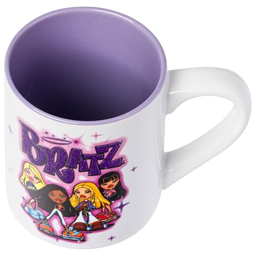 BRATZ MUG: Themed mug features iconic Bratz characters including Cloe, Jade, Sasha, and Yasmin. Featured above the characters is the Bratz logo complete with a glitter finish. Mug is complete with fun airbrush colors and a purple interior.