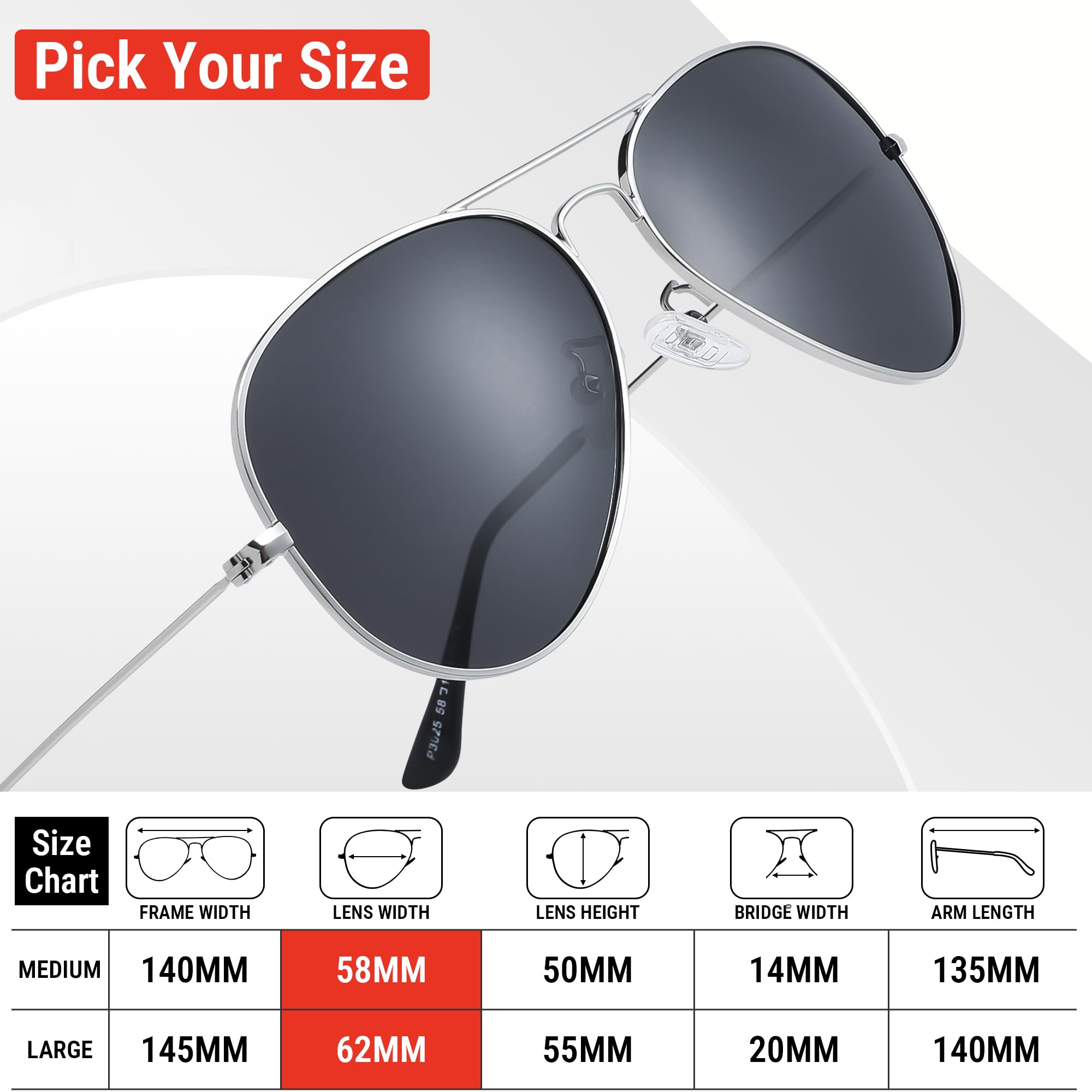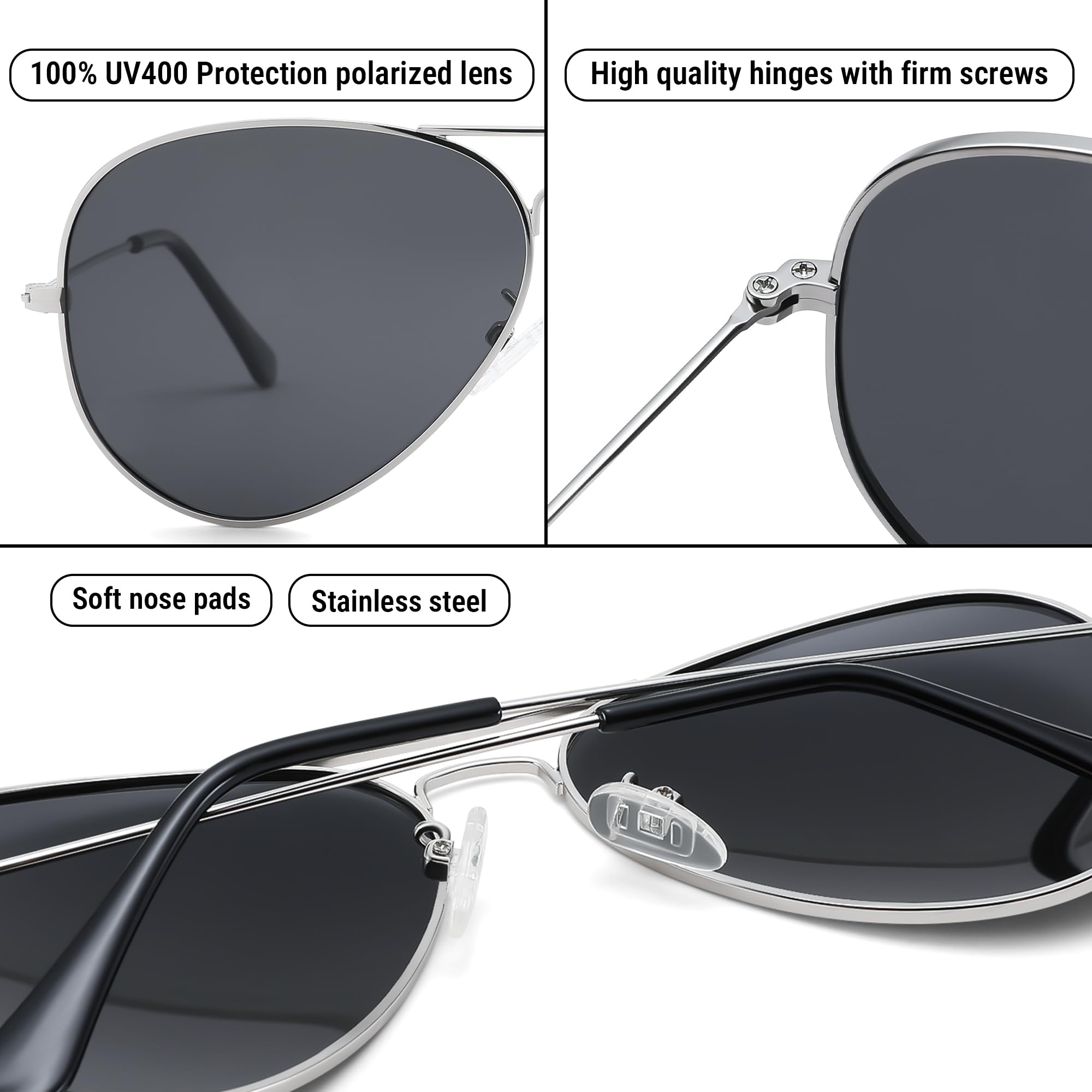 Polarized Protection: During outdoor activities, high-quality polarized glasses provide 99.9% UV400 protection and efficiently decrease glare. The classic aviator sunglasses are suitable for driving, cycling, fishing, and outdoor activities
