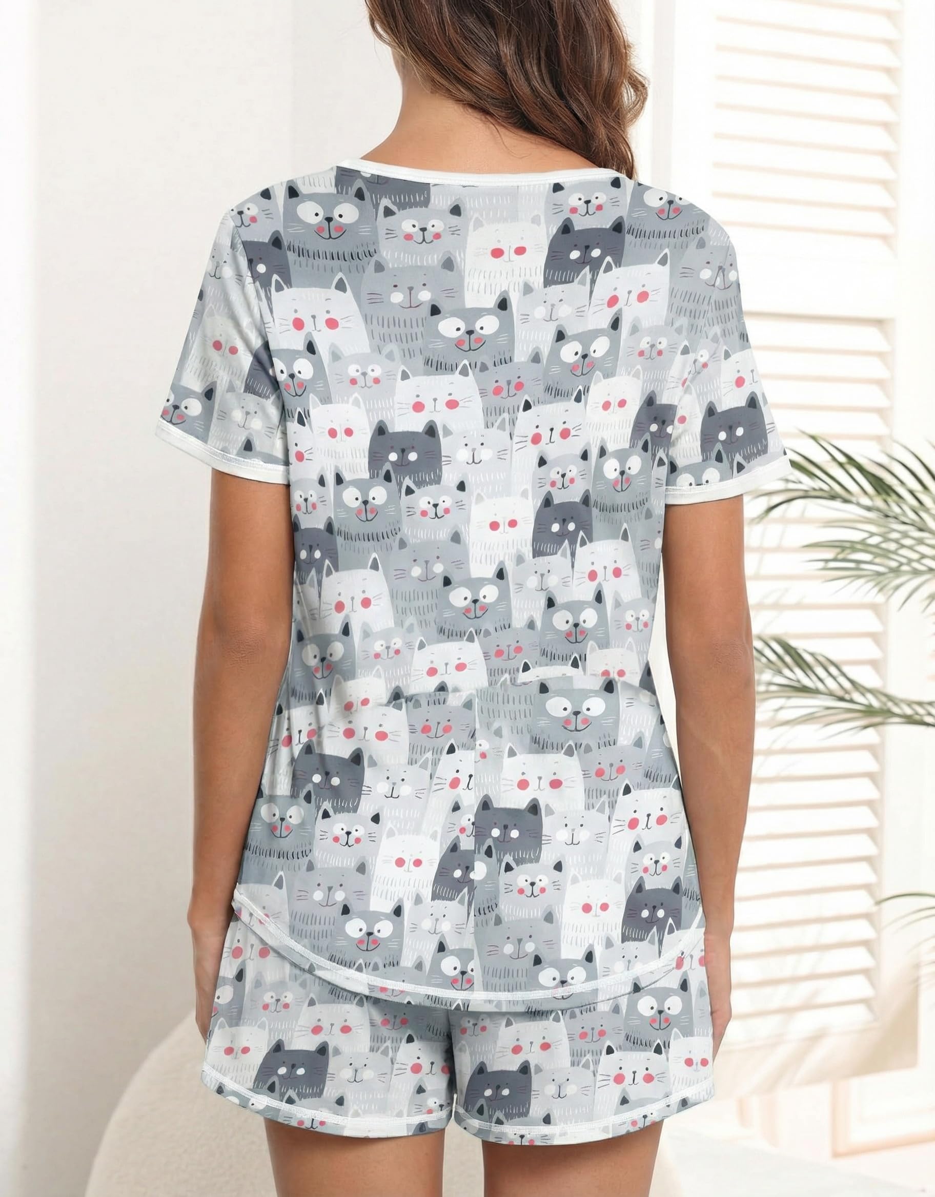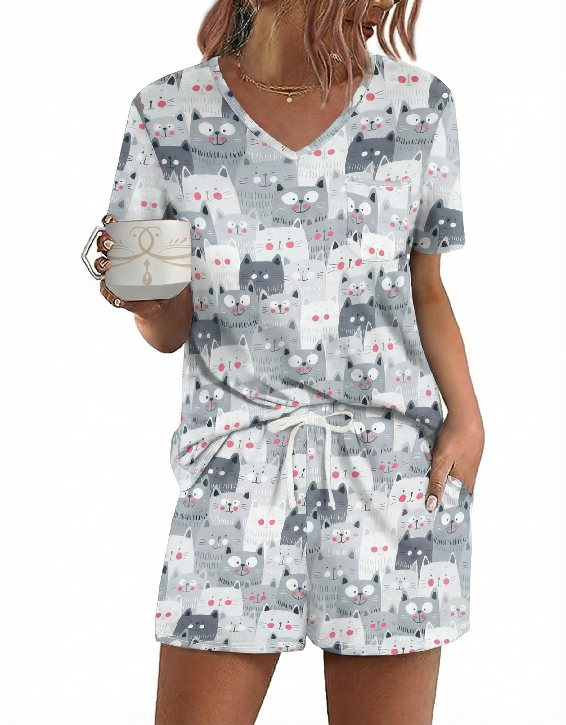 Design: The pajama top features classic chest pocket and V neck, with exquisite hemming workmanship; the pajama shorts features adjustable drawstring and pockets. Loose fit lounge sets, cute and comfy pajamas for women and teens girls