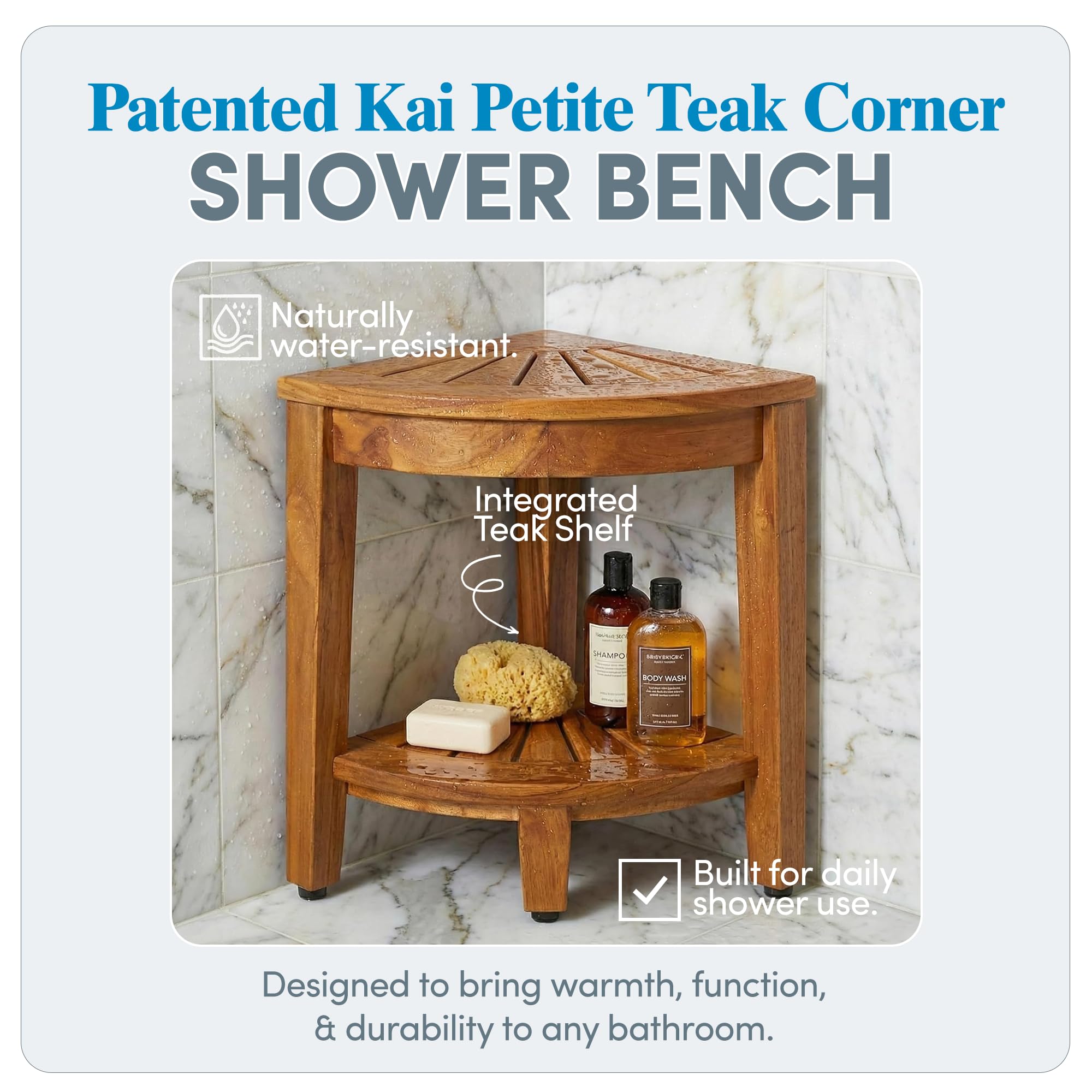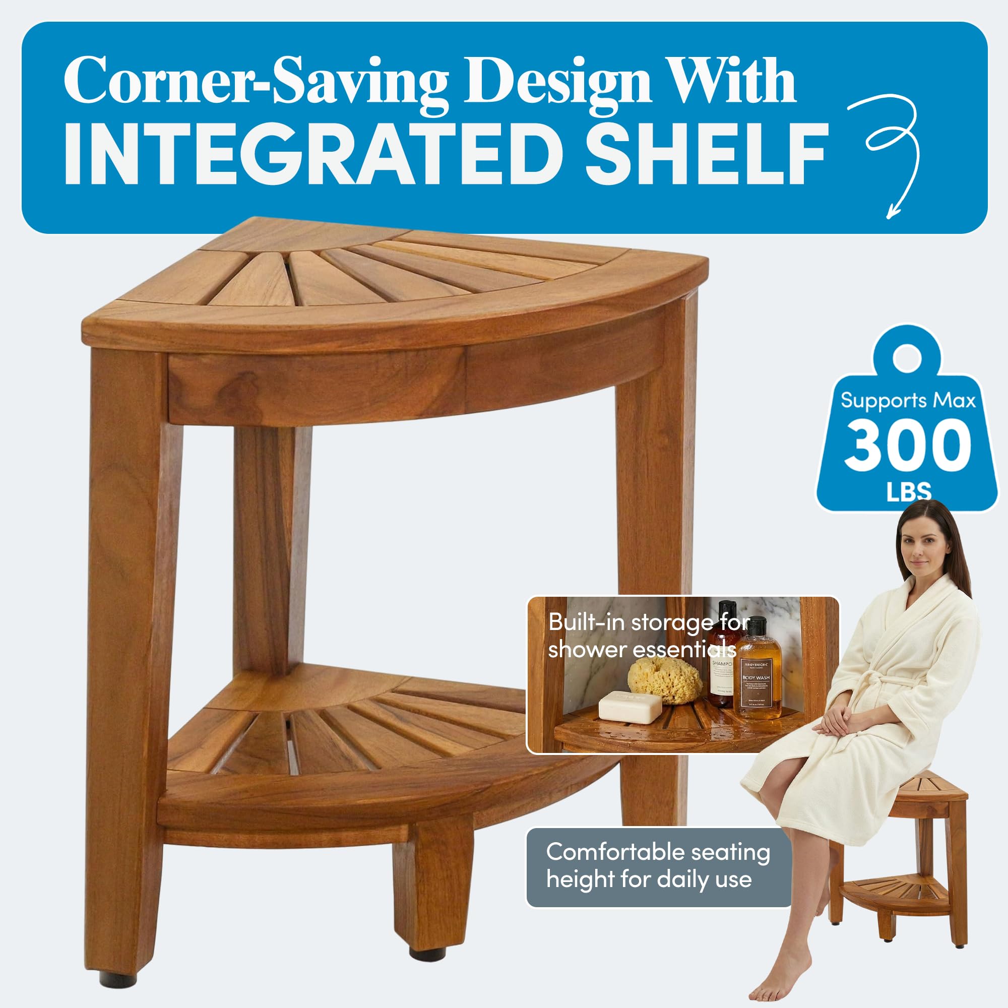 Smart Storage Design: Built with all stainless steel, non-corroding screws, this teak wood bench is built to last. Designed with a built-in corner shelf, it helps you organize your bathroom essentials. Keep your soaps, towels, or razors easily accessible while maintaining a clutter-free space. Ideal as a shower organizer or bathroom shelf, this bench maximizes both functionality and style.