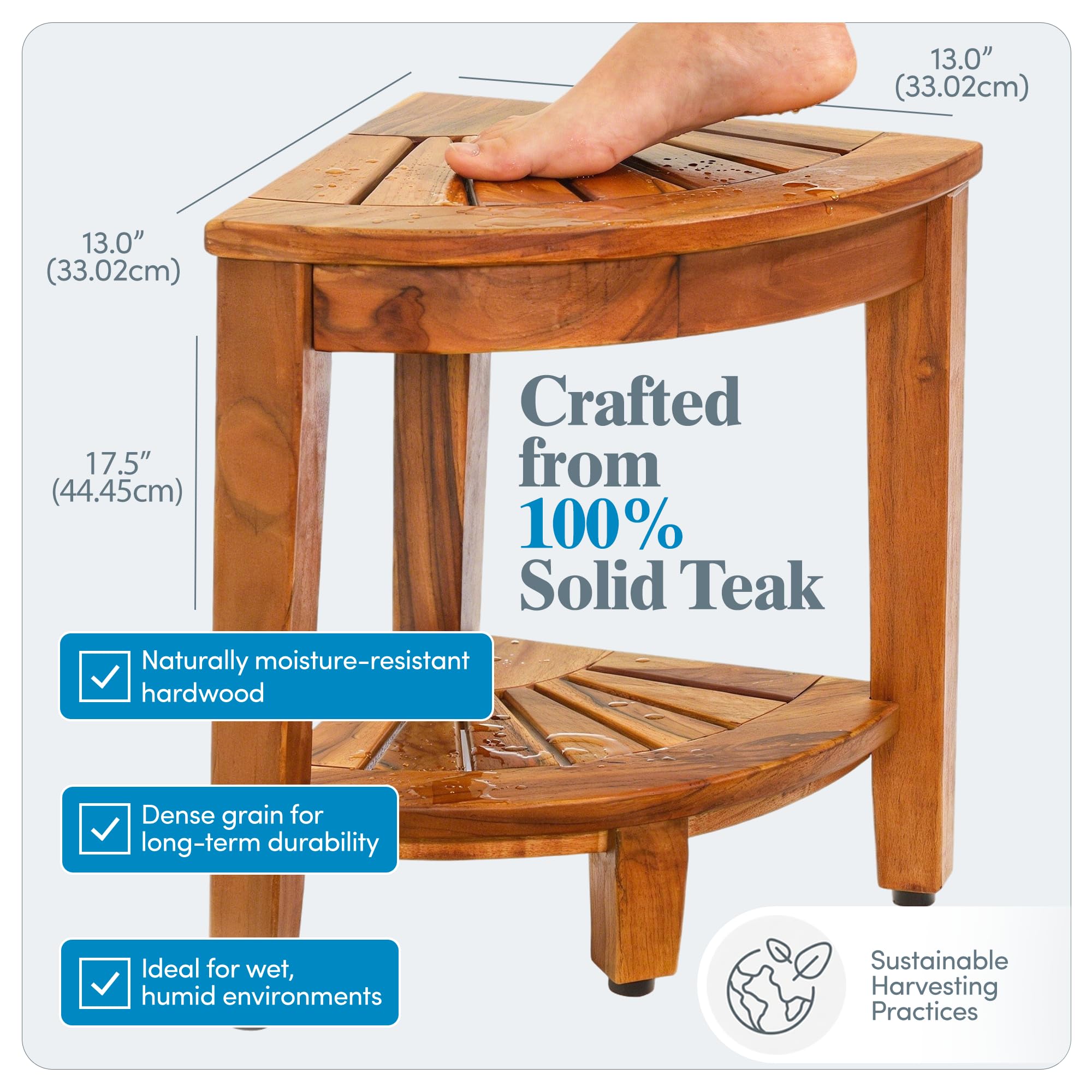 Premium Teak Wood for Durability: Crafted from sustainably harvested, premium Indonesian teak wood, this shower bench is designed to withstand humidity and resist water damage and allow water to flow through, preventing pooling & offering long-lasting performance. Ideal for bathroom furniture, this durable teak wood bench is the prime addition to your shower or bathroom decor.