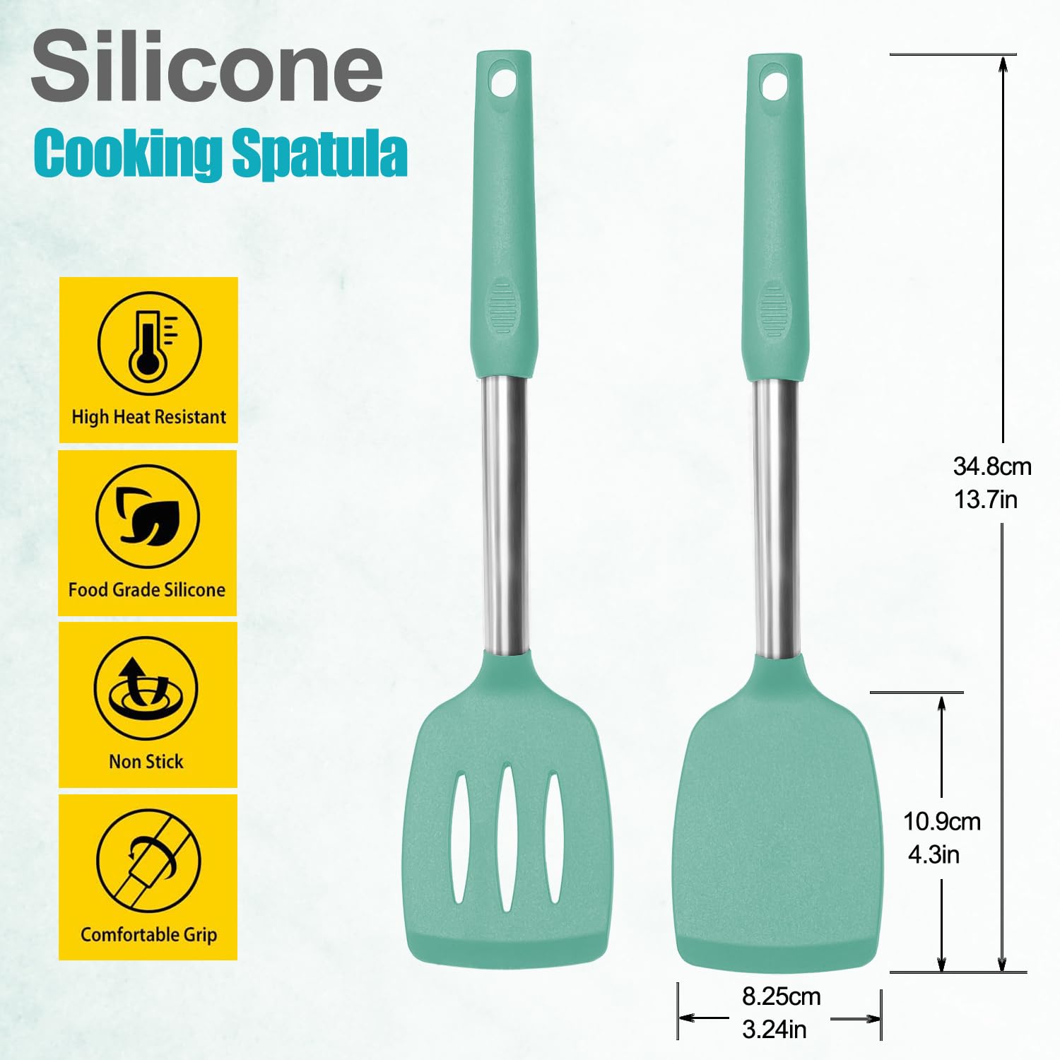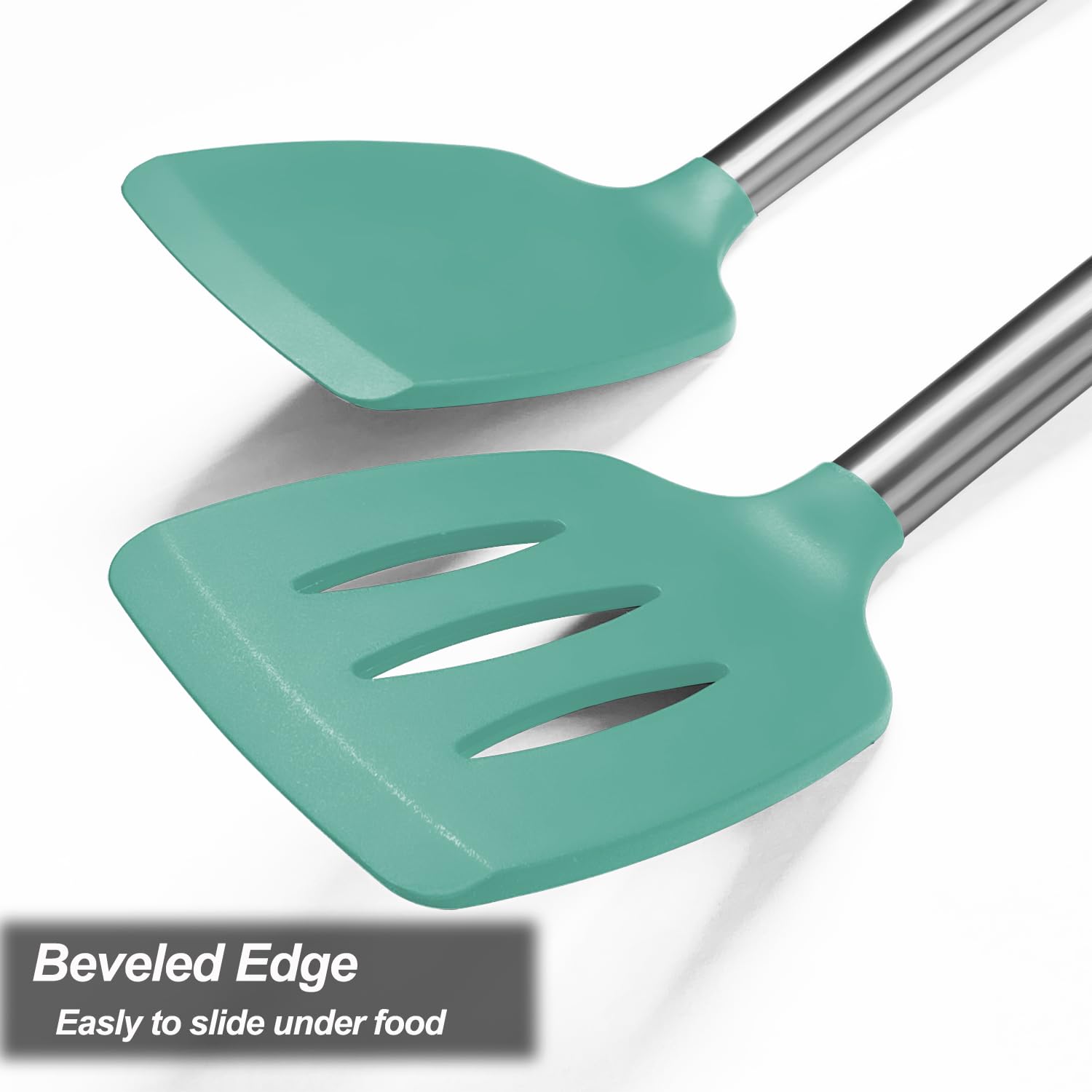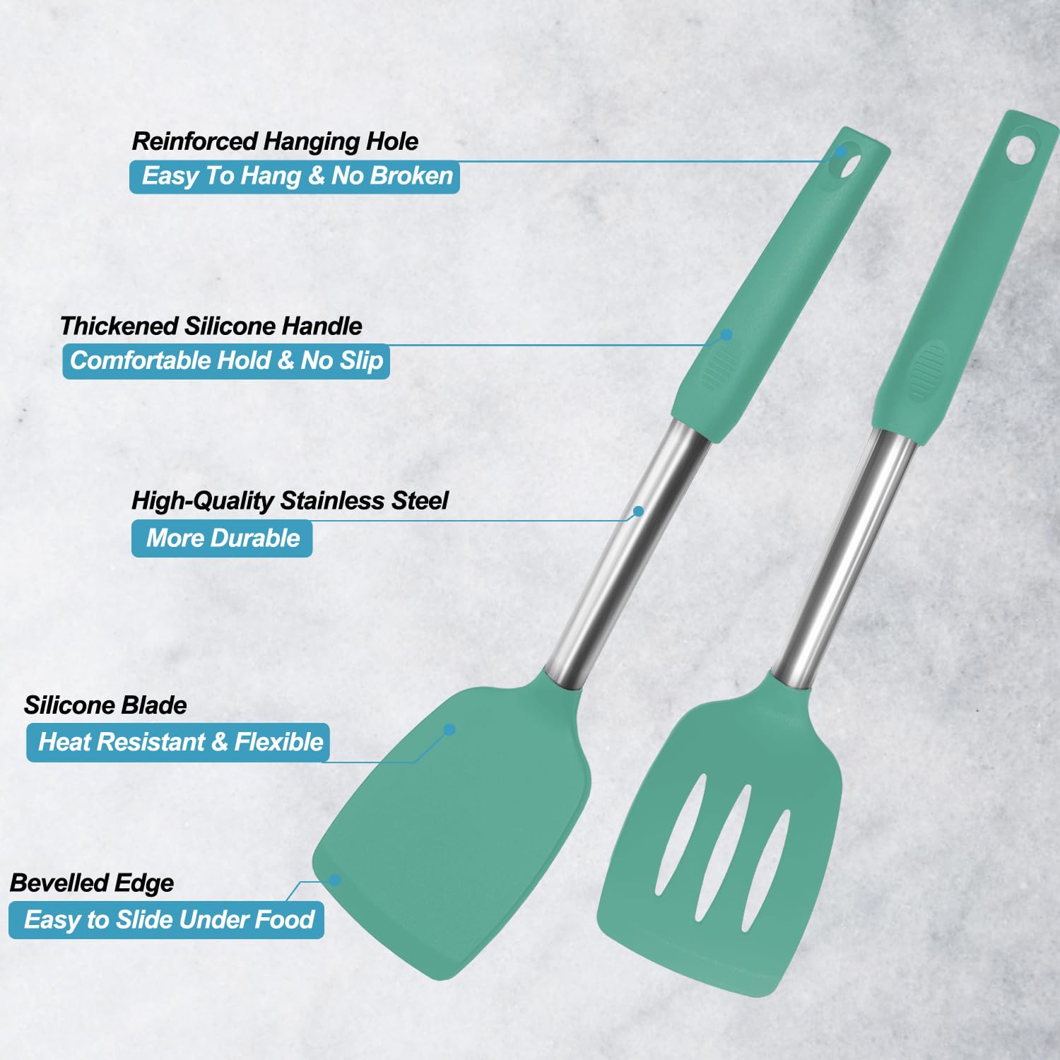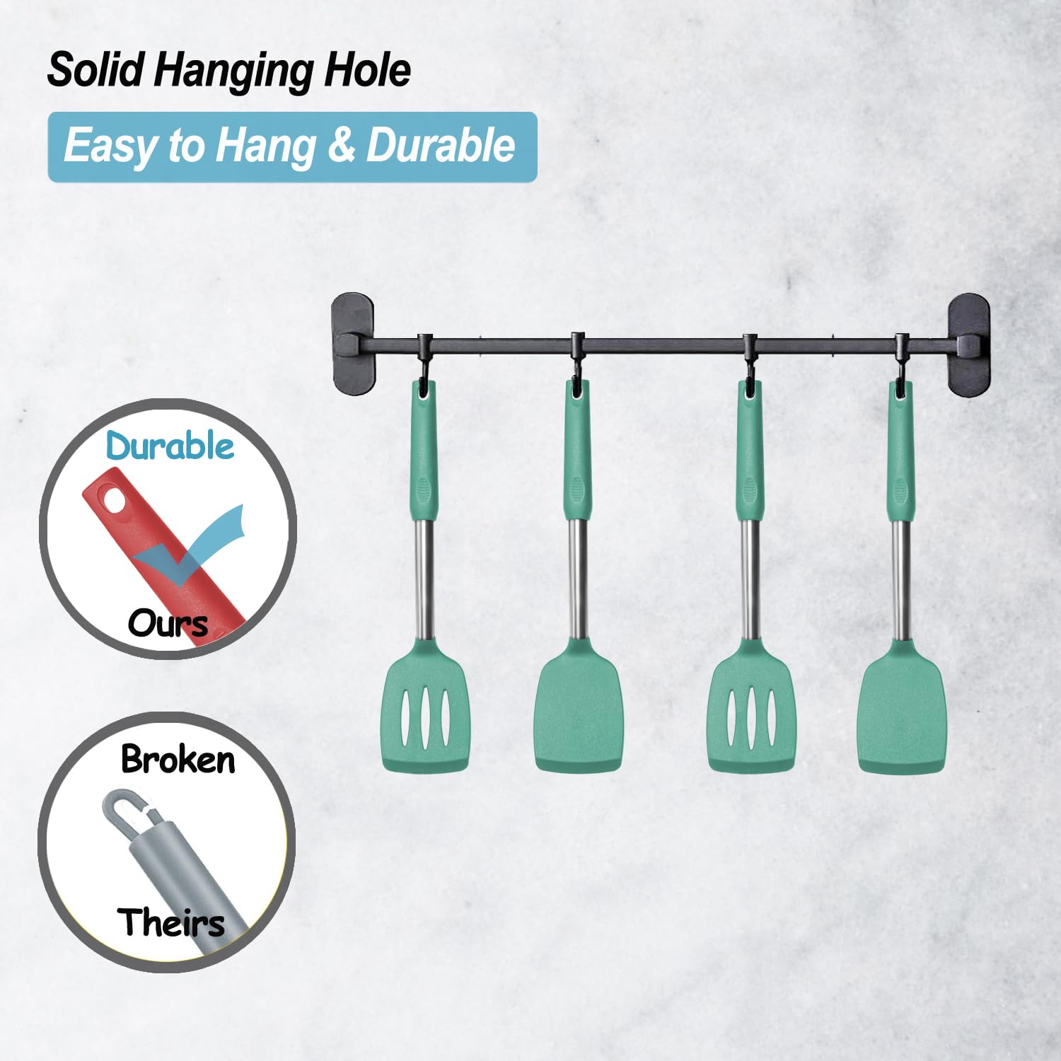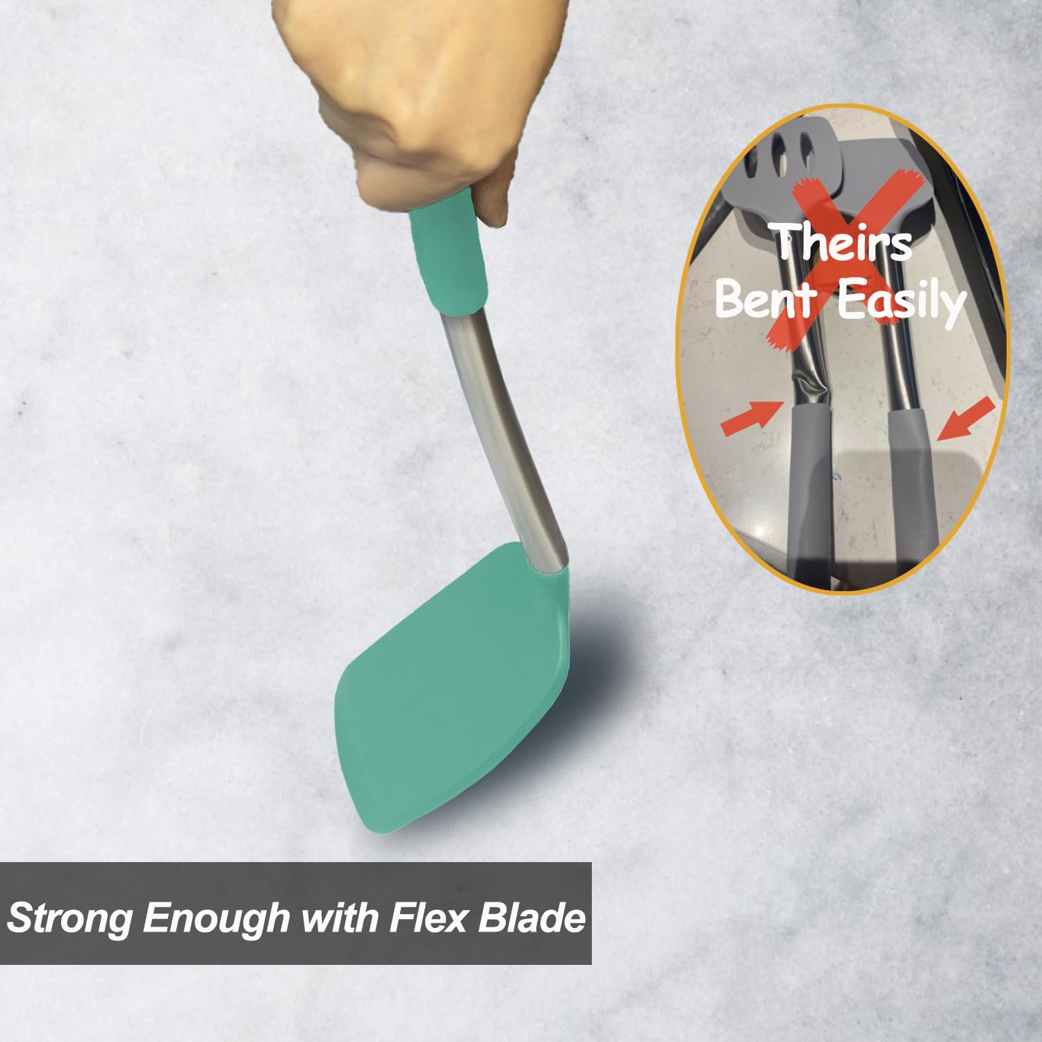 Lasting Long: This silicone spatula set turners are made of high quality stainless steel, premium silicone with thoughtful design, to avoid blade and handle melting, and the strengthened hook is noway to break as other generics