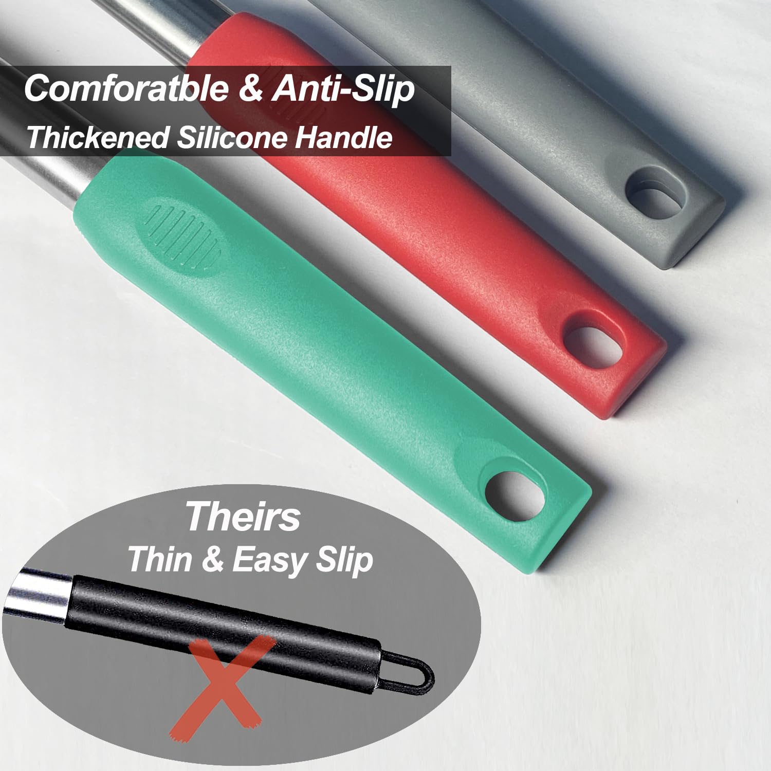 More Comfortable Handle: Unlike other generics, we upgrade the handles; The stainless steel handle core is coated with thicker silicone, it is more durable, and isolate heat better; The profile is ergomonic designed and gives your better grip experience.