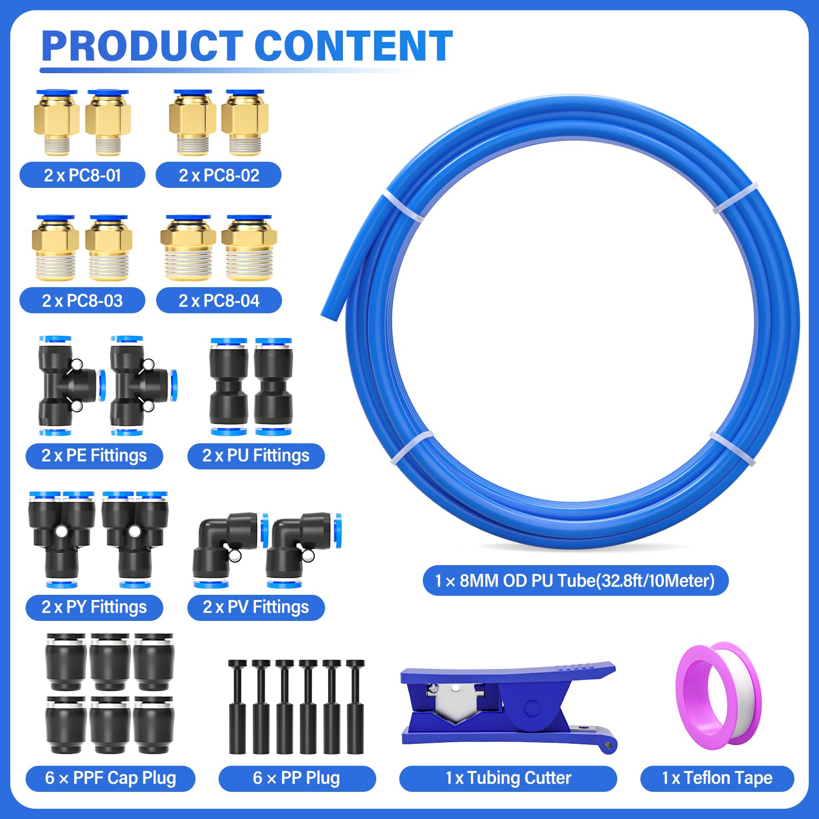 【Package Included】1 × 8mm PU Tube(10Meter),2 × PE-8(Union Tee),2 × PV-8(Elbows),2 × PY-8(Y Spliters),2 × PU-8(Straight Unions),2 × PC8-01(1/8PT),2 × PC8-02(1/4PT),2 × PC8-03(3/8PT),2 × PC8-04(1/2PT),6× PPF(8MM OD),6× PP(8MM OD),1× Teflon Tape,1× Tracheal Scissors