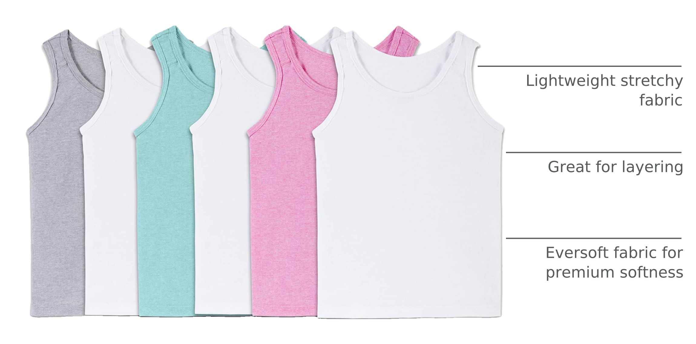 VERSATILE COMFORT: Fruit of the Loom Girls' Eversoft camisoles and tanks add essential comfort and layering options to any little girl's wardrobe, perfect worn alone or under other clothing.