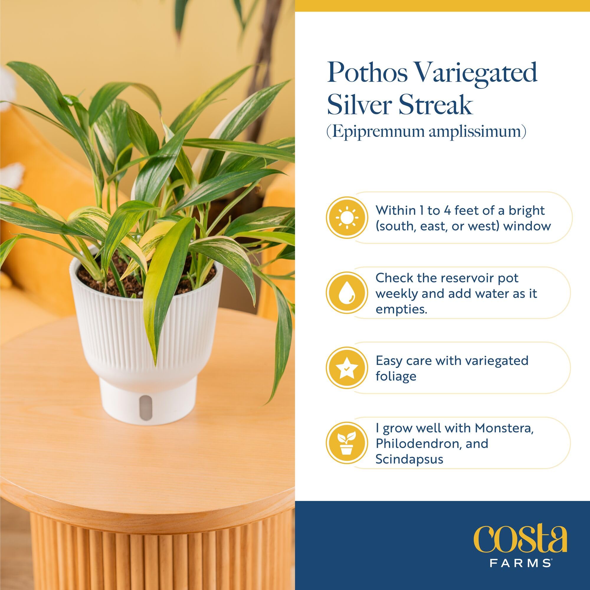 Pothos Variegated Amplissimum, also known as Silver Streak Pothos, from Costa Farms is the perfect addition to brighten your indoor space with its stunning variegated leaves and graceful vining habit. This beginner-friendly plant thrives in bright indoor light and grows moderately, making it easy to care for while adding a fresh, lively touch to your home. Water your Silver Streak Pothos with about ½ cup once a week to keep it happy and healthy. It comes in a 5-inch decor pot, ideal for tabletops, shelves, or hanging baskets. This versatile plant complements modern, boho, or classic décor styles - bring your own style by pairing it with a decorative pot that matches your personal aesthetic. Note:This plant may have some natural degree of toxicity and may cause discomfort or illness if ingested. Additionally, exposure to the sap of this plant may cause discomfort to individuals with a sensitivity to it upon contact. Grown for ornamental purposes and not intended for human or animal consumption.