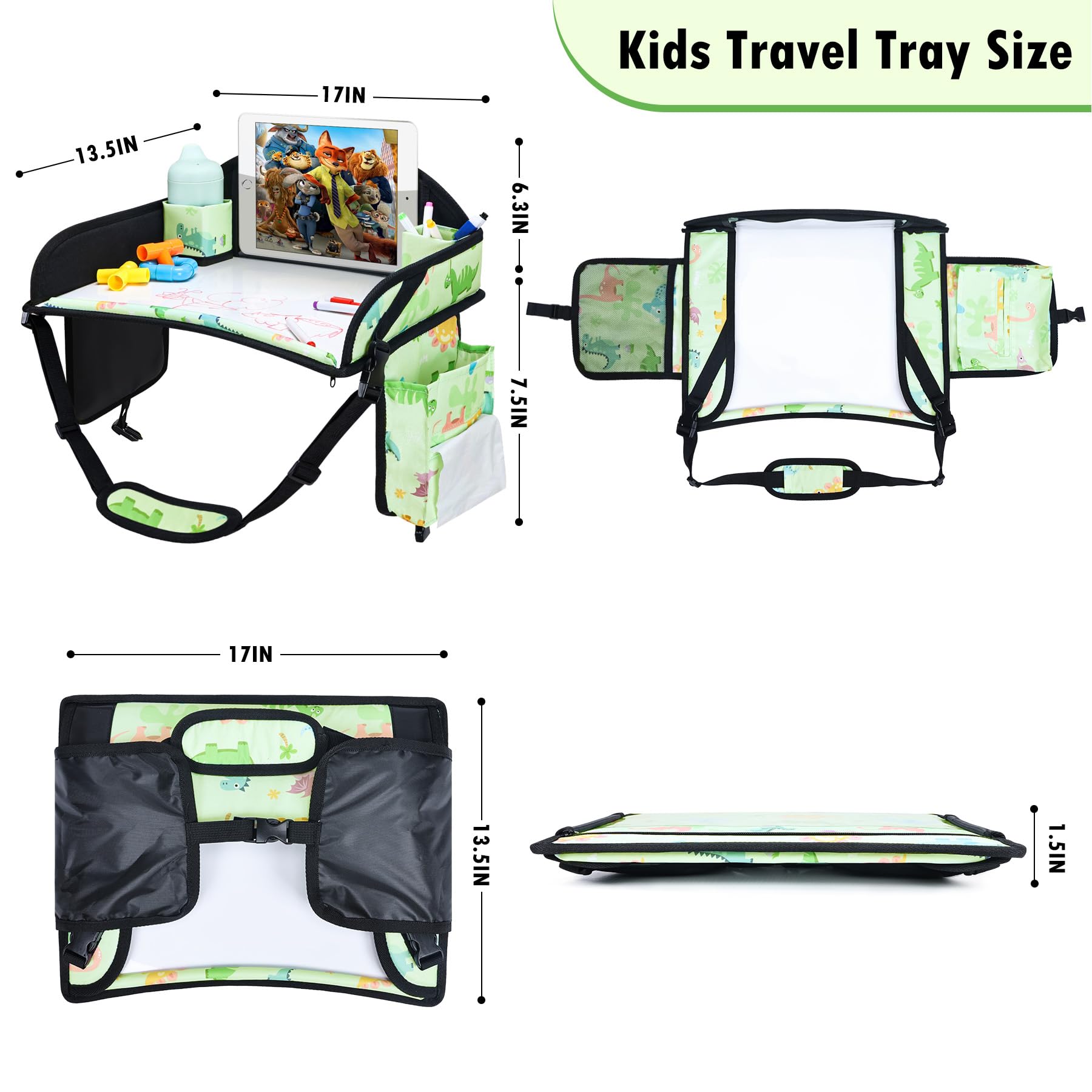 Wide Application Size: Adjustable strap and 17"X13.5"X1.5" size are suitable for most kids car seat tray or airplane seat tray, the kids travel tray strap can be adjusted according to the need to ensure the stability and comfort, it is essential for children 2-12 years old on road trips