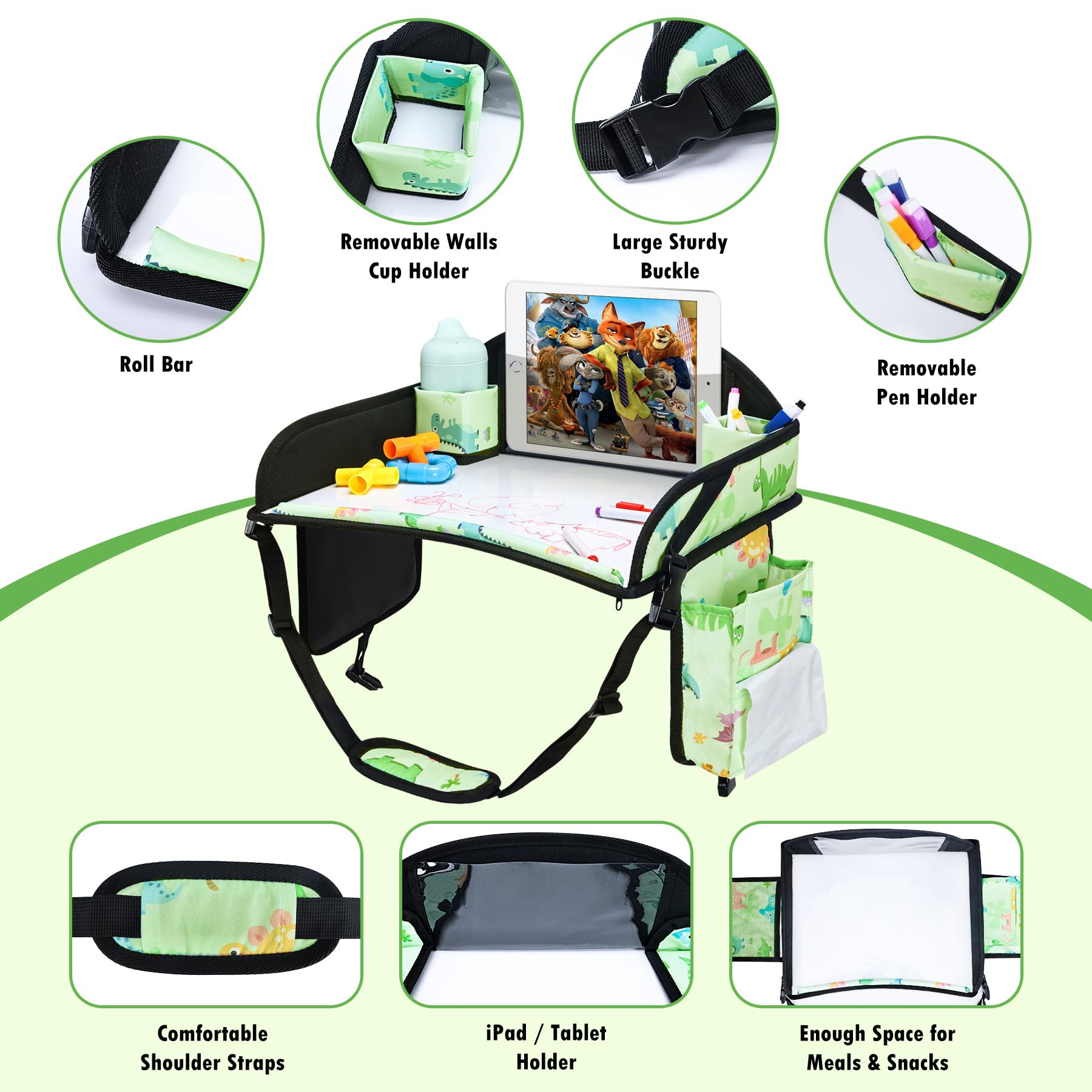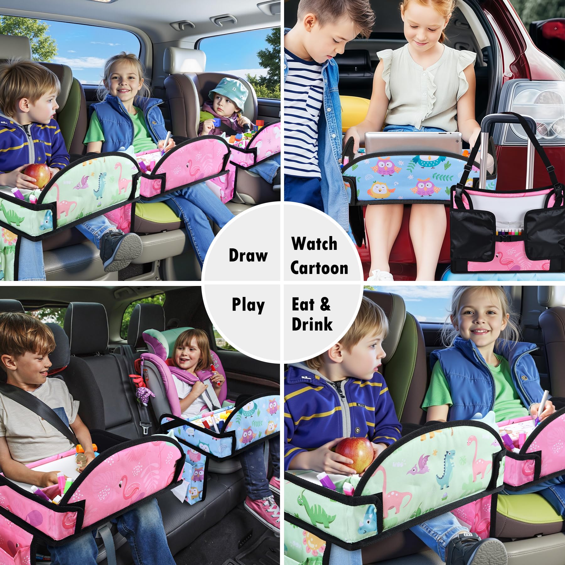 Easy to Clean: Made of five layers of material, the 600D Oxford material ensures a lightweight yet tough quality. Toddler car tray surface of the product adopts a wipeable panel, which means that any marks left by kids eating or drawing on it can be easily wiped away without having to worry about getting dirty and difficult to clean