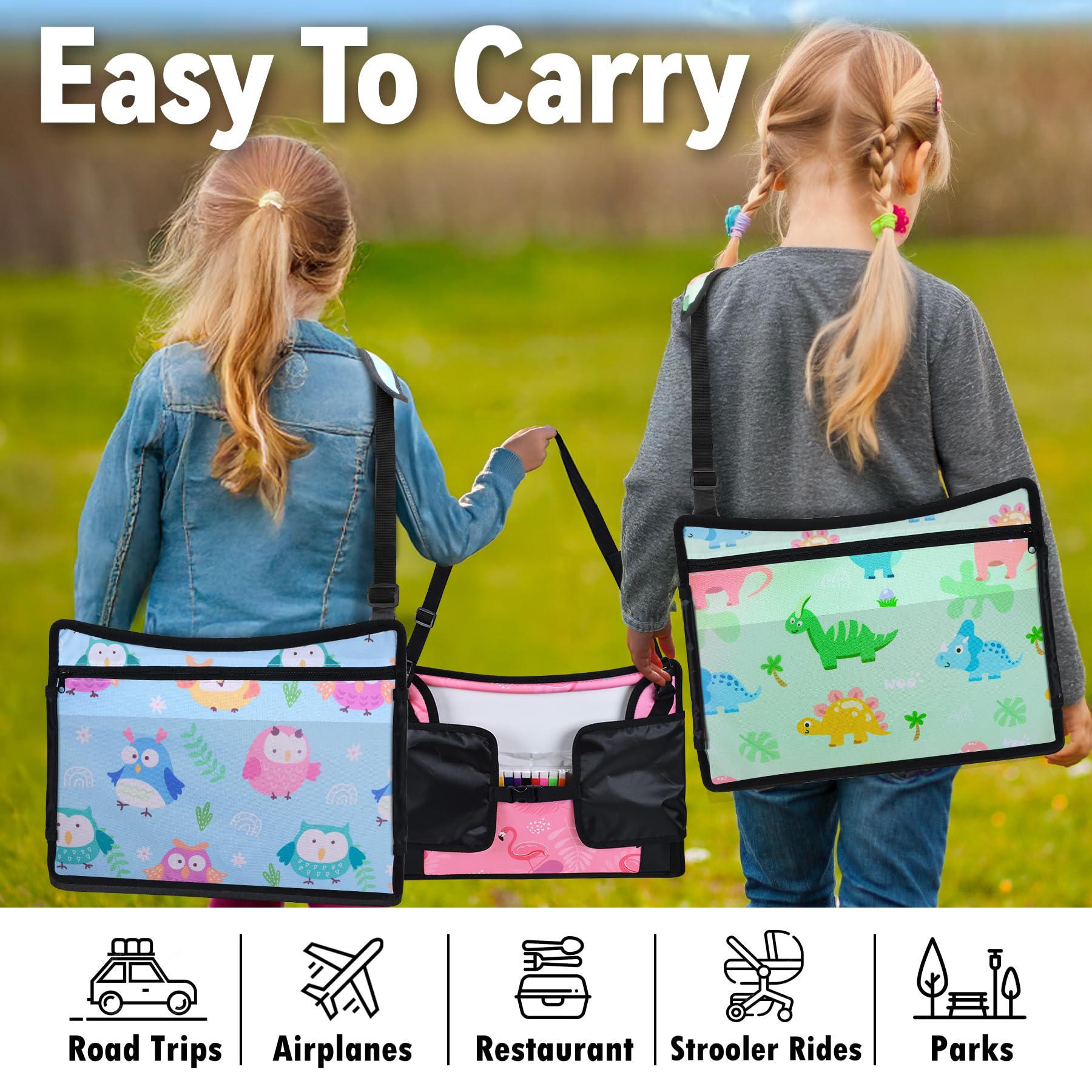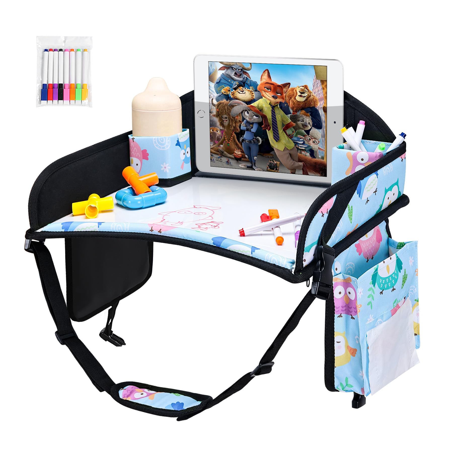 Multi-Function Travel Tray For Kids Car Seat: Multiple mesh storage pockets keep your child’s toys, snacks and water bottle organized and within reach. The dual-purpose adjustable strap secures toddler travel tray in place and be used as a convenient carrying strap for travel