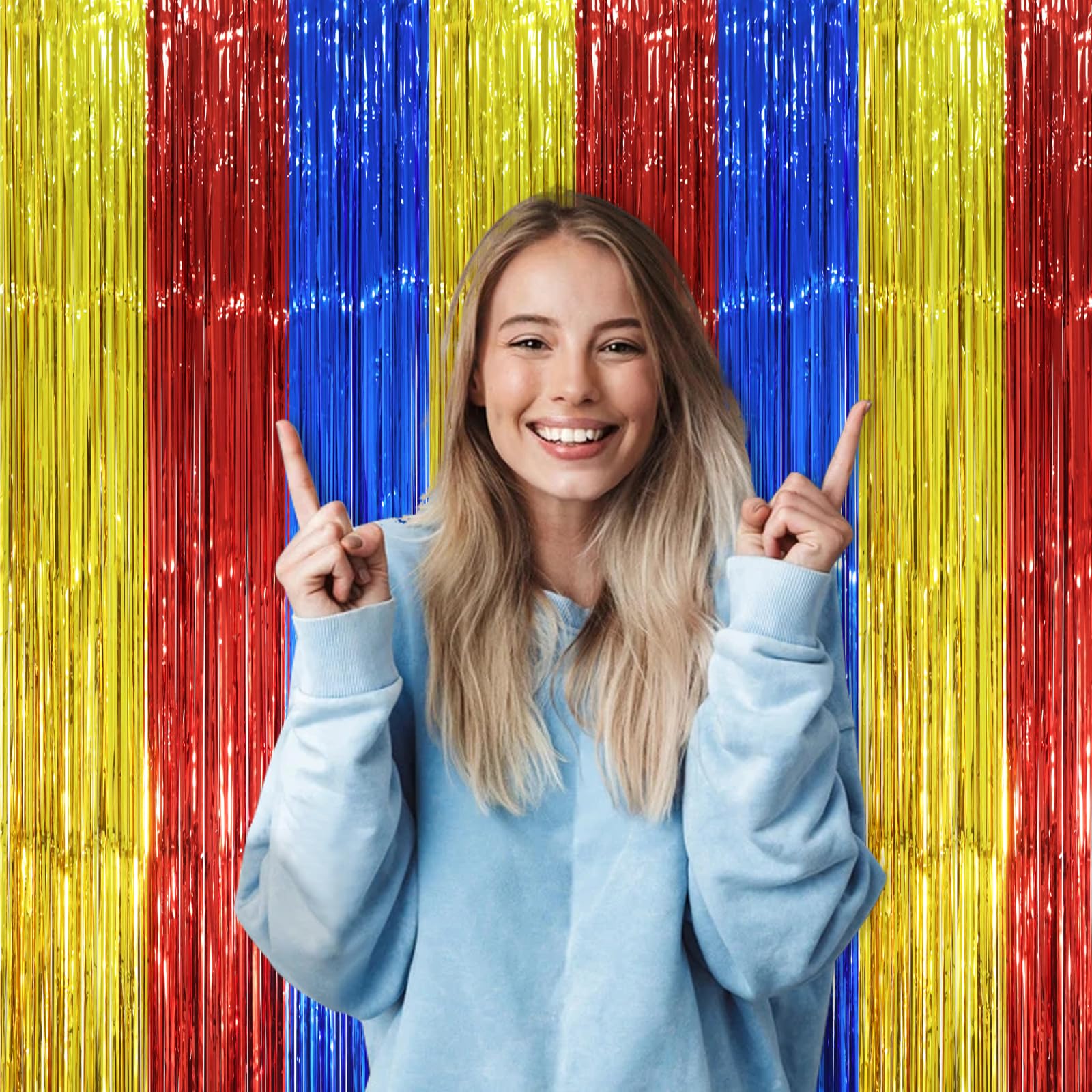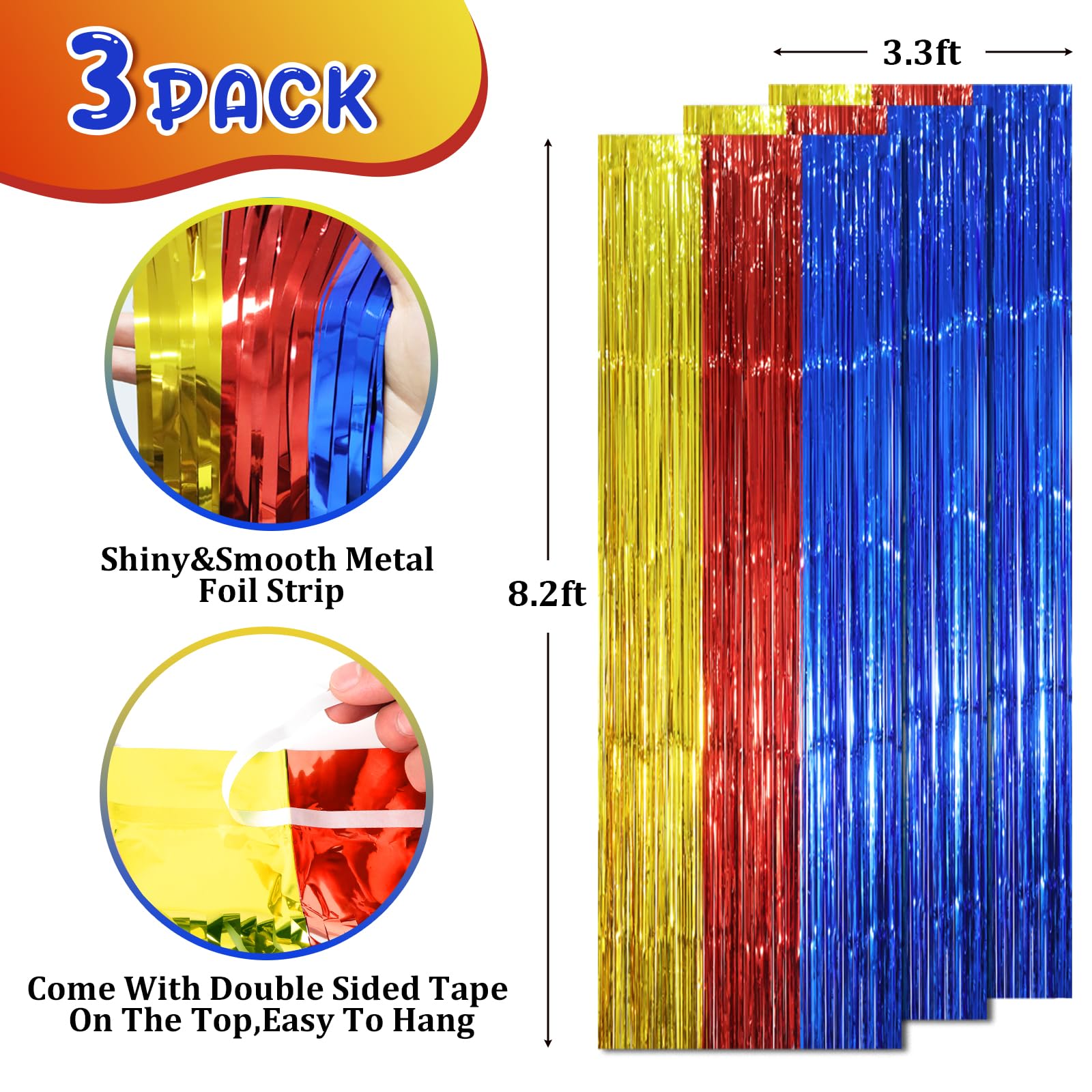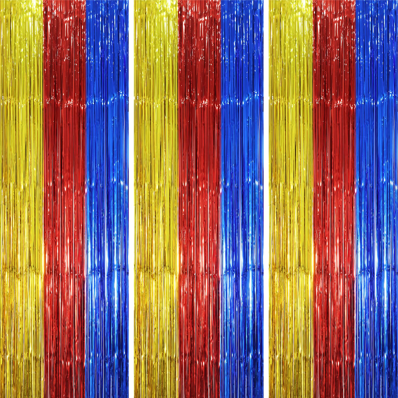Package Included: 3 packs of blue red and gold foil fringe curtains, the size of the foil curtain is 3.3*8.2ft. It's long enough to fit any occasion