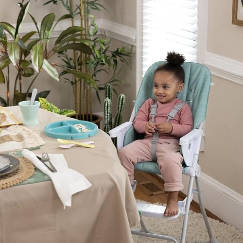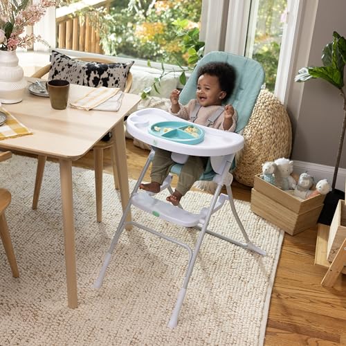 Save space in your home and give baby a superior mealtime experience with the Ingenuity Sun Valley Compact Folding High Chair in Teal. The lightweight, modern high chair features a compact design for easy storage and portability. This slender chair folds flat for storage, stands on its own when folded, and is the only high chair to offer a plate to promote baby's self-feeding skills. The unique 3-section Twist & Dine plate locks securely in place to prevent little ones from tossing it to the floor and is microwave safe for easy meal prep. As baby grows, the large tray adjusts to 3 positions. The tray attaches to the back of the chair when storing. Machine washable seat pad. 5-point harness keeps baby secure. The Ingenuity Sun Valley Compact Folding High Chair is part of the Sun Valley Collection. This baby high chair is for children ages 6 months to 3 years old or up to 33 pounds, whichever comes first. The assembled dimensions are 22.05'' (W) x 29.28'' (D) x 38.78'' (H). Third party safety tested and approved. A great gift for new parents, grandparents, and caregivers with space-saving functionality, yet super-cute baby must-haves!