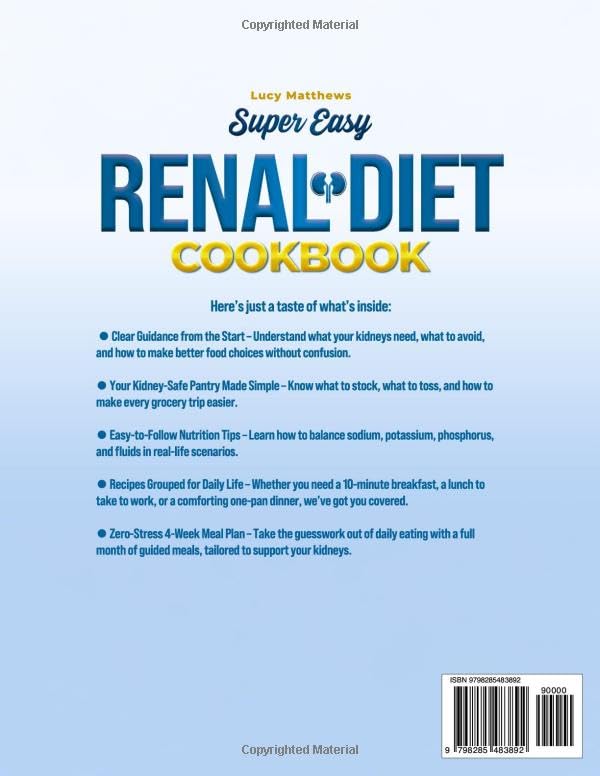 Have you or someone you love been told to follow a low-sodium, low-potassium, or kidney-friendly diet? Are you overwhelmed trying to figure out what’s actually safe to eat—and what could make things worse? Do you wish there were a practical, no-nonsense cookbook designed for everyday people—not chefs or nutritionists? Super Easy Renal Diet Cookbook is your reassuring kitchen companion, written specifically for people who want simple, safe, and satisfying meals without second-guessing every ingredient. Packed with smart tips, flavorful recipes, and a four-week meal plan, this guide makes kidney-friendly living not just doable—but enjoyable. Here’s just a taste of what’s inside: 🔹 Clear Guidance from the Start – Understand what your kidneys need, what to avoid, and how to make better food choices without confusion. 🔹 Your Kidney-Safe Pantry Made Simple – Know what to stock, what to toss, and how to make every grocery trip easier. 🔹 Easy-to-Follow Nutrition Tips – Learn how to balance sodium, potassium, phosphorus, and fluids in real-life scenarios. 🔹 Recipes Grouped for Daily Life – Whether you need a 10-minute breakfast, a lunch to take to work, or a comforting one-pan dinner, we’ve got you covered. 🔹 Zero-Stress 4-Week Meal Plan – Take the guesswork out of daily eating with a full month of guided meals, tailored to support your kidneys. 🎁Exclusive Bonus Inside Hand Picked Renal Diet Smoothies Selection No more standing in the kitchen, confused and frustrated. No more bland meals that leave you hungry or scared. Whether you're newly diagnosed or managing CKD long-term, this book will help you: ✔️ Eat with confidence again ✔️ Regain control over your health ✔️ Avoid overwhelm at the grocery store ✔️ Enjoy meals that are both kidney-safe and satisfying Real people. Real food. Real relief. This isn’t just a cookbook—it’s a roadmap back to normalcy. A way to support your health without sacrificing your lifestyle. And a compassionate guide written with you in mind. Are you ready to cook with confidence—and peace of mind? Scroll up and grab your copy today!