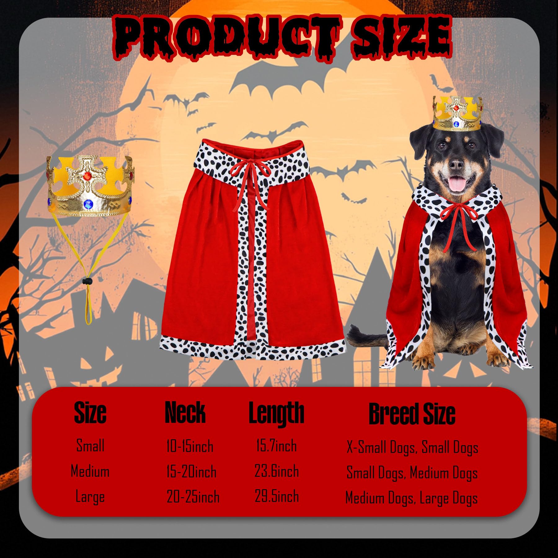 Multi Sizes: The Halloween dog costumes are designed in small, medium and large sizes. The small size is suitable for pet neck size 10”-15”, recommended for small dogs. The medium size is suitable for pet neck size 15”-20”, recommended for medium dogs. The large size is suitable for pet neck size 20”-25”, recommended for large dogs.