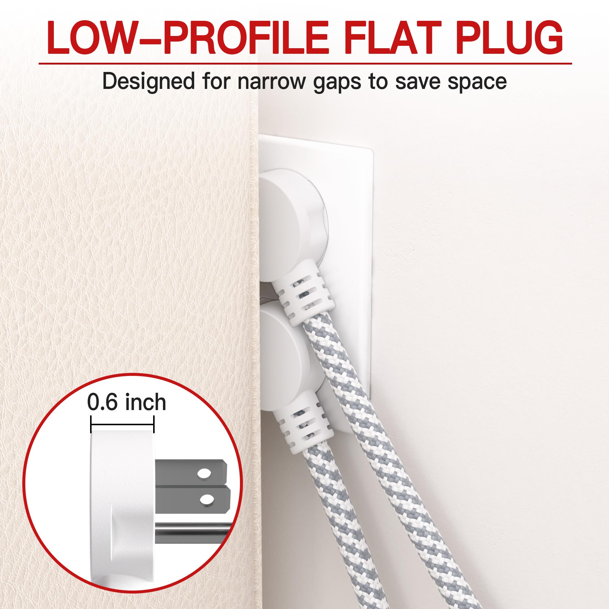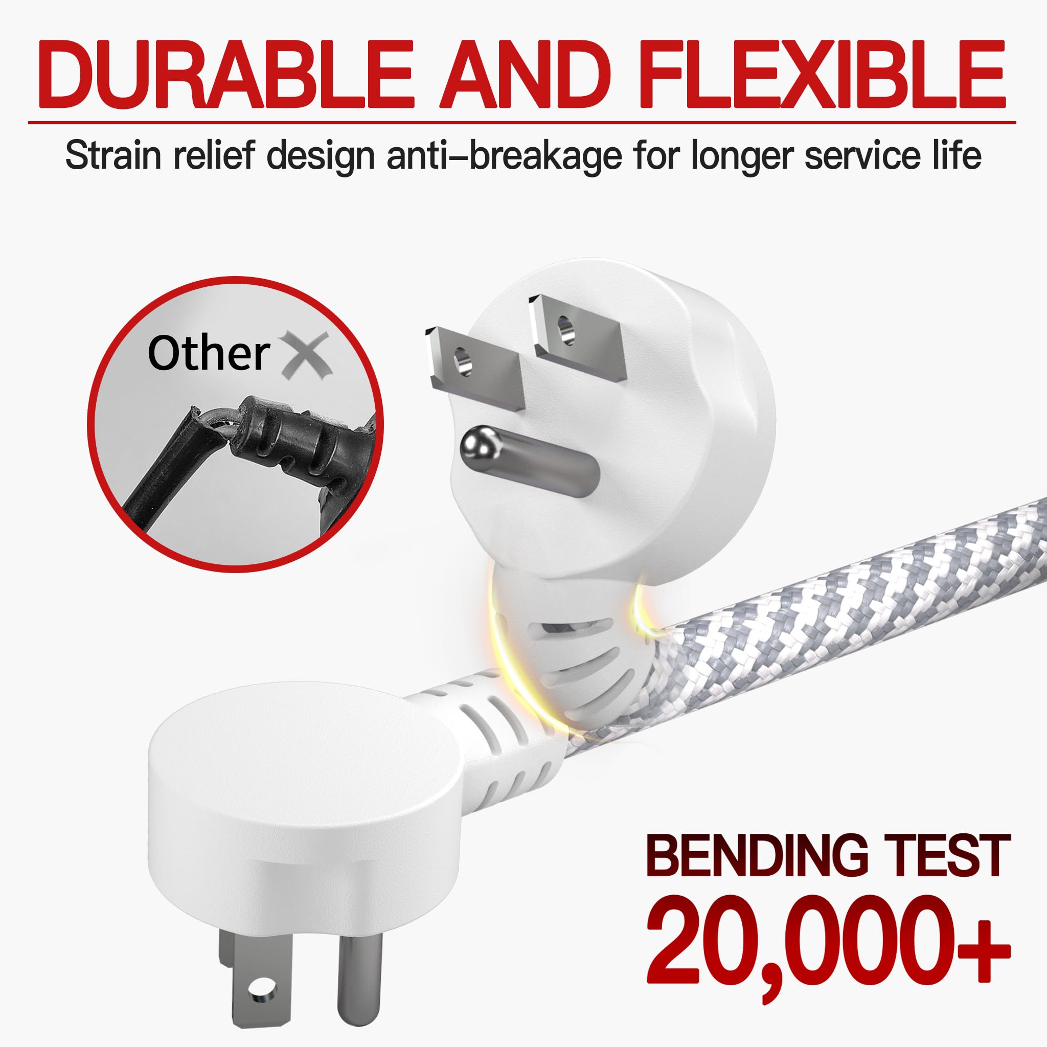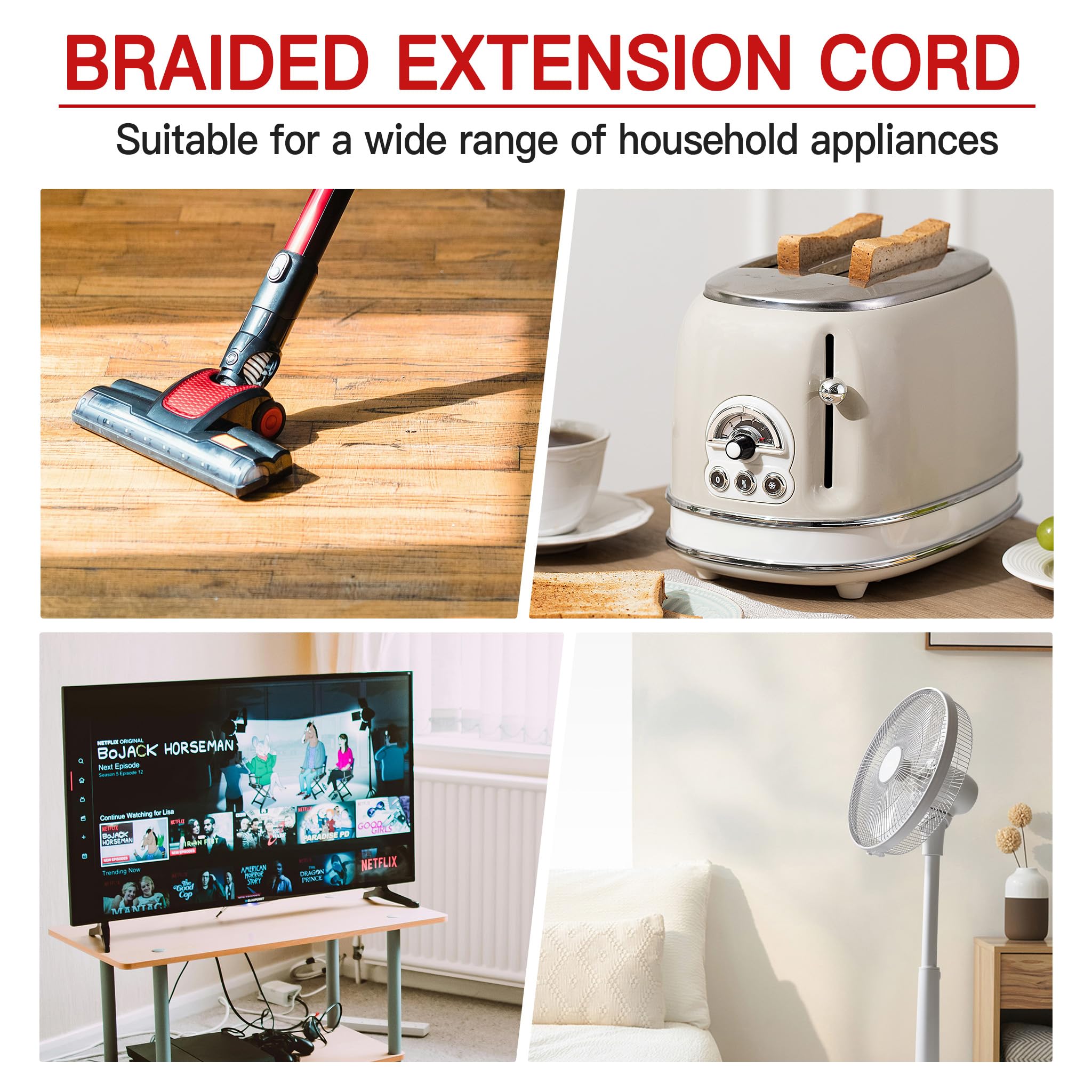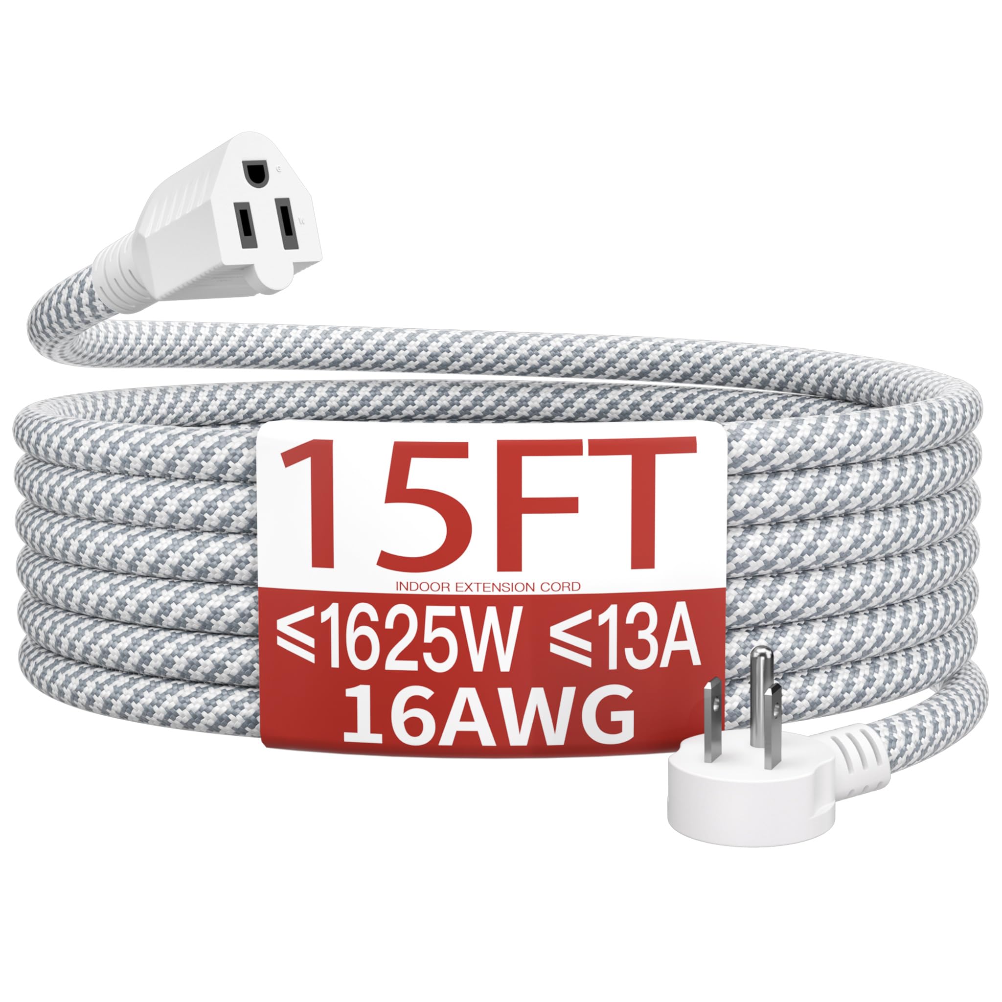 Flexible & Tangle Resistant: Braided flat plug 15ft extension cord Plug and socket are designed with long strain relief at the end; Braided flat plug extension cord 15ft pass 20,000 large-angle bends without breaking prolonging service life; Small extension cord provides flexible mobility for small appliances and sockets after use it can be easily stored to avoid clutter