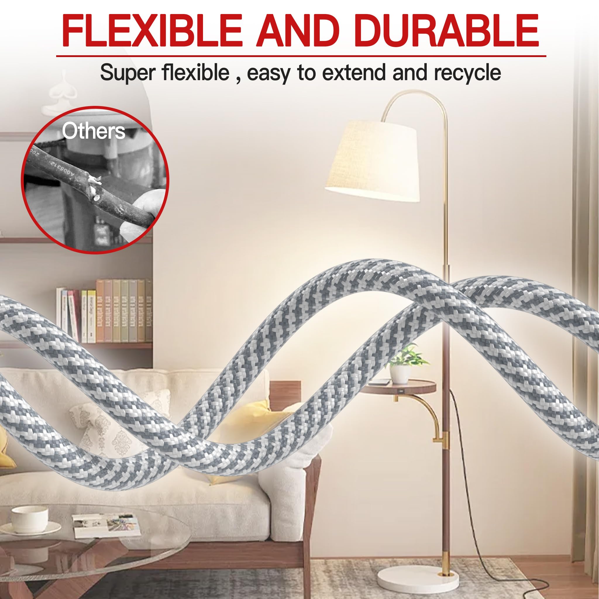 Versatile Indoor Use: Indoor extension cord 15ft are ideal for home offices, living rooms, bedrooms and studios; Braided extension cord safely power lamps, computers, printers and small appliances; Short flat plug extension cord 15 foot should be kept away from moisture, high temperatures, and direct sunlight